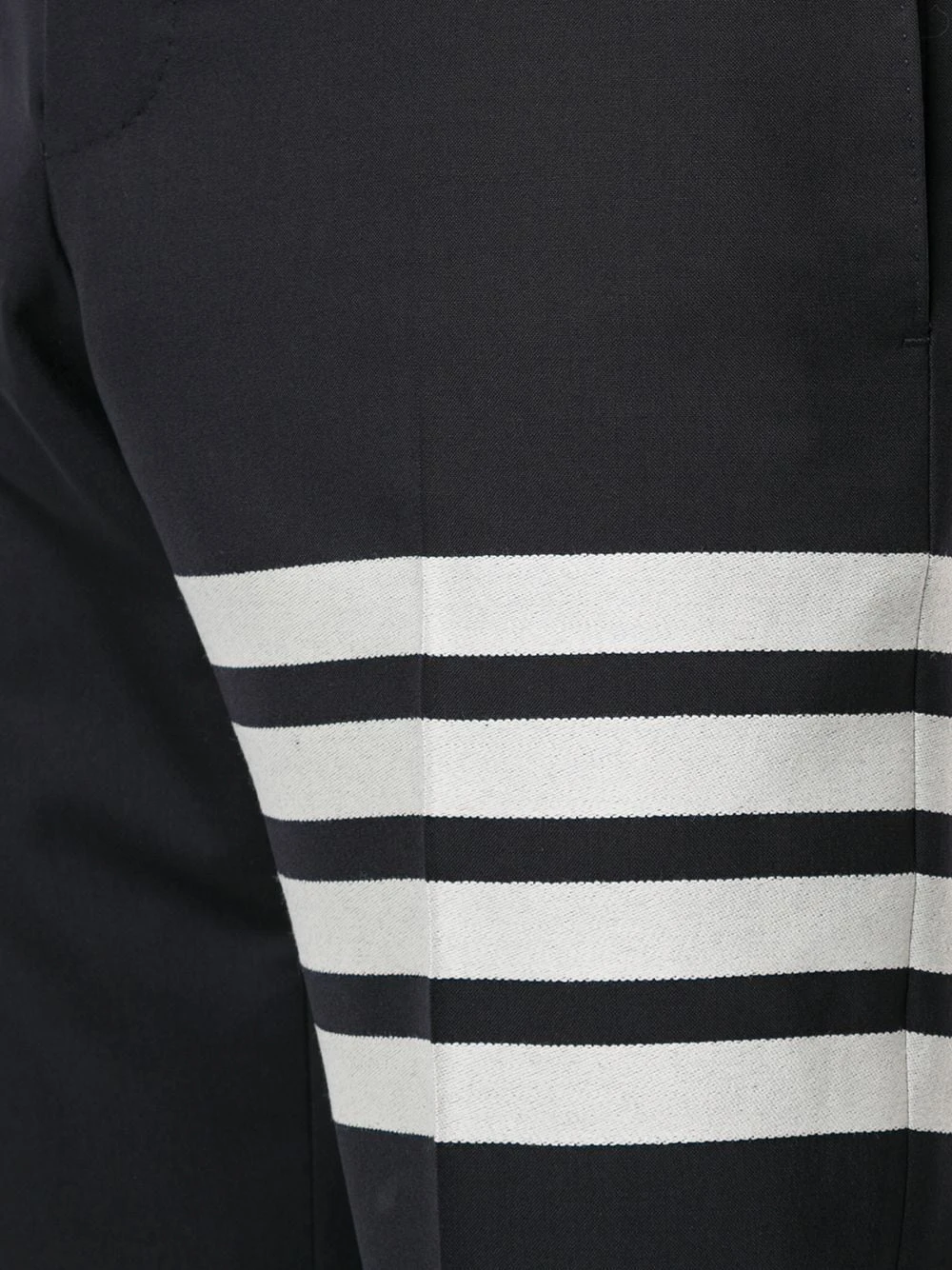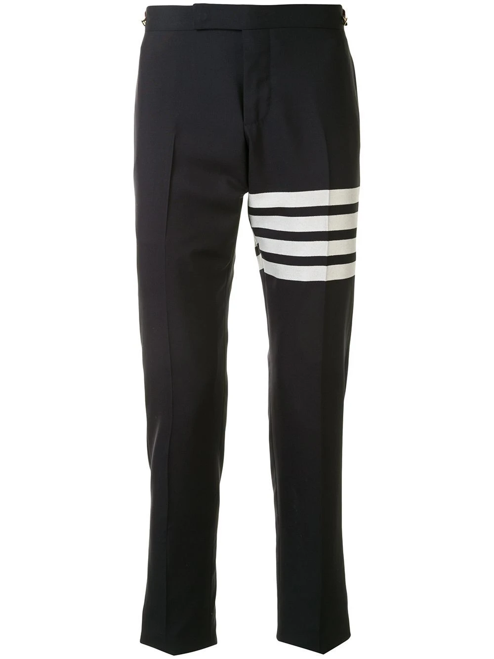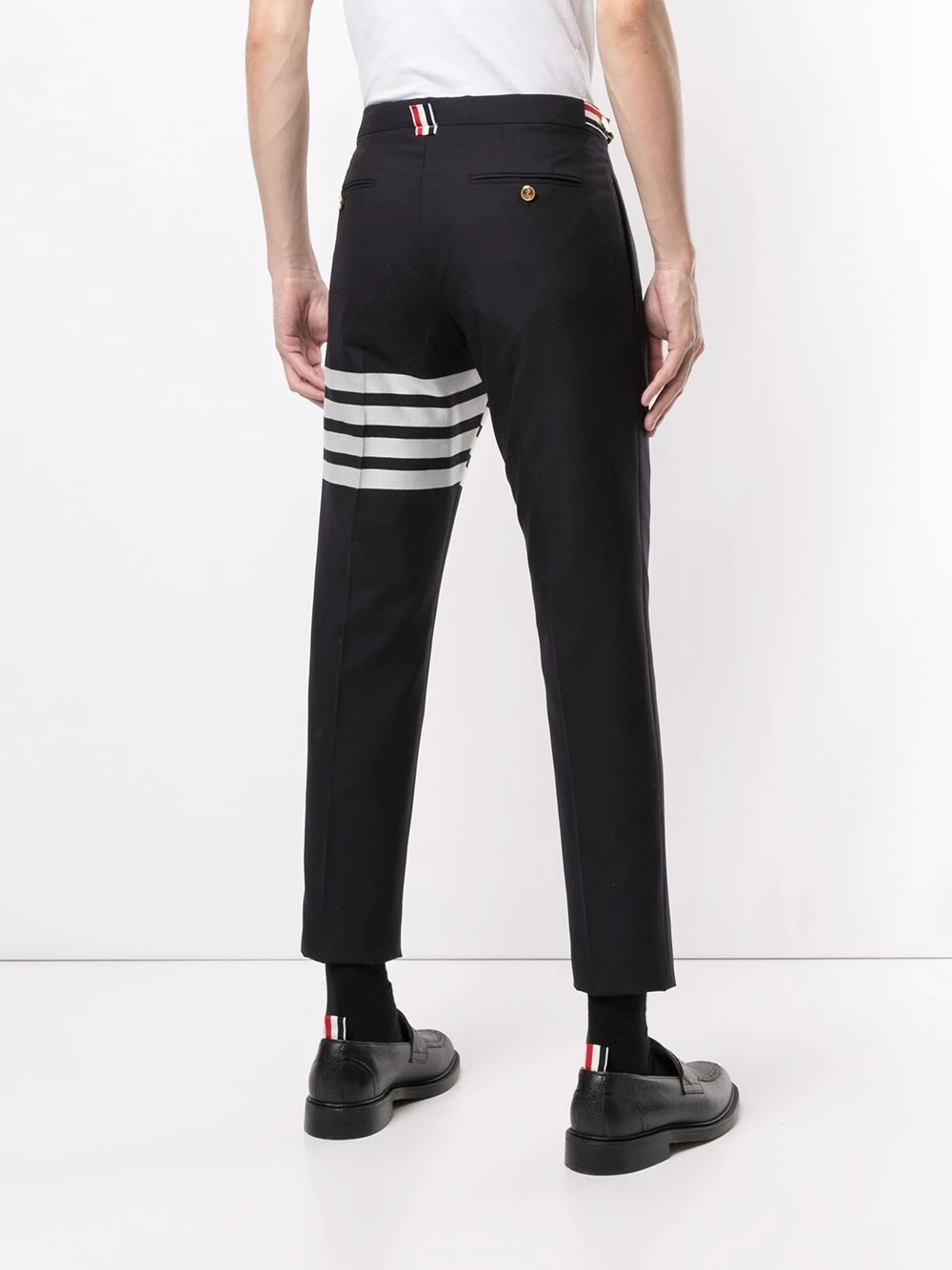 Dark blue 4-Bar cropped trousers from THOM BROWNE featuring signature 4-Bar stripe, tailored cut, cropped leg, hook and zip fly fastening, embossed gold-tone buttons, two side slit pockets and two rear welt pockets.