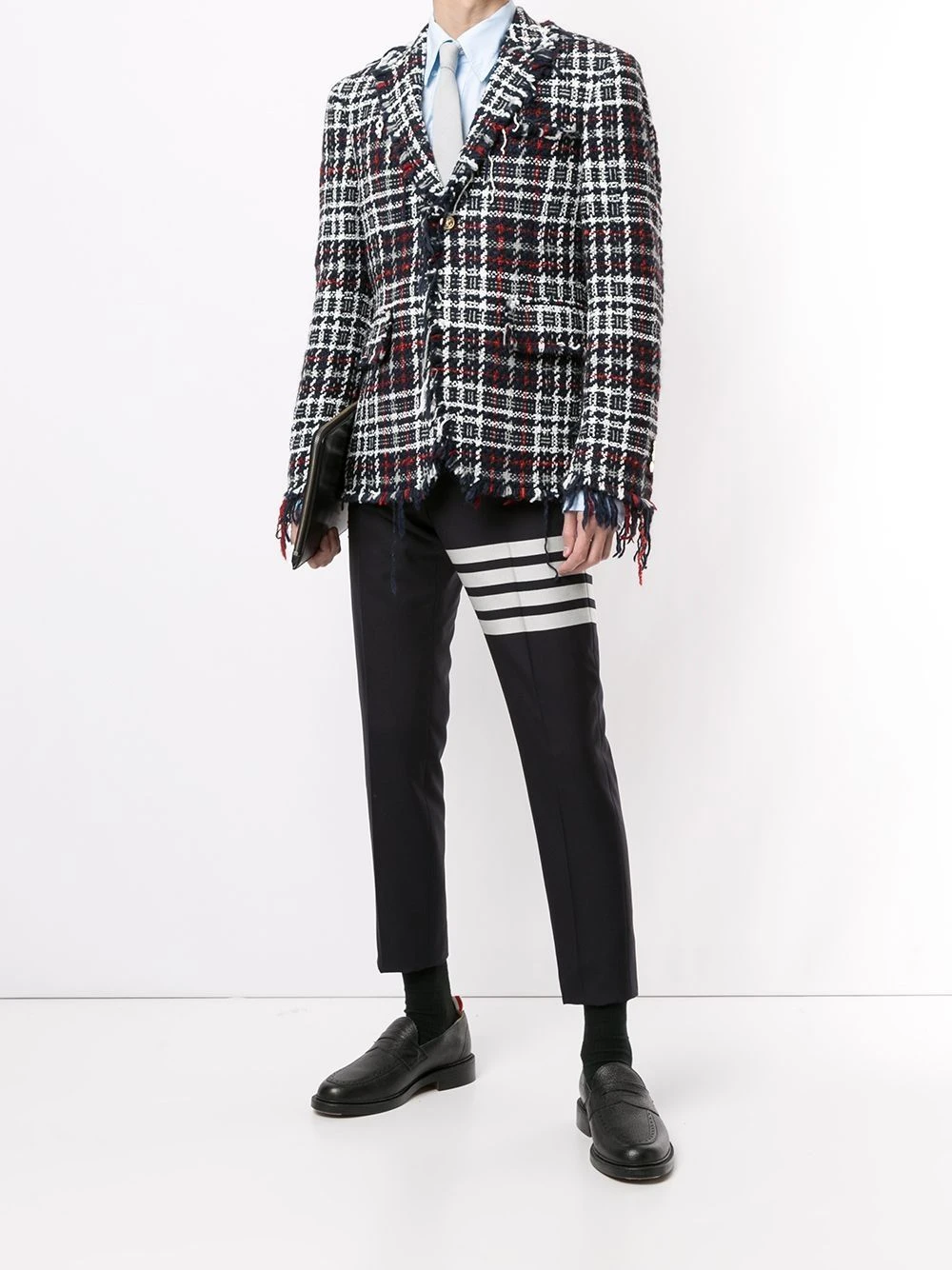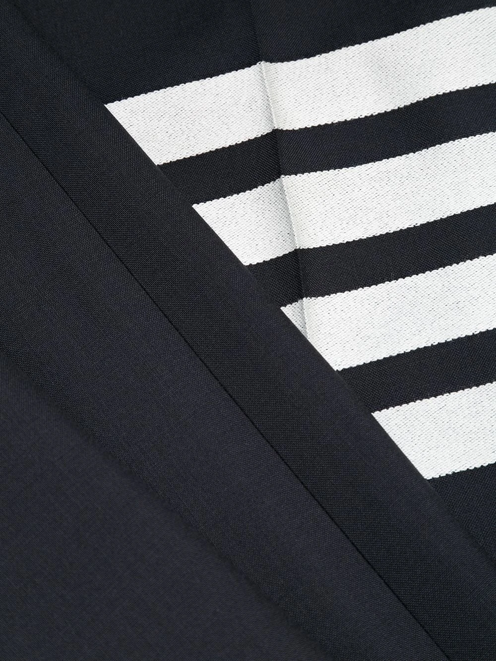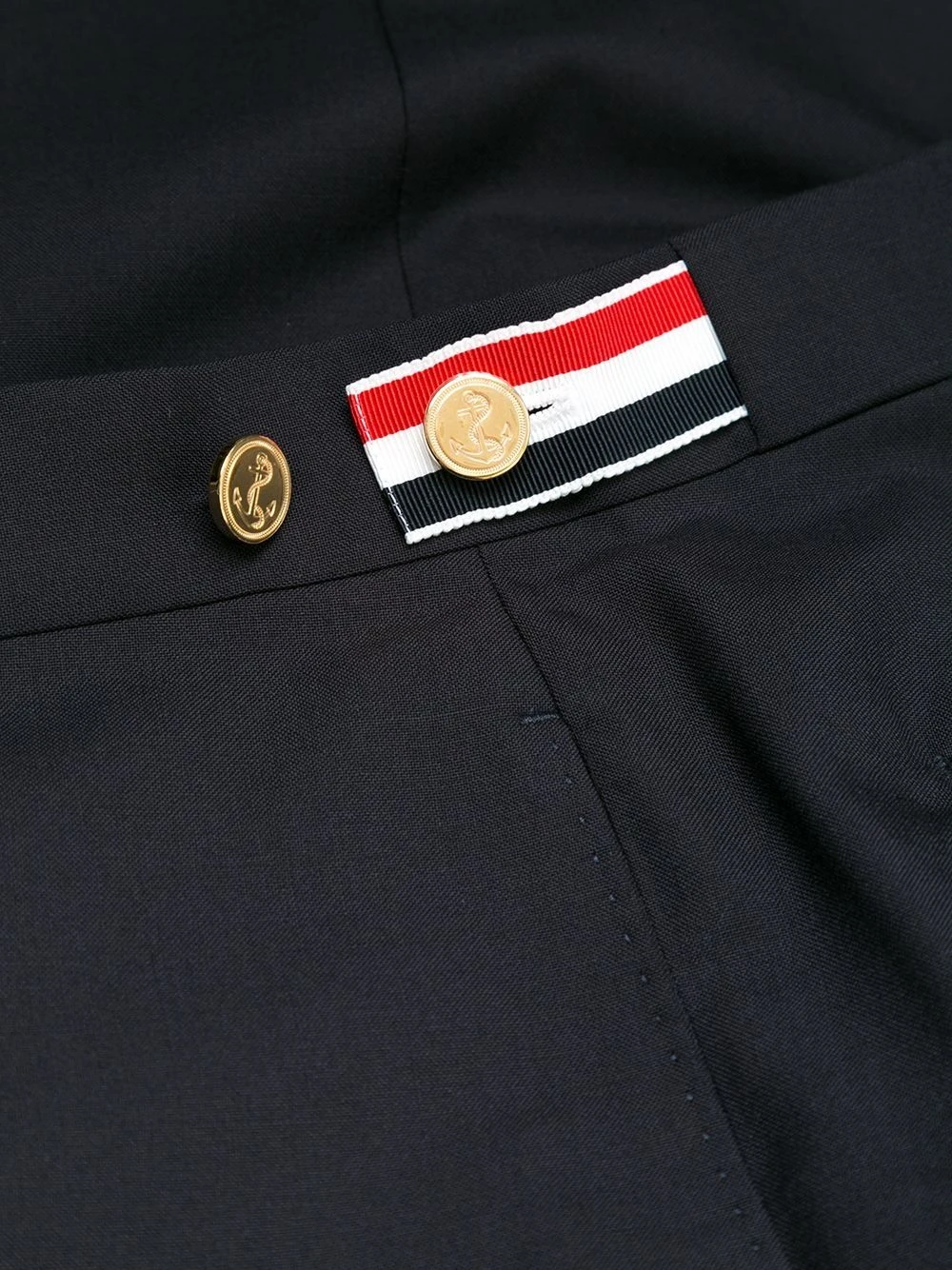 Dark blue 4-Bar cropped trousers from THOM BROWNE featuring signature 4-Bar stripe, tailored cut, cropped leg, hook and zip fly fastening, embossed gold-tone buttons, two side slit pockets and two rear welt pockets.