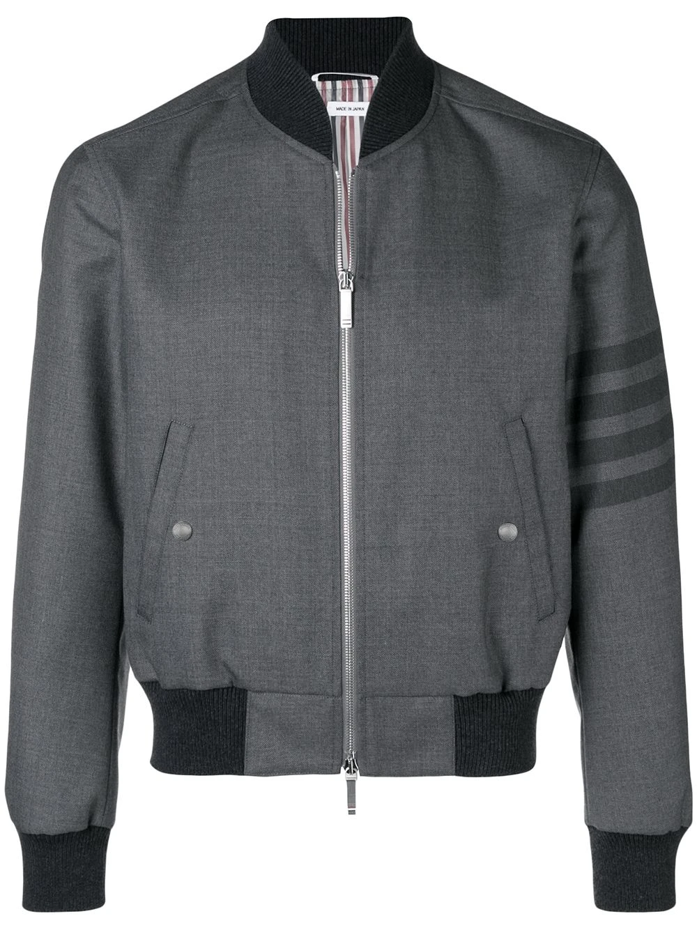 Grey wool 4-Bar Ribbed Knit Blouson Jacket from Thom Browne featuring a straight fit, a front zip fastening, a ribbed collar, a ribbed hem and cuffs, side pockets, a lining and four-bar stripes at the sleeve.