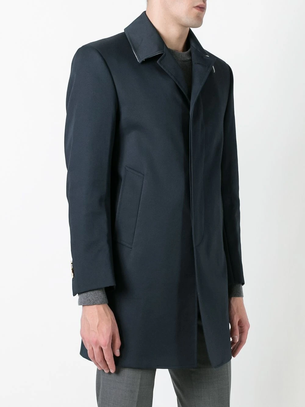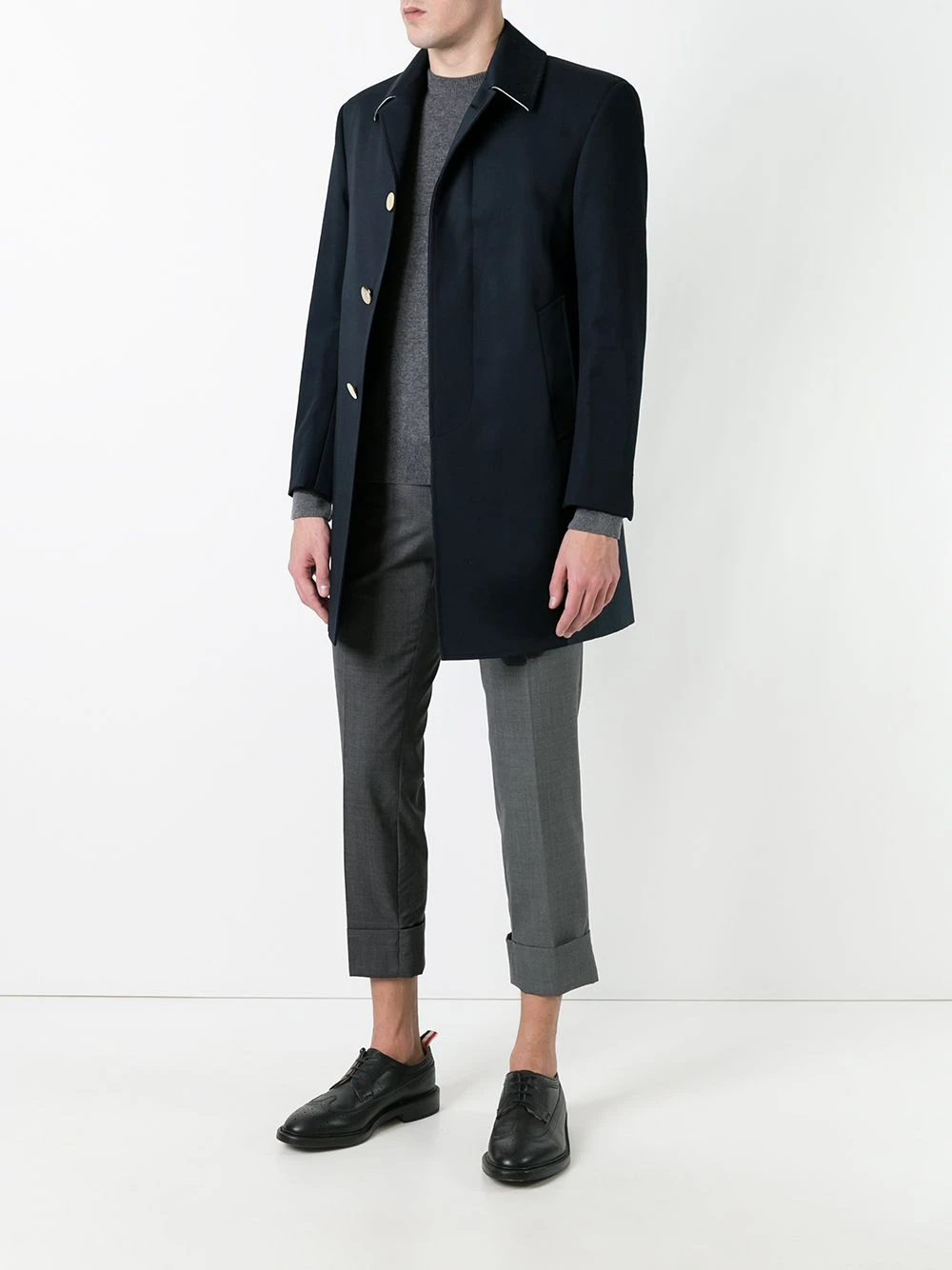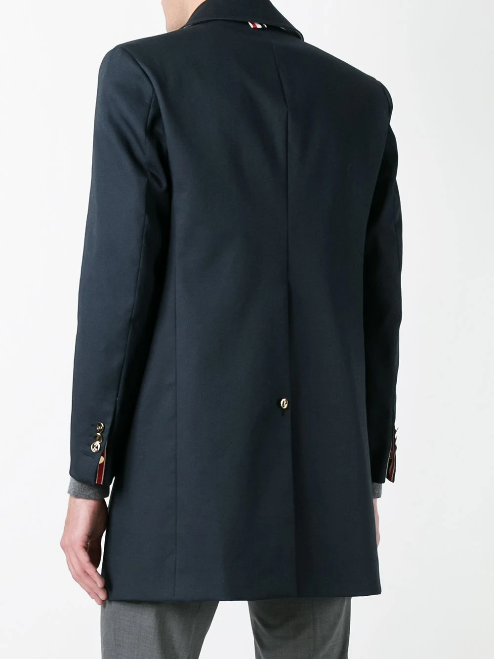 Navy blue cotton mac bal collar overcoat from THOM BROWNE featuring a classic collar, long sleeves and a button fastening. Please note the print may differ slightly from the item pictured.