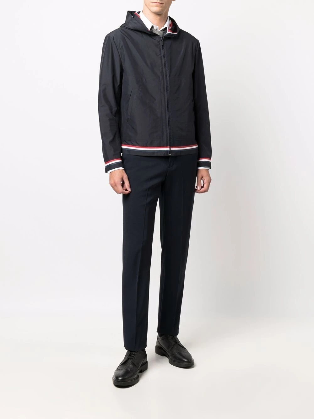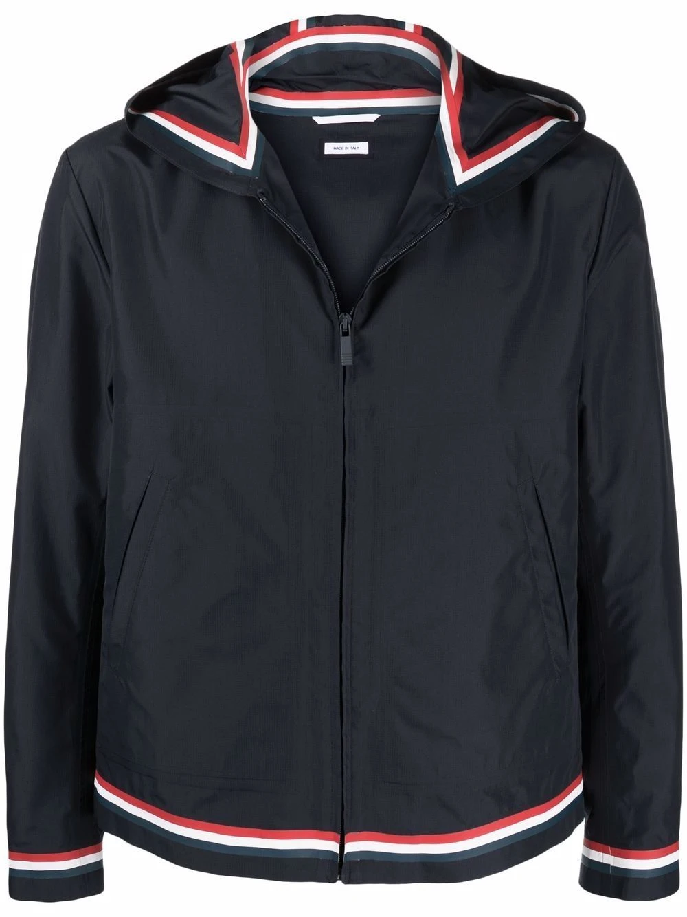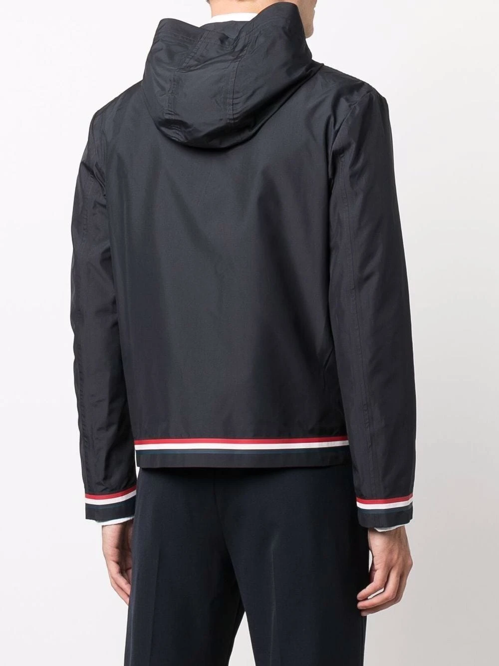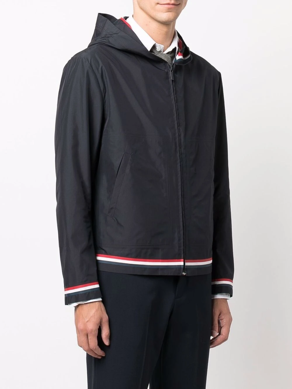 RWB-stripe hooded jacket from THOM BROWNE featuring navy blue, RWB stripe, classic hood, front zip fastening, long sleeves and two side slit pockets.