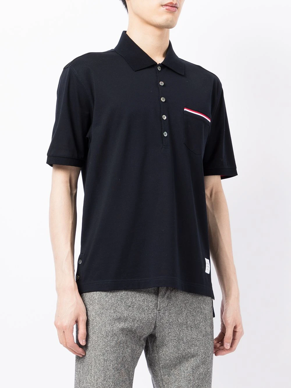 Thom Browne updates the classic polo shirt with signature details. This navy blue cotton piece has a chest patch pocket, trimmed with the brand’s iconic RWB stripe.