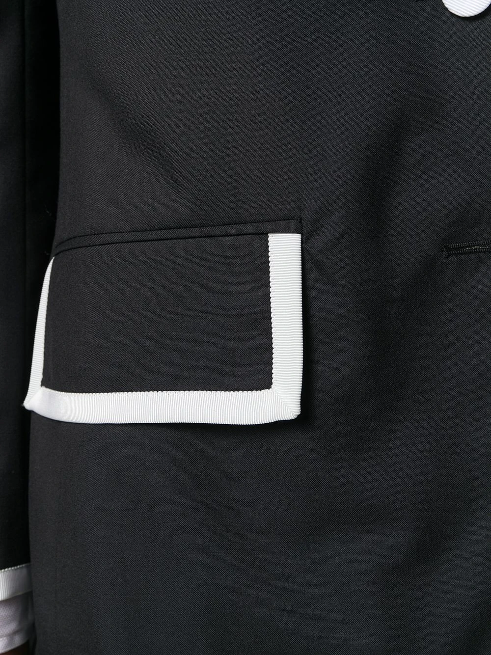 You can’t go wrong with a tailored black blazer. But when that blazer is from Thom Browne, you can go very, very right. ‘Blaze-r’ a style trail. Featuring notched lapels, a front button fastening, long sleeves, a chest pocket, front flap pockets, a double vent to the rear, a signature grosgrain loop tab, a contrasting trim and a RWB stripe.