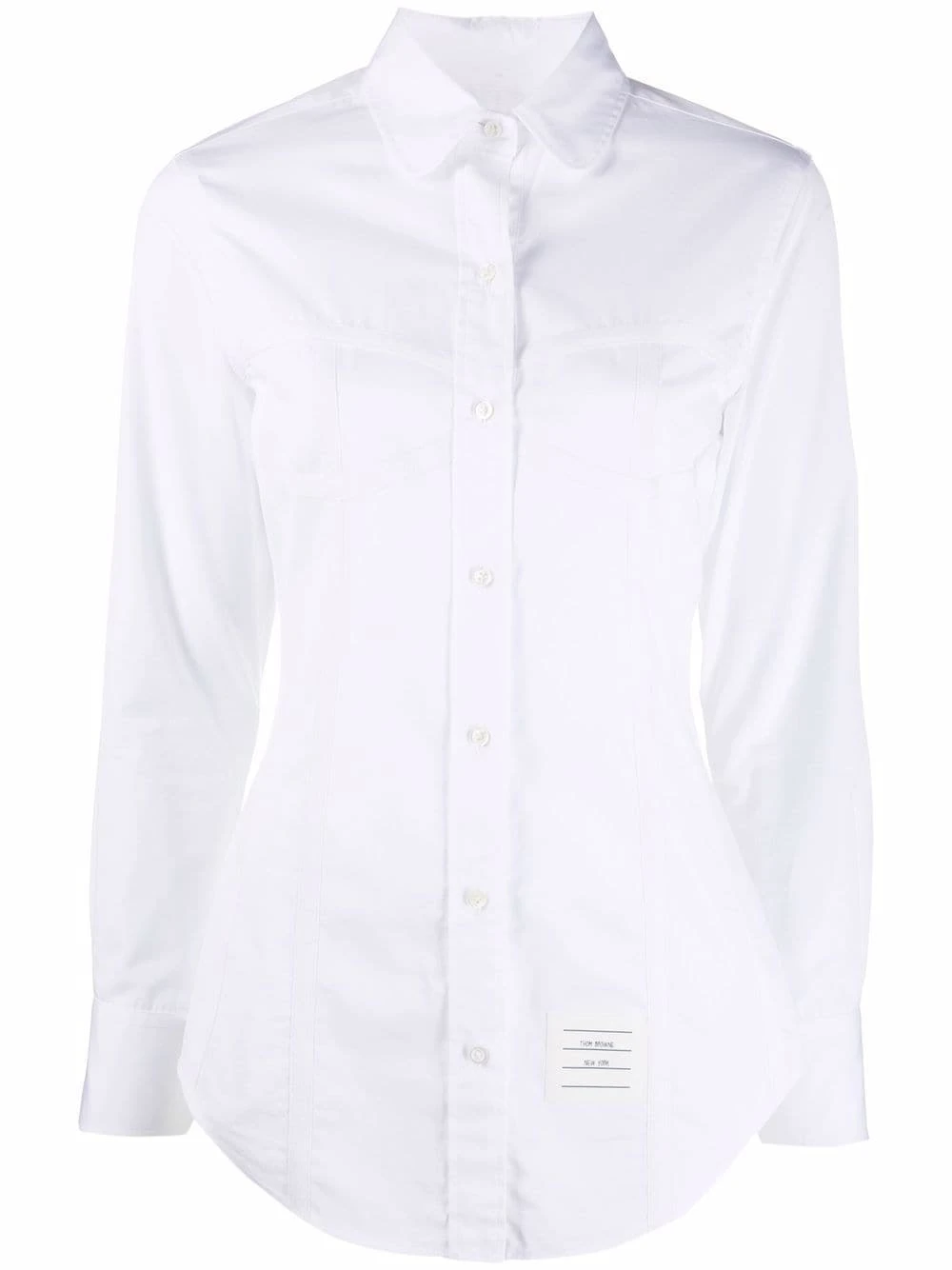 Preppy style meets the playful energy of Thom Browne. Made from white cotton, this button-up shirt is reimagined with a corset detail and a logo patch on the front.