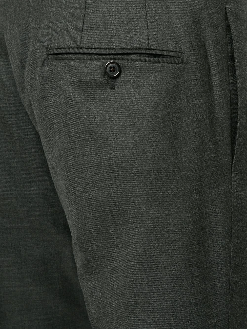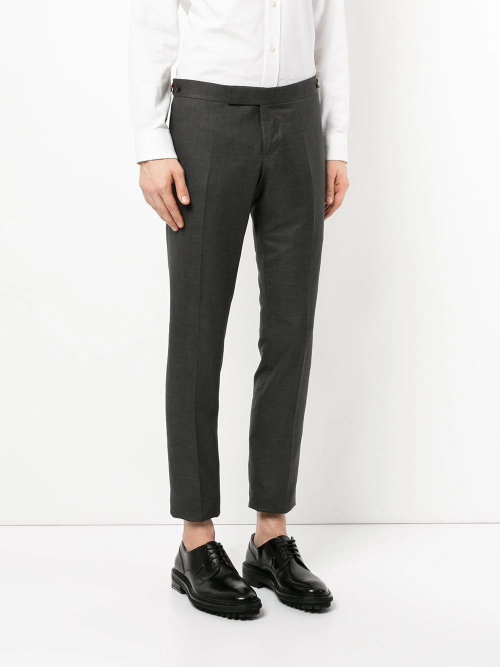 Acclaimed for his subtly deconstructed tailoring, Browne incorporates traditional craftsmanship techniques to modern transformations in menβs formalwear. Crafted in Italy from dark grey wool, these tailored trousers feature a waistband, a hook and zip fly, a side button fastening, a tapered leg, a cropped length, buttoned rear welt pockets, a red, white and blue grosgrain tab and signature striped detailing.