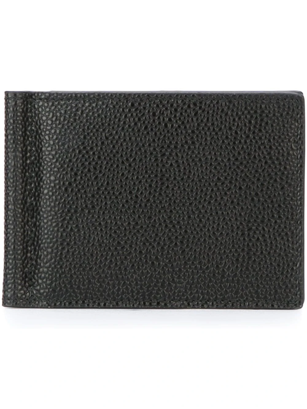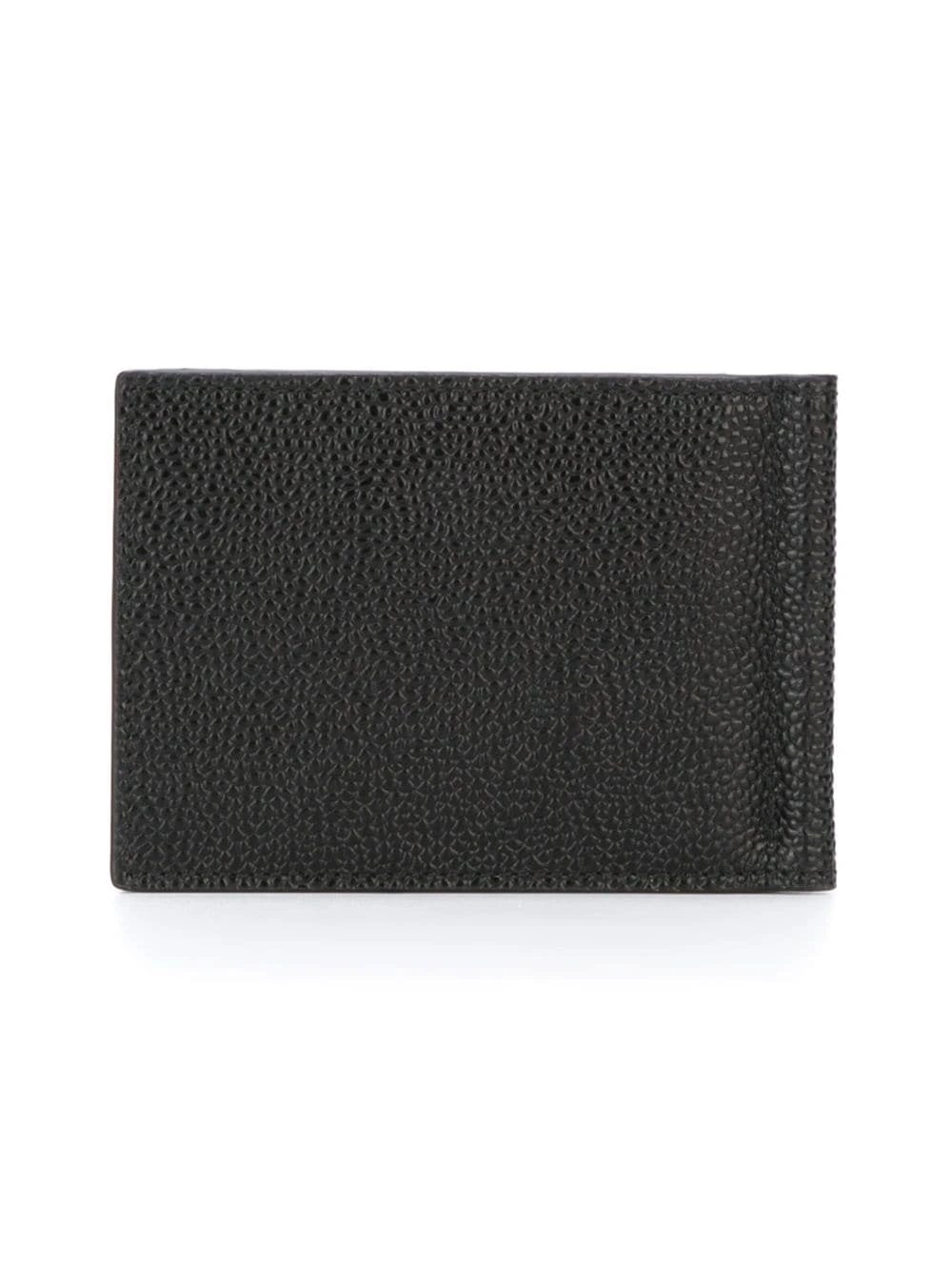 Black leather Money Clip Wallet In Black Pebble Grain from Thom Browne featuring a pebbled leather texture, multiple interior card slots, a note compartment and an internal logo stamp.