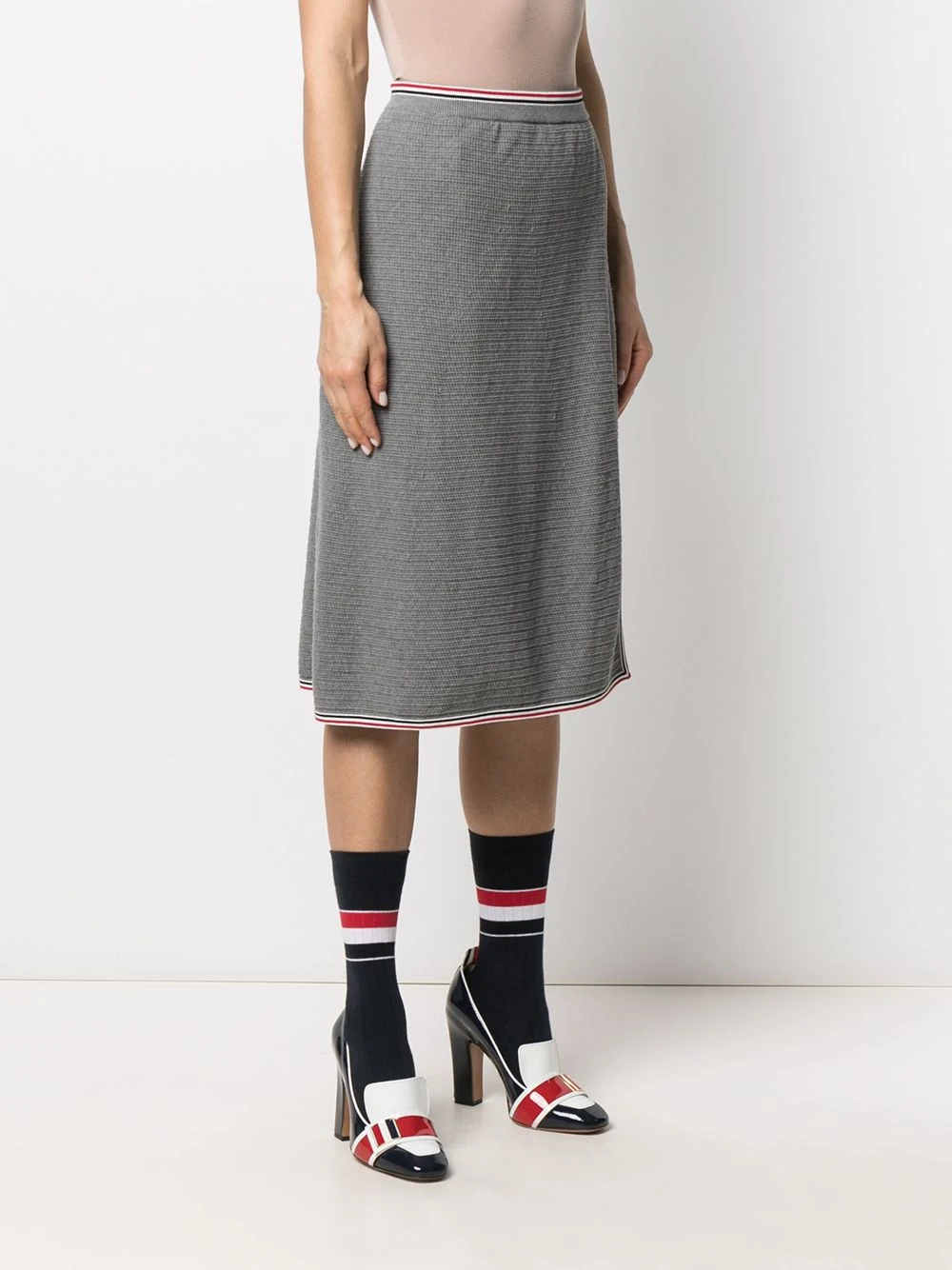 You’re in line for impeccible style. Thom Browne’s high waisted skirt design helps you get there, with brand defining elements such as the RWB stripe trim and the grosgrain loop tab to the rear. It’ll soon be your signature piece.