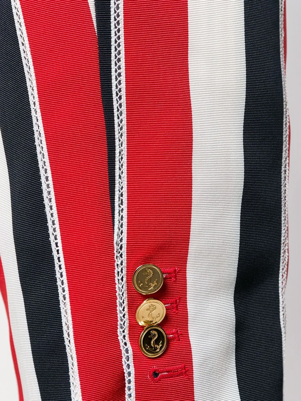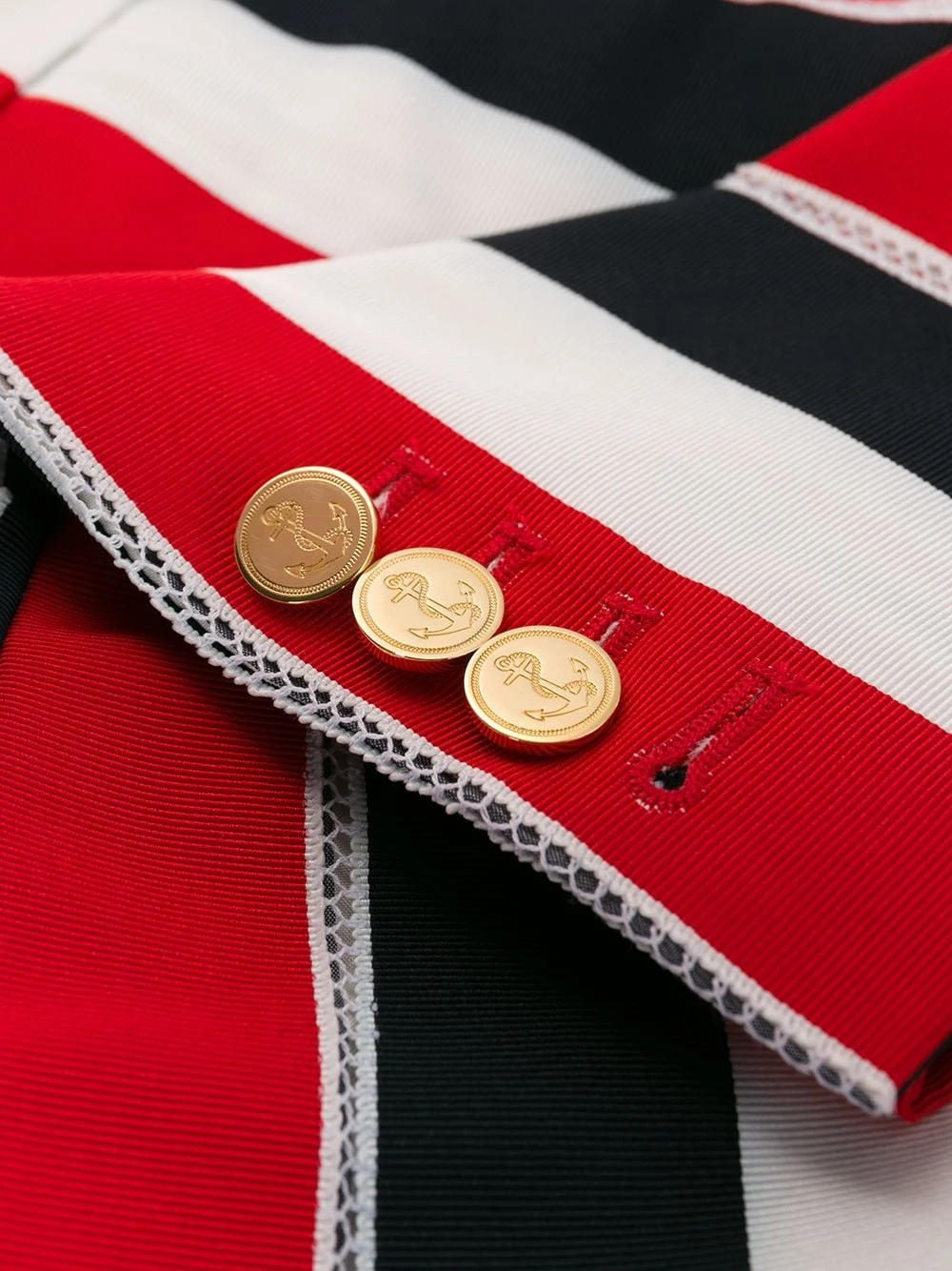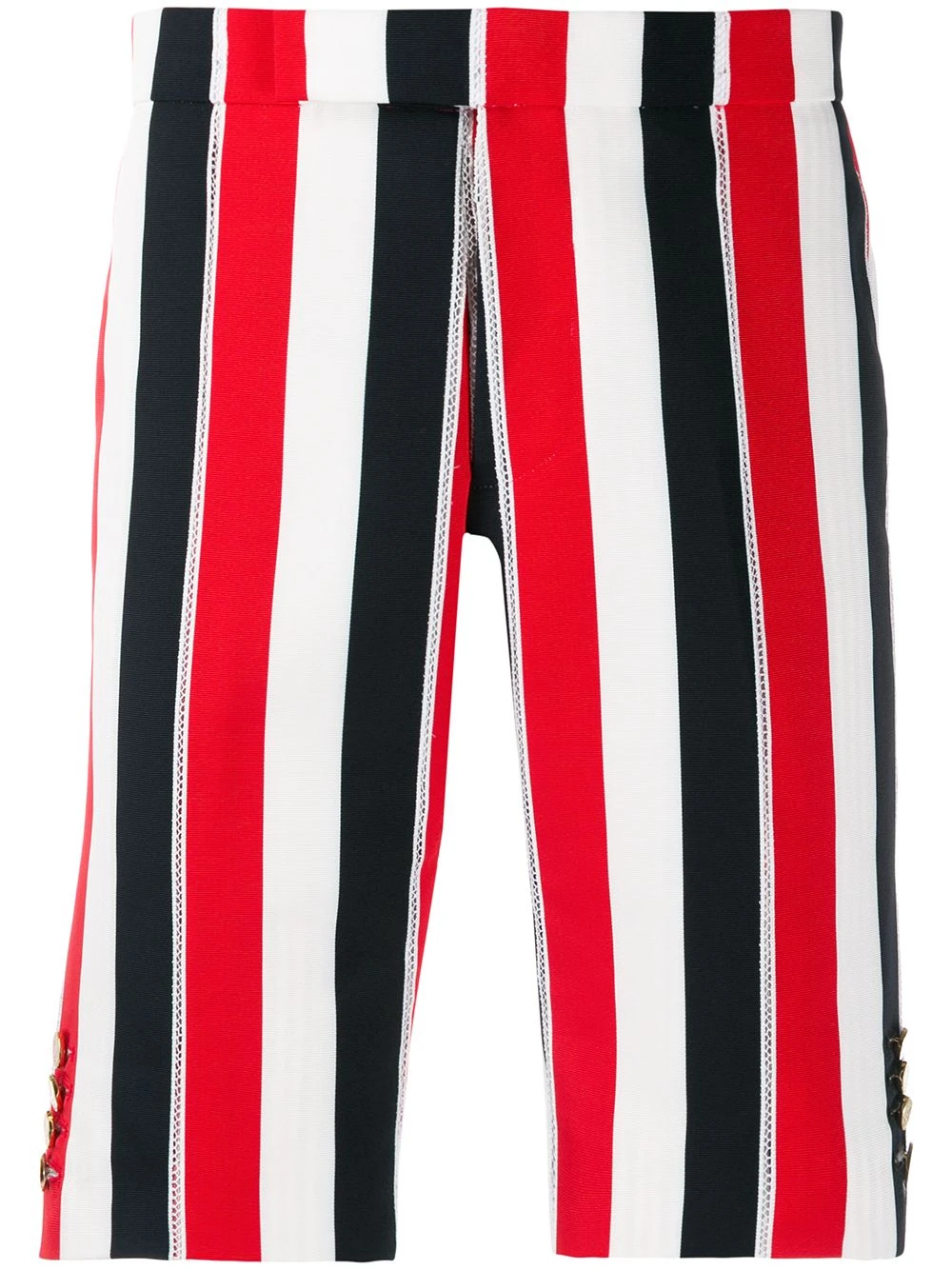 Thom Brownβs expertise in technical, tailored and luxuriously fabricated aesthetic is clearly evident in these slim-fit shorts from the designerβs latest edit. Cut with a straight leg and mid-rise waist, the pair fastens with a hook and eye, while the striped pattern takes on the colourway of the signature tri-colour pattern.