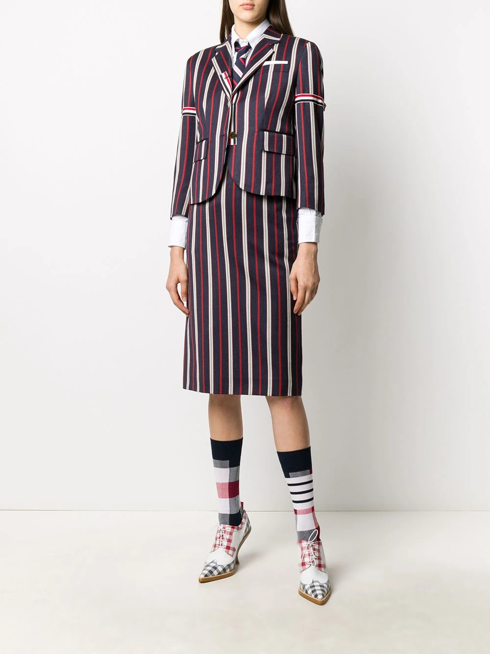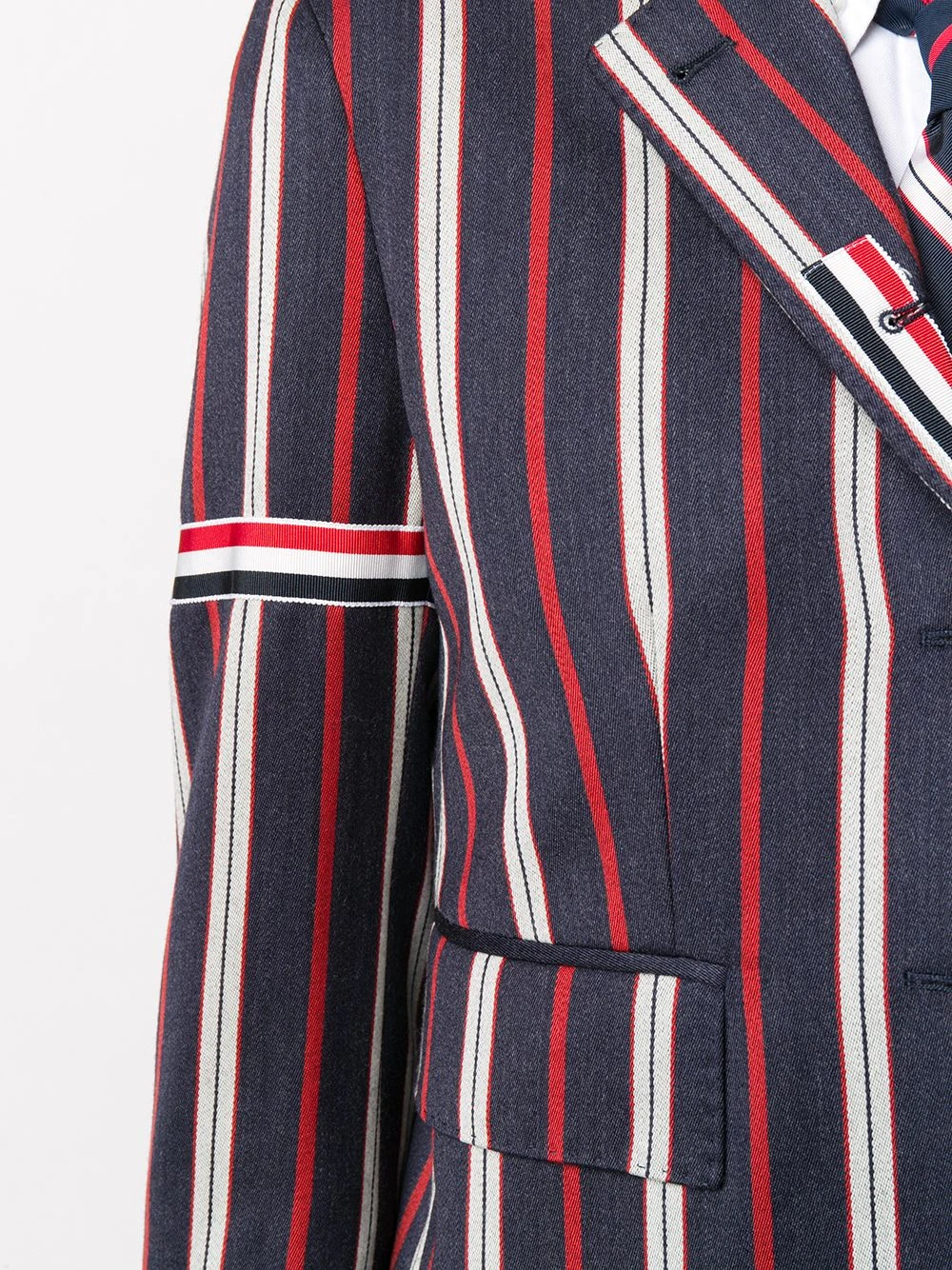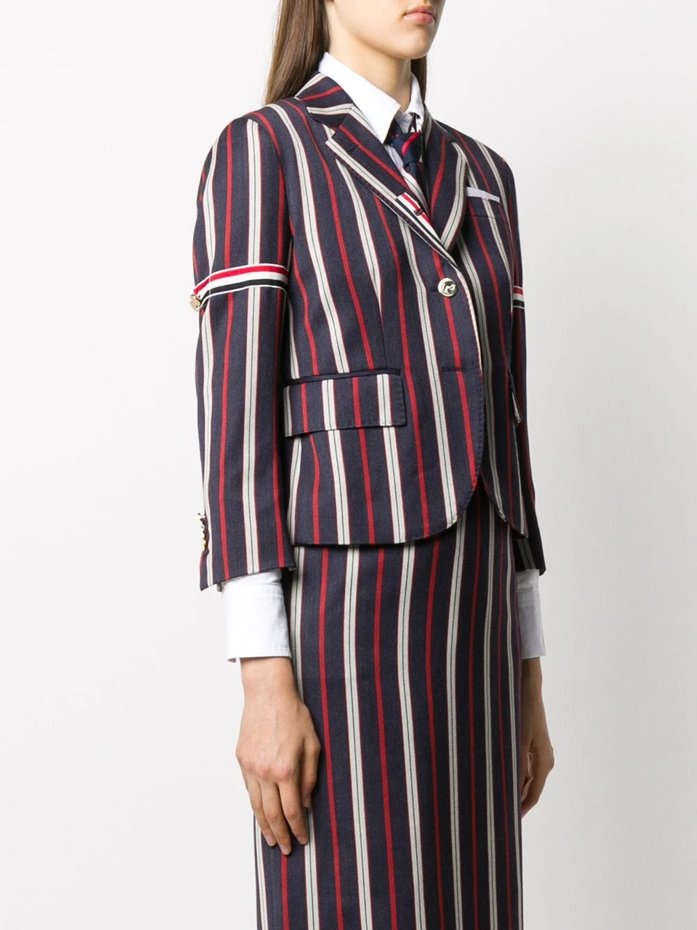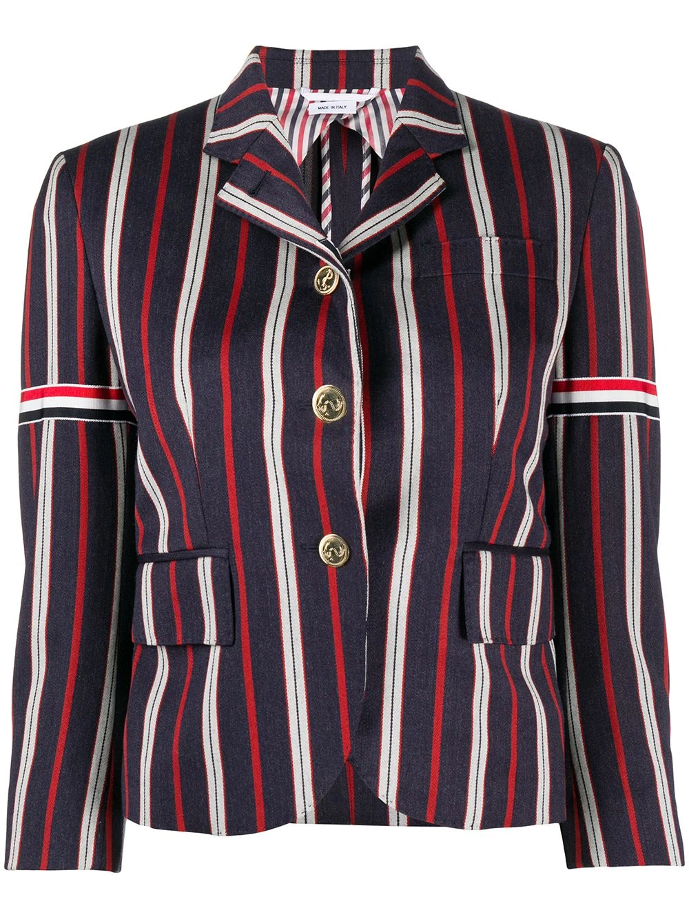 Reignite your love for officewear β Thom Browne shows you how. Cut in a slim but non-restrictive fit, this striped blazer is your secret gate to a world where comfort and elegance go hand in hand. Mondays never looked so good.
