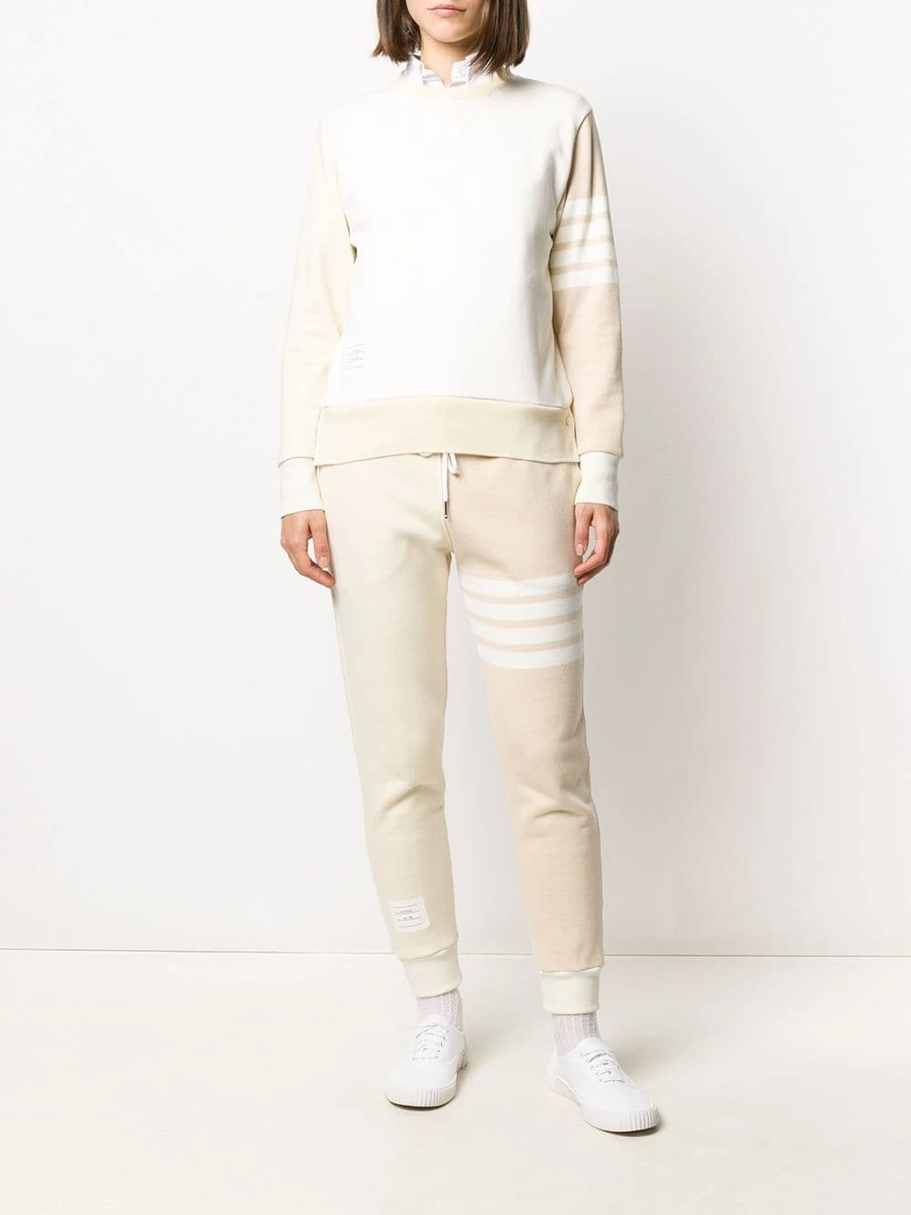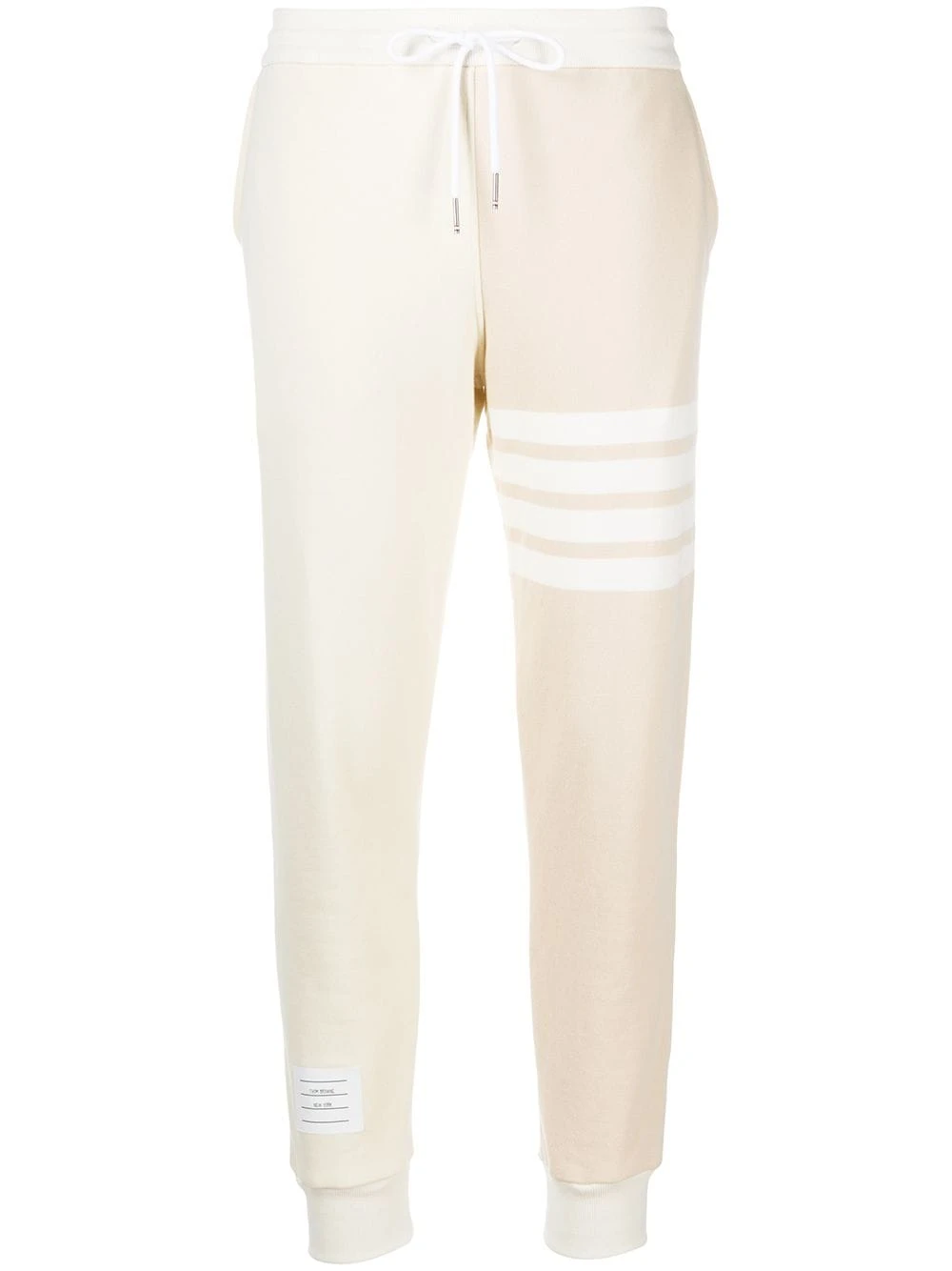 In or out of the gym, Thom Browne has you covered with this pair. In nude, these Funmix engineer 4-Bar stripe track pants are our solution to carefree dressing. We love athleisurewear. Featuring a drawstring waist, side pockets and gathered ankles.
