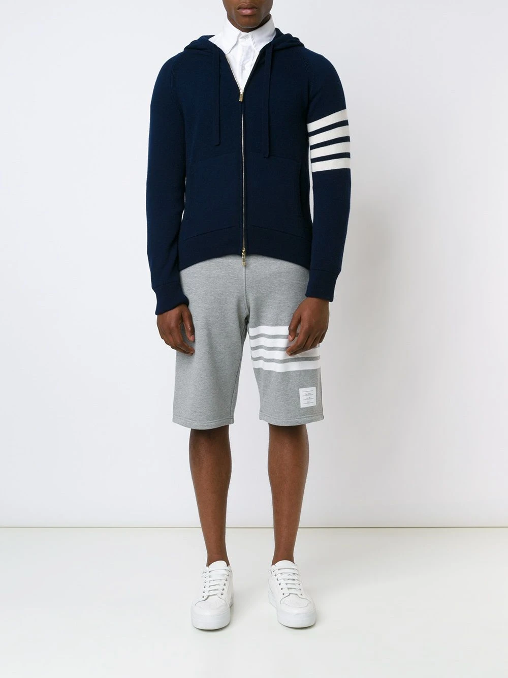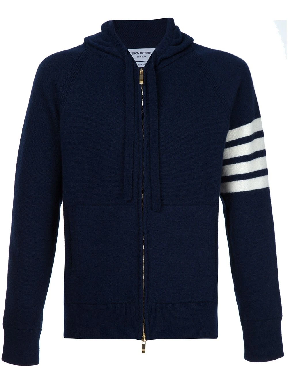 Thom Browne has taken a classic staple zipped hoodie and made it a high-end wonder. With his signature stripe detail, this navy blue cashmere knitted hoodie features a drawstring hood, a front zip fastening, long sleeves and two front pockets. This item is true to fit.