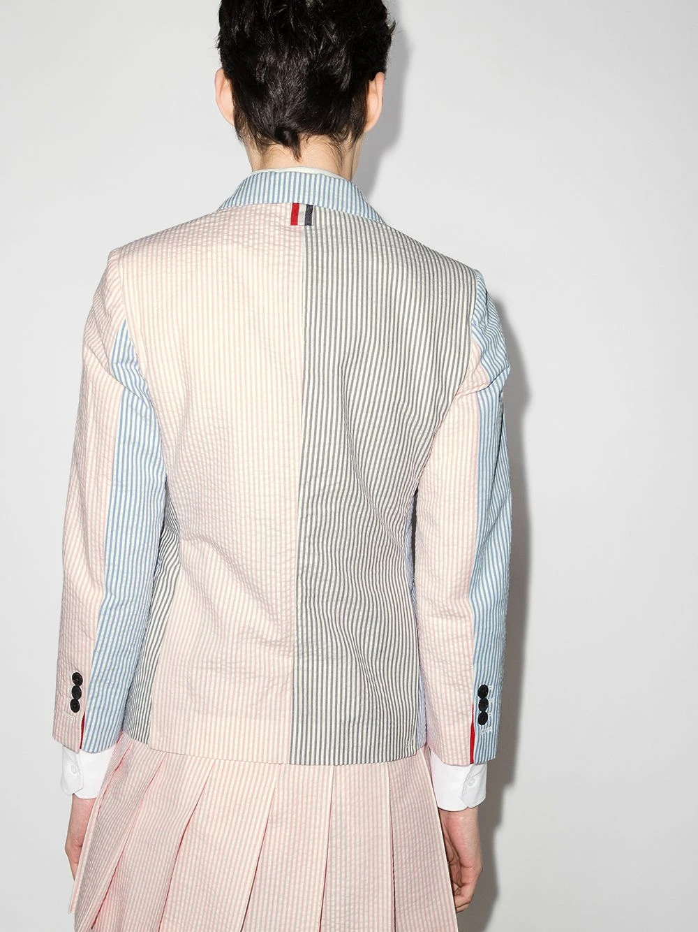 Tailoring with a twist. This blazer from Thom Browne is all you need to ensure your wardrobe is filled with timeless and iconic pieces, thanks to the patchwork pinstripe design. Sophistication is key.