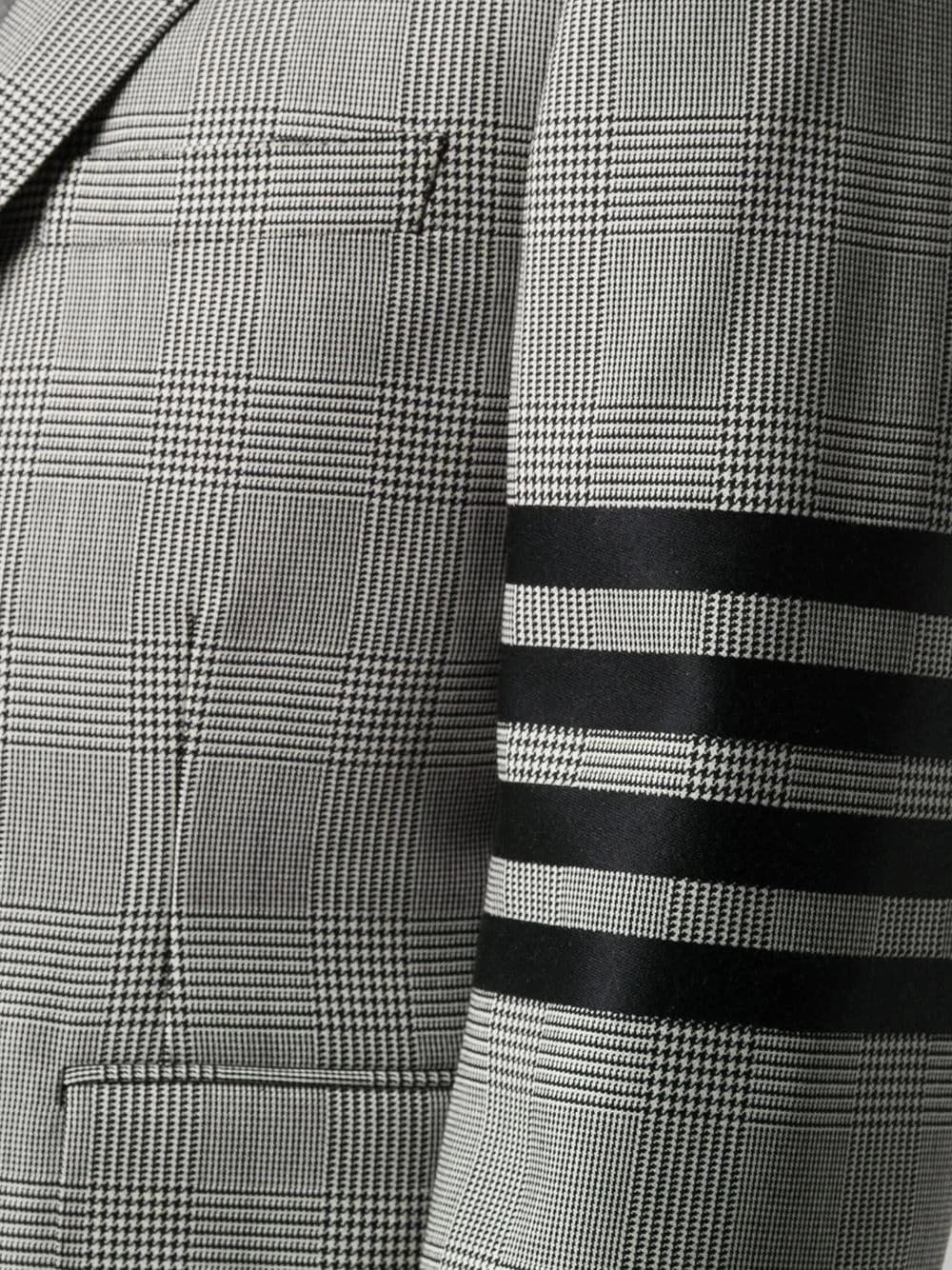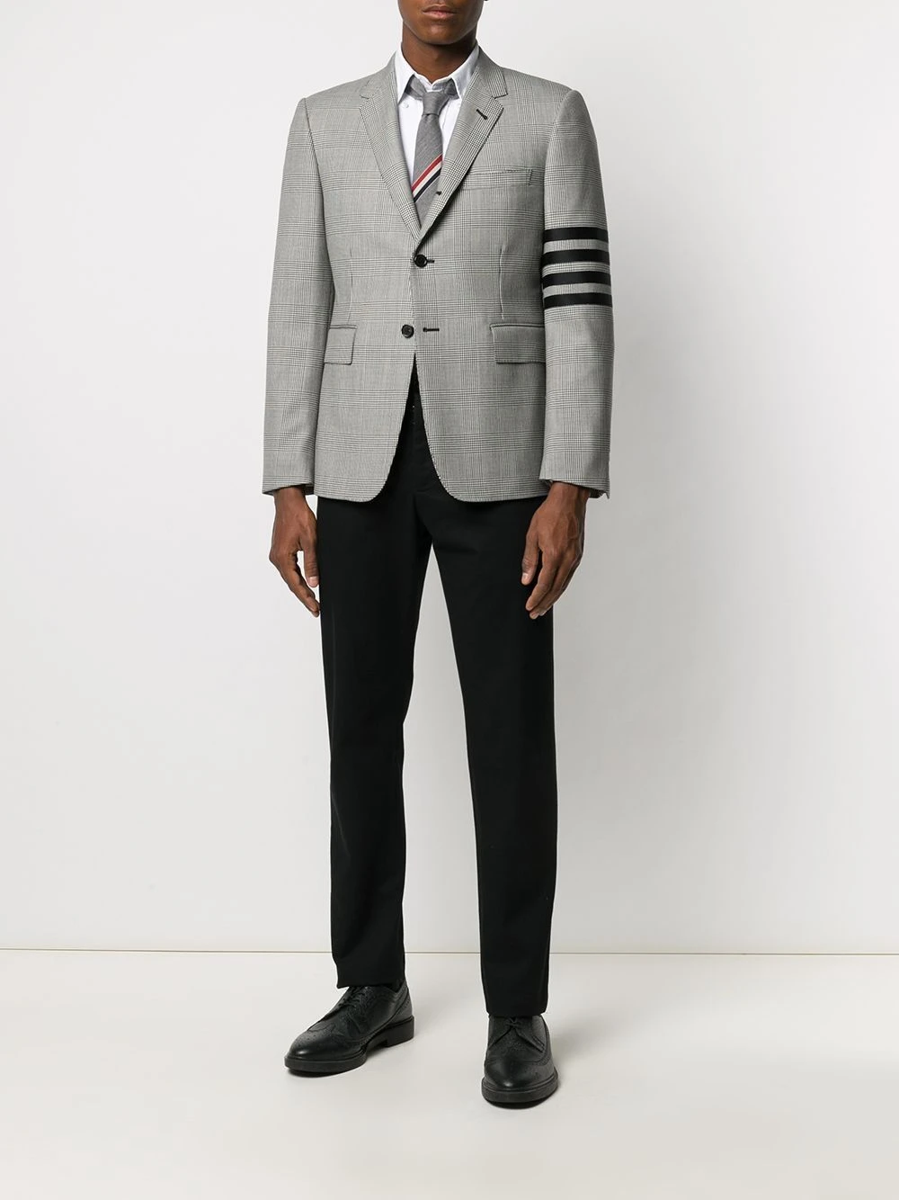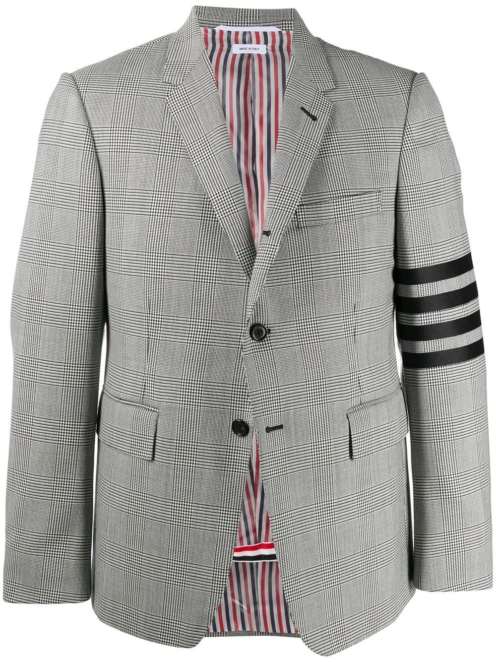 Pick a blazer, but make it Thom Browne. To be more exact, this black and white wool sport blazer with its check print and signature 4-Bar stripes. It’s a winner. Featuring a check print, a notched collar, a front button fastening, a chest pocket, front flap pockets, long sleeves, a straight hem, signature 4-Bar stripes and a striped lining.