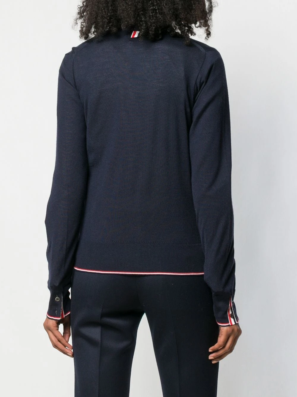 Keep your style on track even as the weather turns chilly. This RWB-detail Thom Browne cardigan is all you’ll want to pull on on those colder days. Get comfortable. Featuring a v-neck, a front button fastening, two front pockets, long sleeves, a ribbed hem and cuffs, button cuffs, a side button fastening, a signature grosgrain loop tab and RWB details.