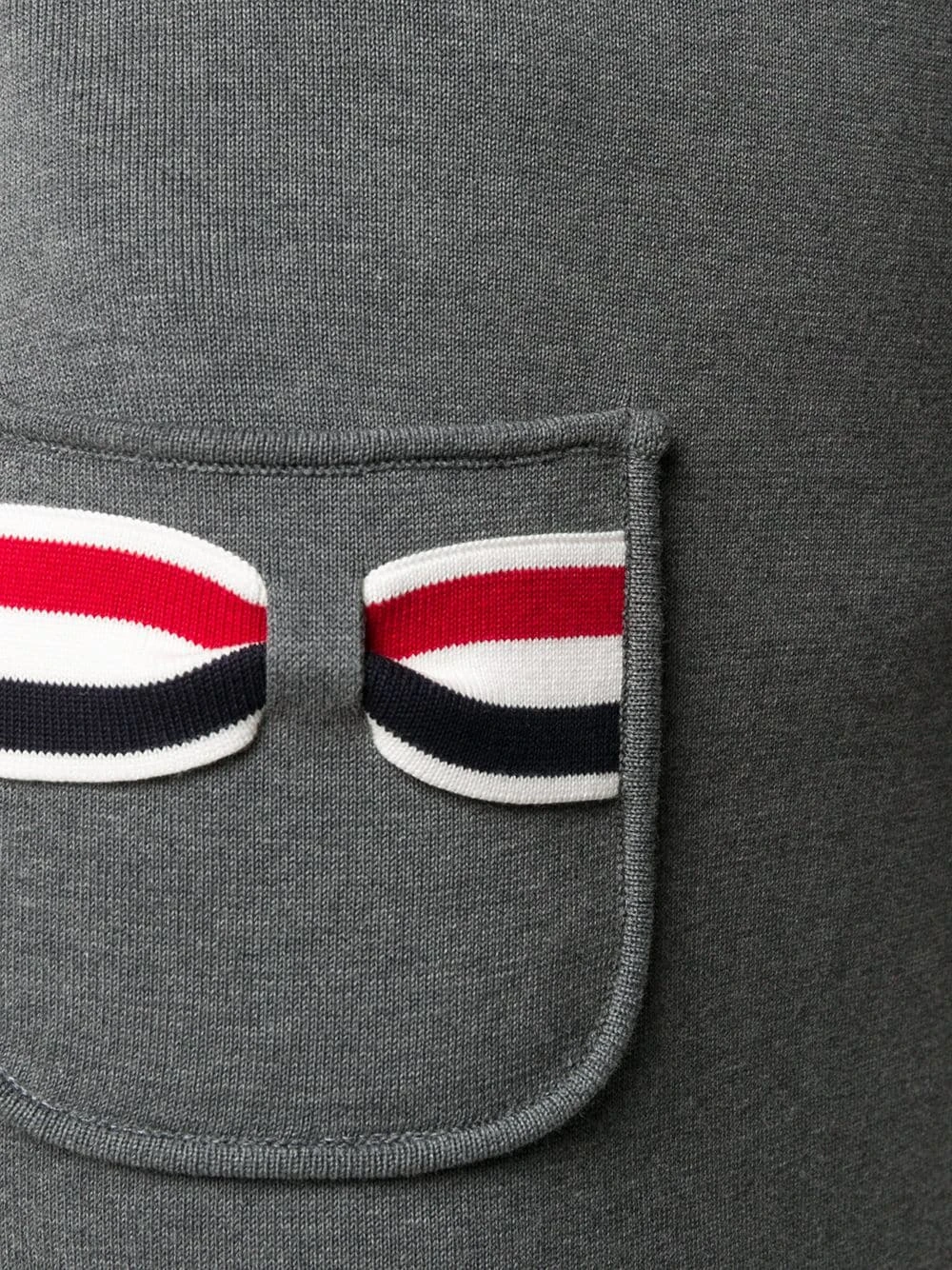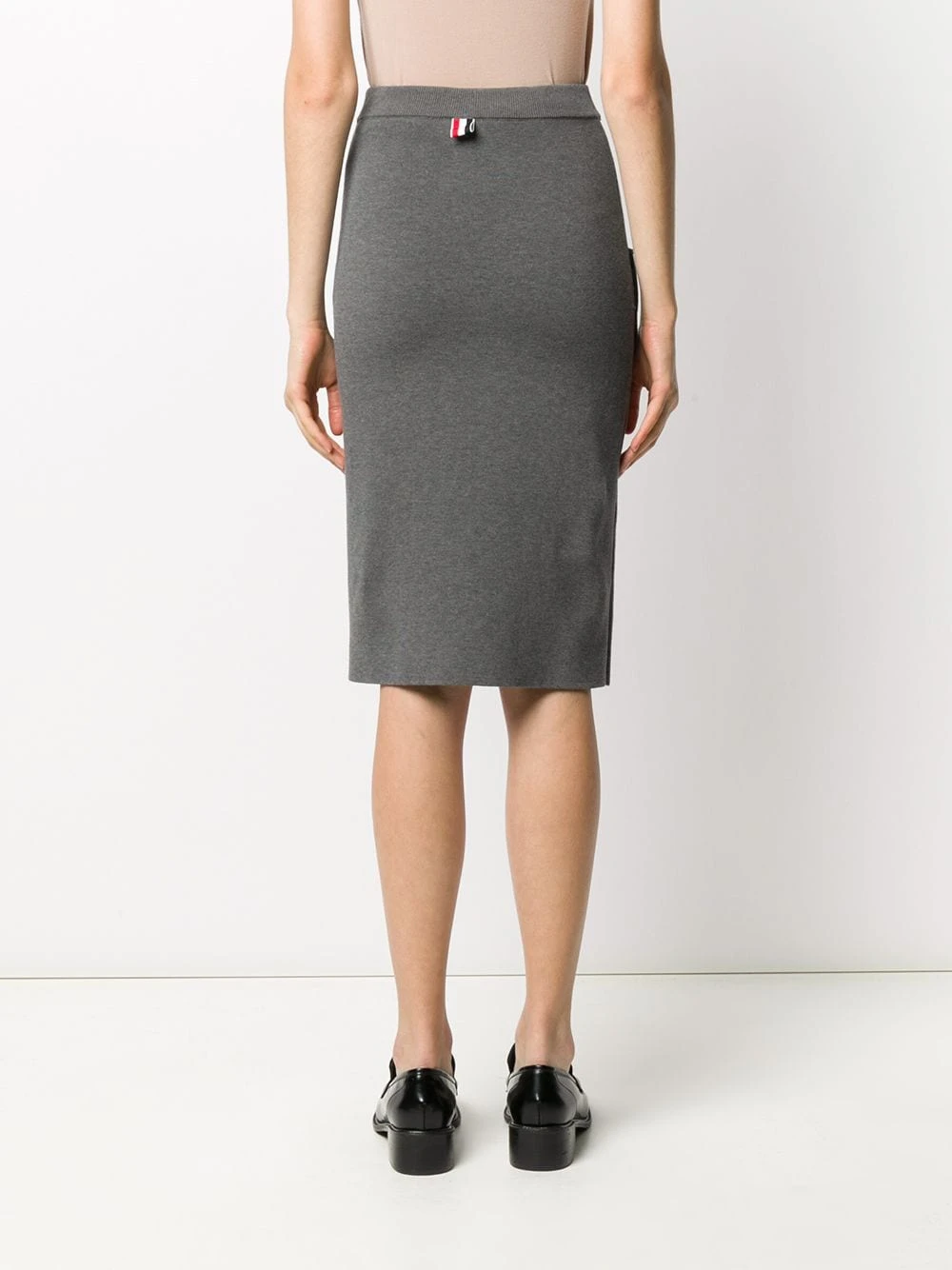 You’ll want to make space in your wardrobe for this addition. Made from medium grey cotton, this knitted pencil skirt from Thom Browne is detailed RWB stripes on the pockets. It’s all in the details.