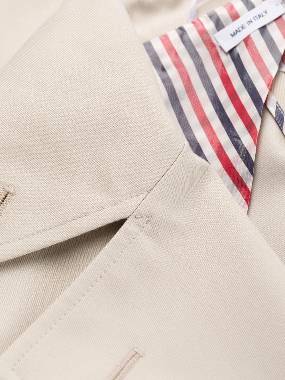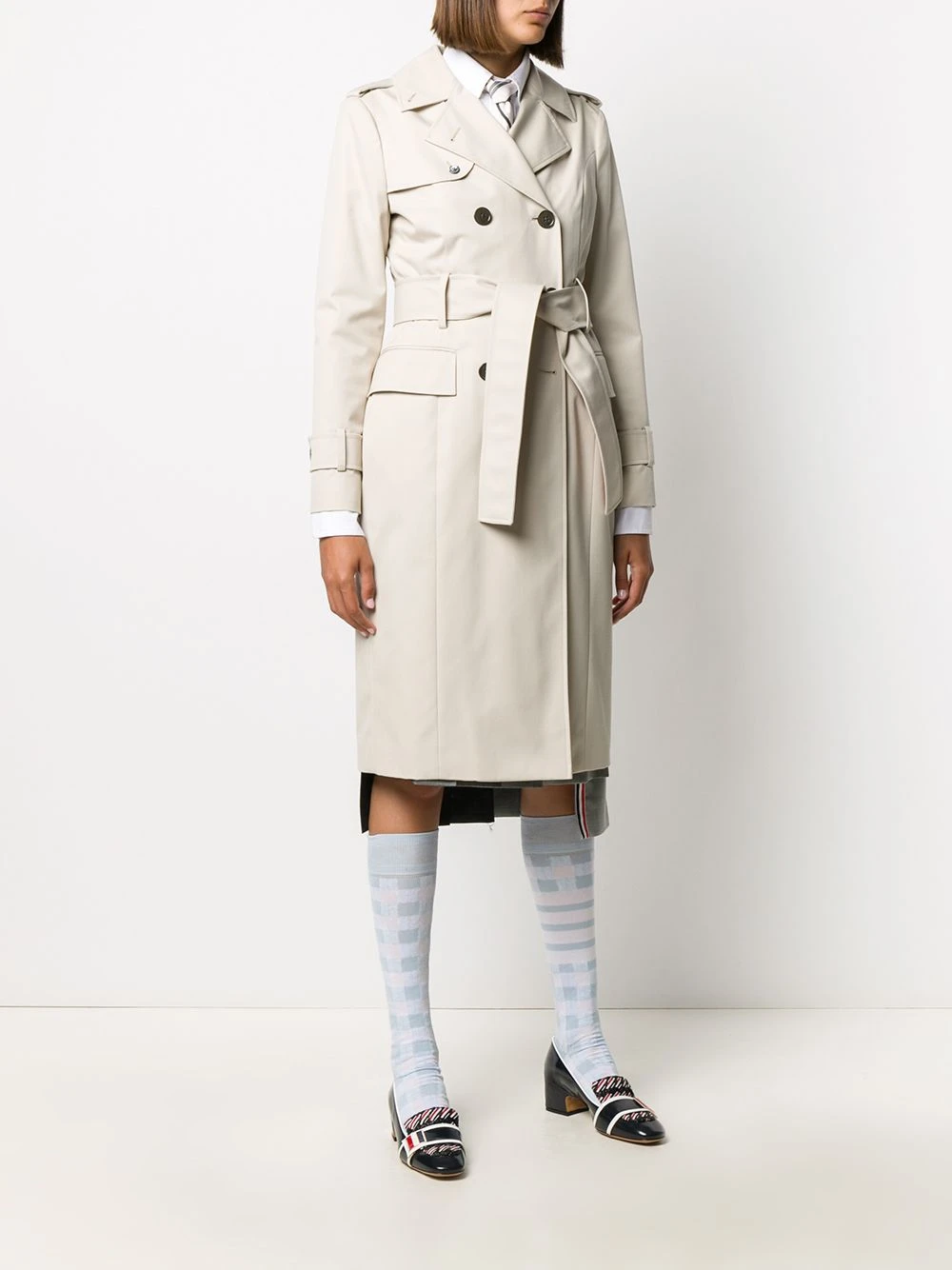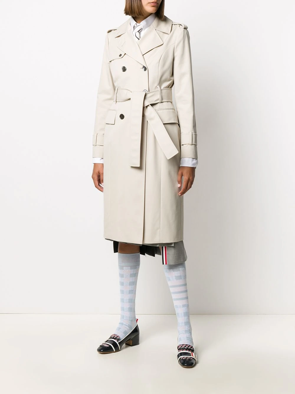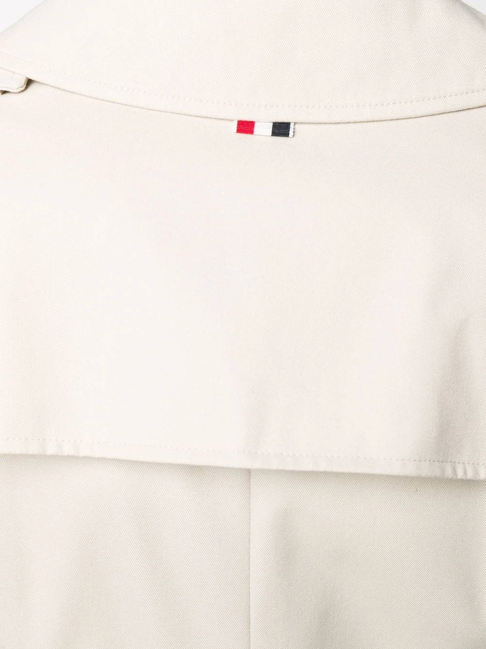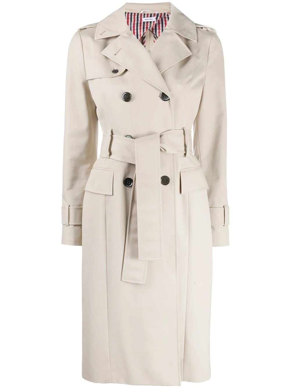 Some pieces make it look like you have everything together. And this waterproof cotton twill Thom Browne trench is one of those pieces. It’s time to add to your coat collection. Featuring epaulettes on the shoulders, notched lapels, a double-breasted front fastening, long sleeves, a belted waist, button cuffs, front flap pockets, a double vent to the rear, a mid-length, a waterproof design, a signature grosgrain loop tab and RWB stripes.