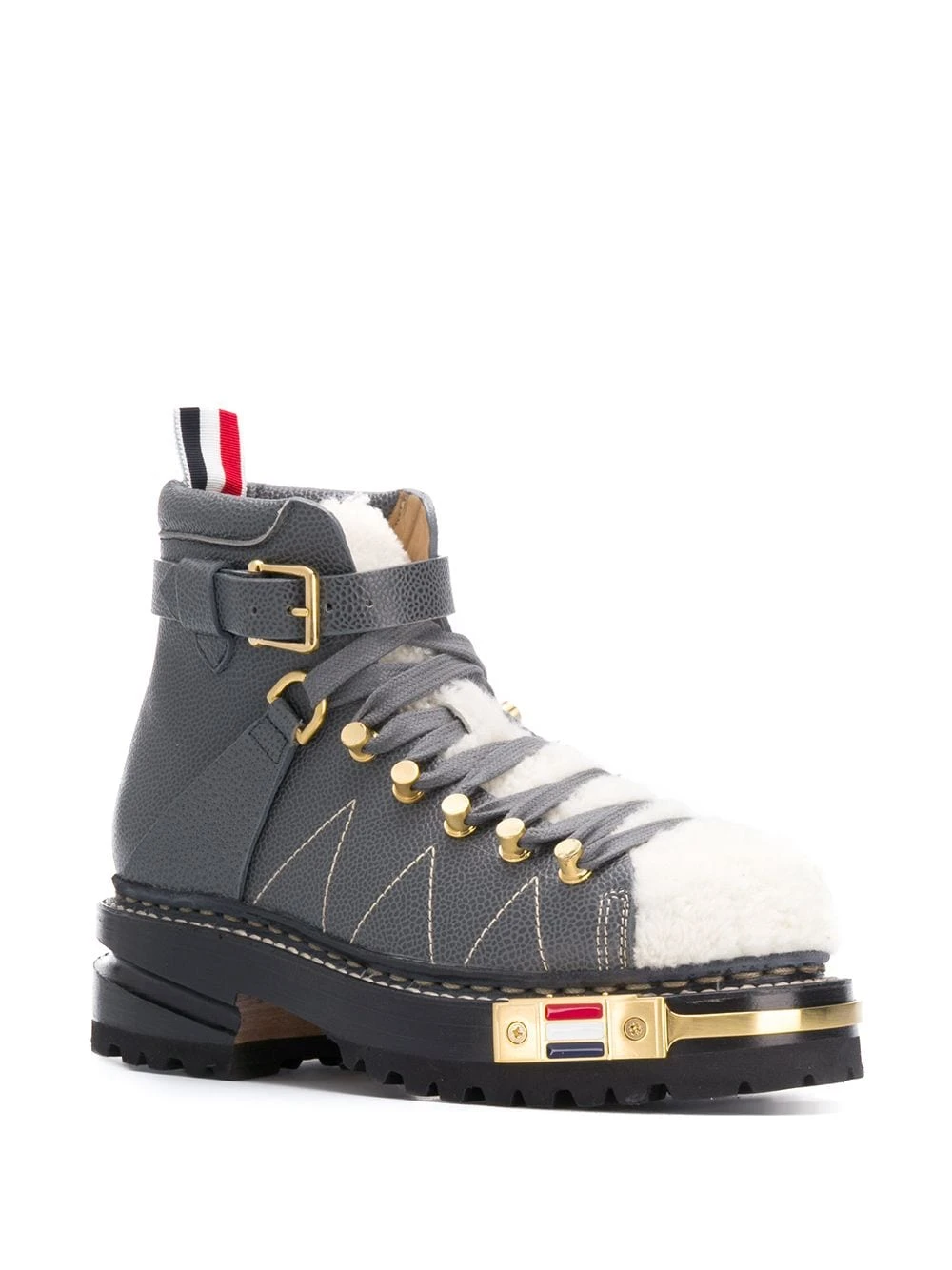 You may not be hiking Mount Fuji, but at least you can look the part albeit a bit more stylish. These grey leather Vitello hiking boots from Thom Browne are a real sight to behold, with a lace-up front complete with hiking hooks. Put your best foot forward! Featuring a pull tab at the rear, a lace-up front fastening, an ankle strap with a side buckle fastening, a ridged rubber sole, gold-tone hardware and a signature tri-colour tab.
