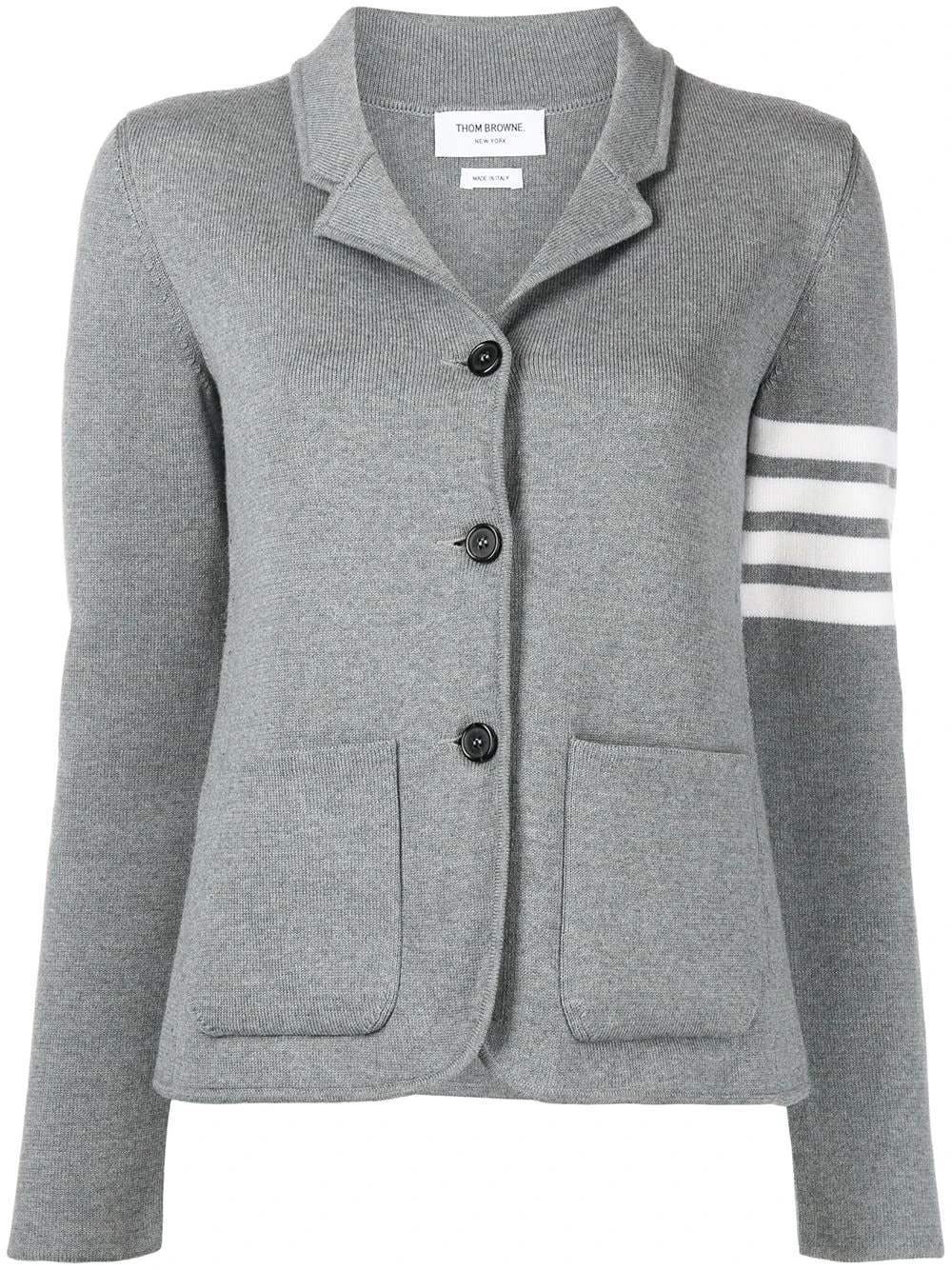 Spun from soft merino wool, Thom Browne presents this single-breasted jumper as part of its AW21 offering. Presented in a smoke-grey hue, the left sleeve is circled by the brand’s signature 4-Bar motif.