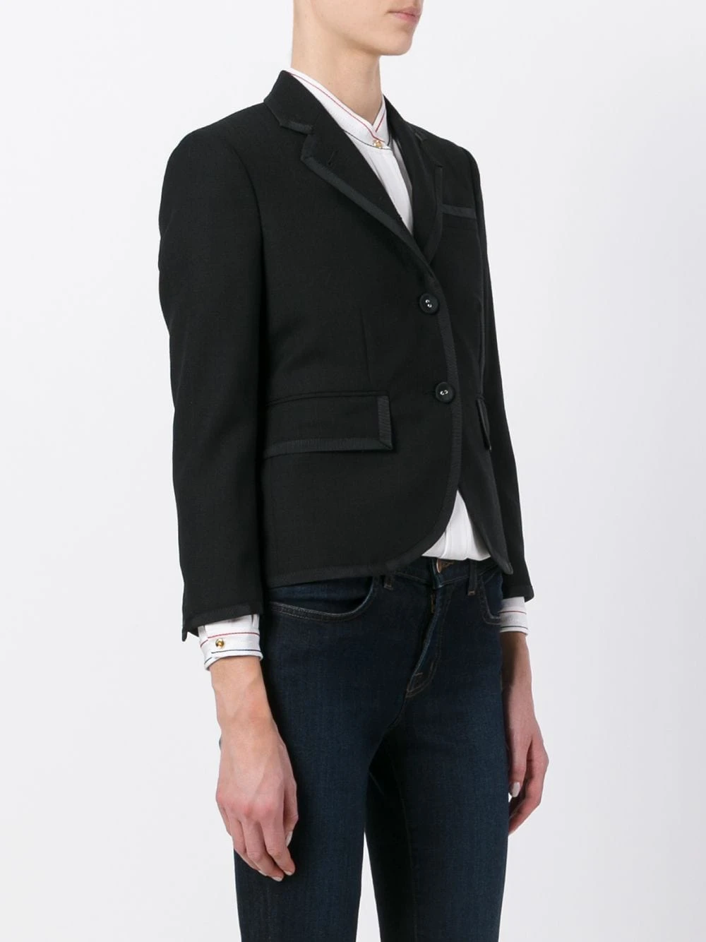 Black wool and silk Classic Single Breasted Sport Coat With Grosgrain Tipping In 2 Ply Fresco from Thom Browne featuring notched lapels, a button fastening, three-quarter length sleeves, button cuffs, a broad welt chest pocket, front flap pockets, a curved hemline, a double vent to the rear, a slim fit, red, white and blue grosgrain cuffs detail and back yoke tab, ribbed piping detail and a three-coloured signature lining.