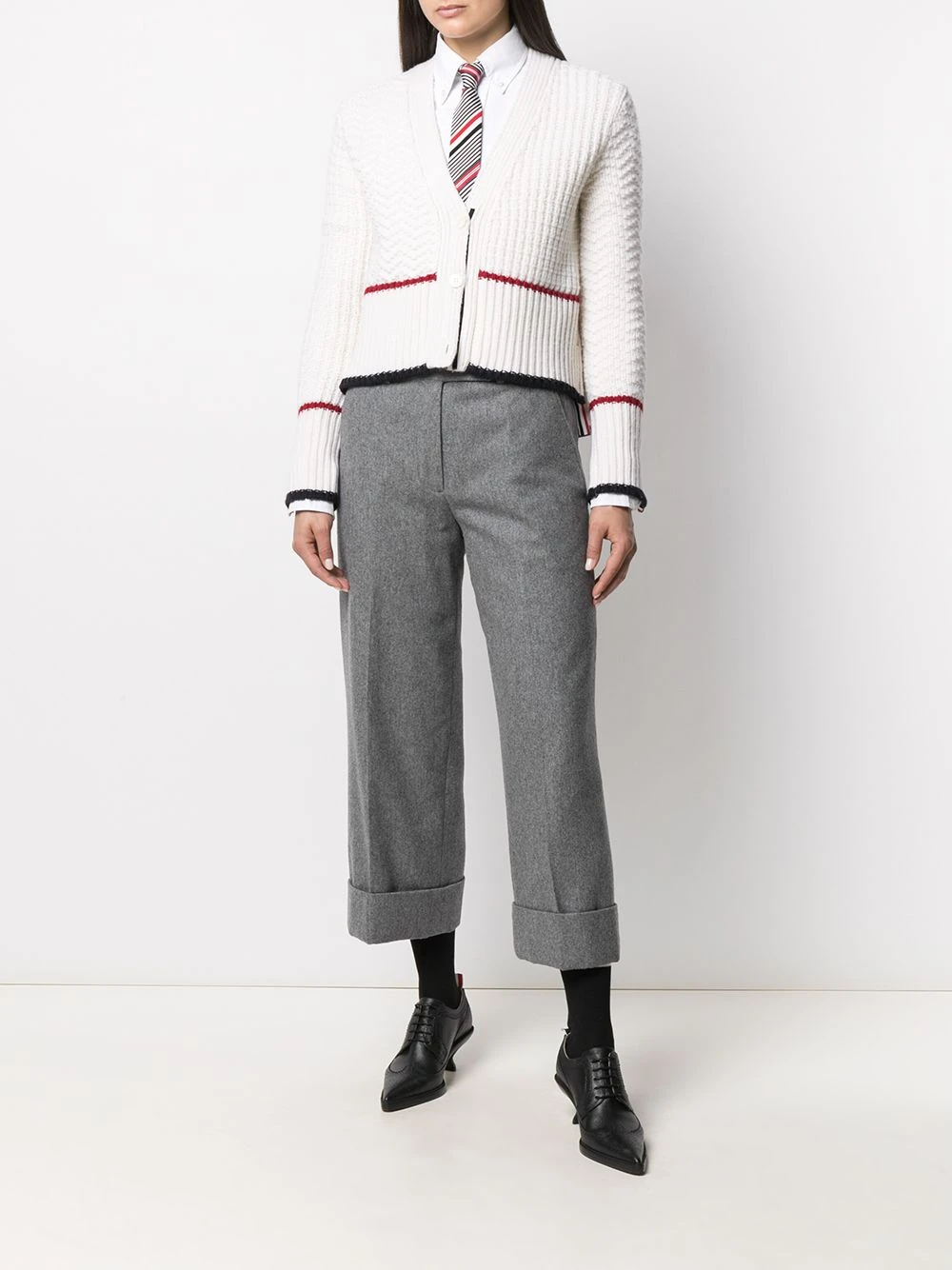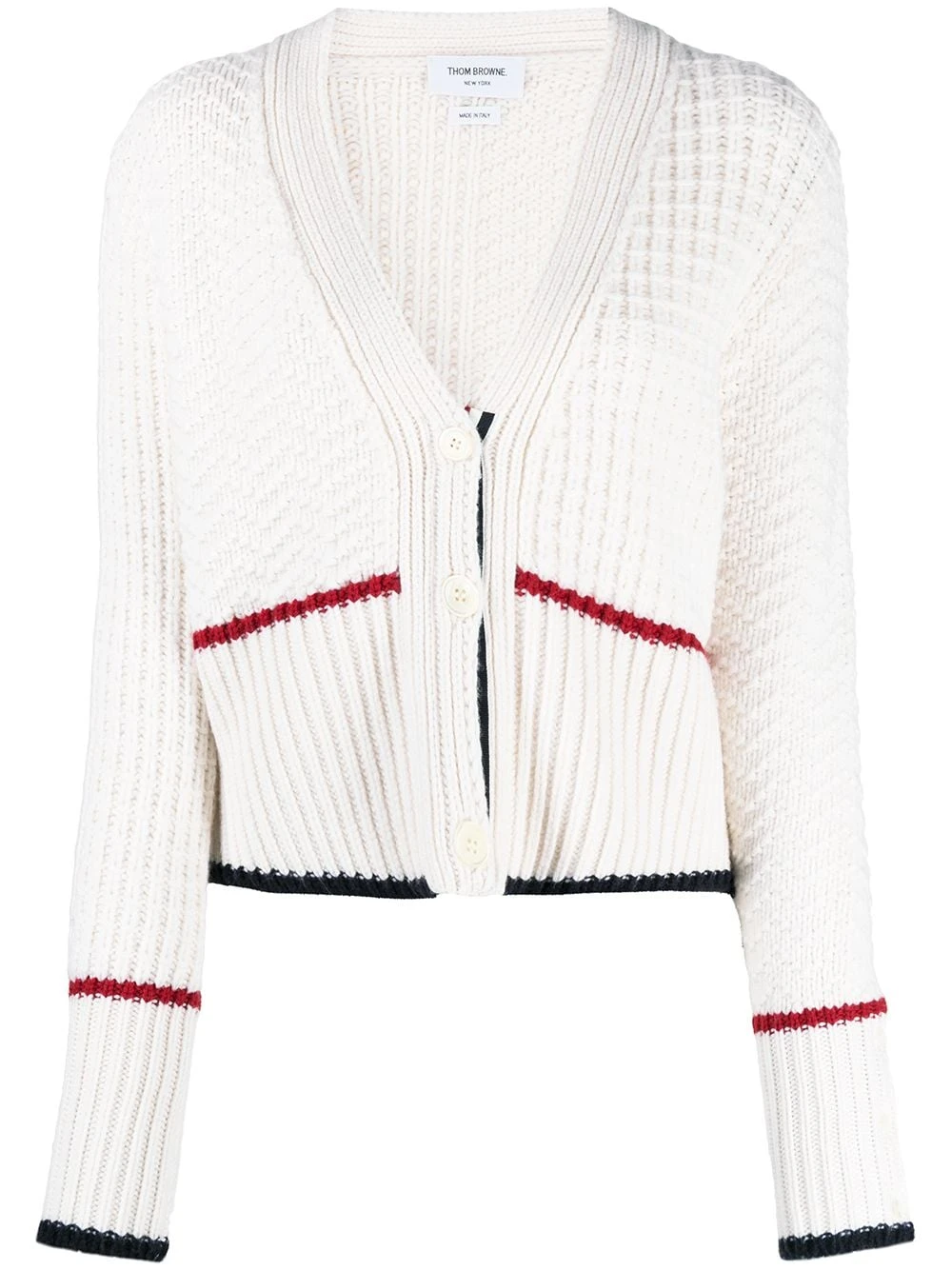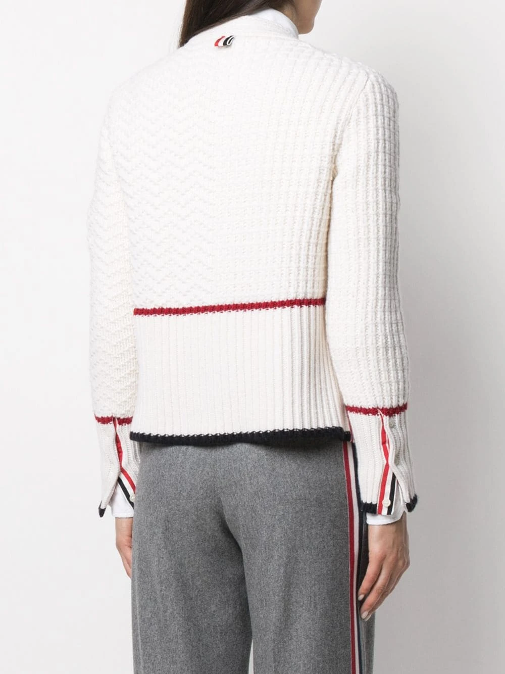Tailoring with a playful twist. Crafted from fine merino wool, this Thom Browne cardigan features a mix of knitting patterns that will add a touch of irreverence to a refined design. Defy the status quo.
