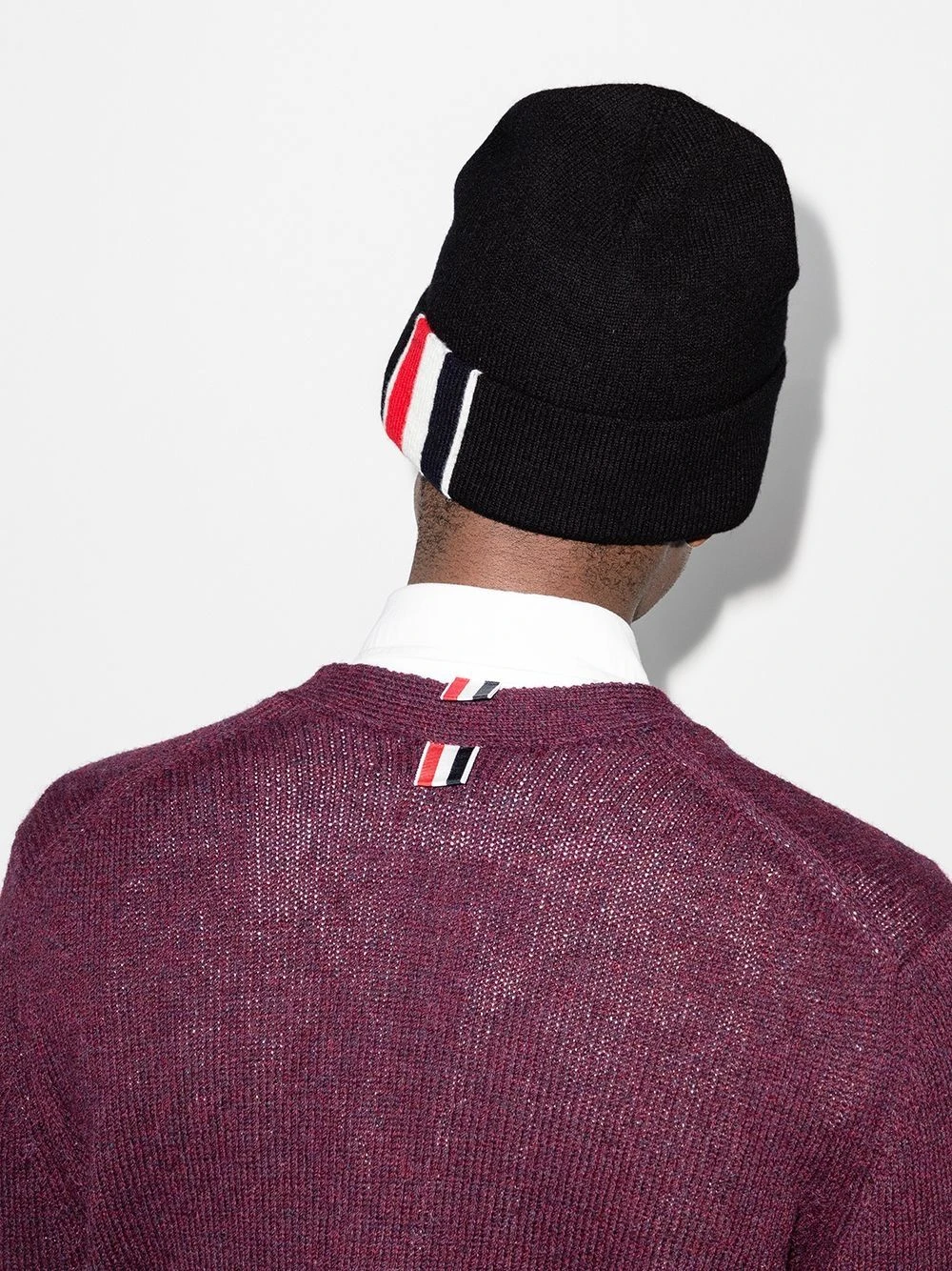 Thom Browne transforms its usually subtle tricolour signature detail into the centre of this knitted hat. The houseβs iconic red, navy blue and white stripes have the blue detail replaced for black, putting it on the turn-up hem of this beanie.