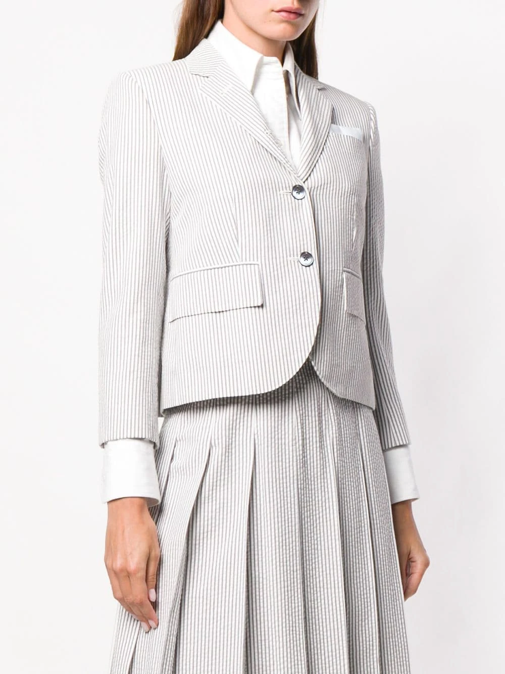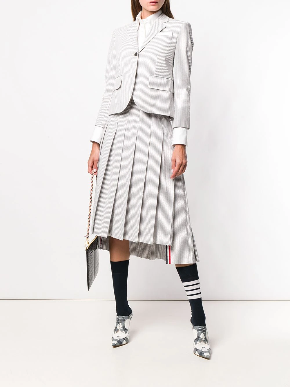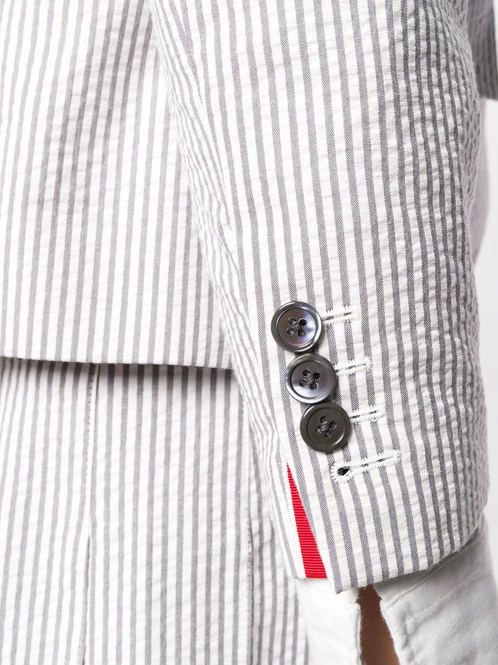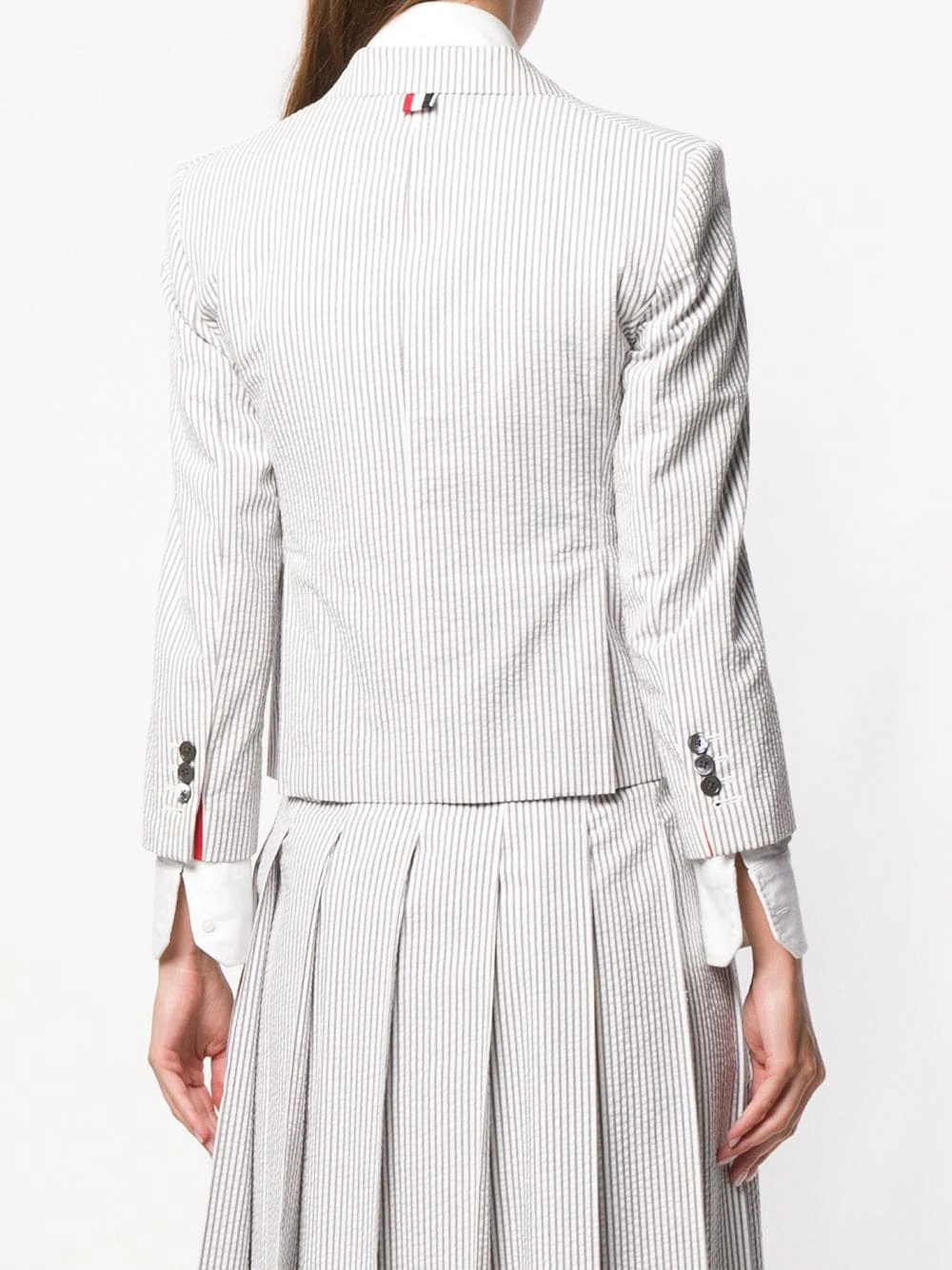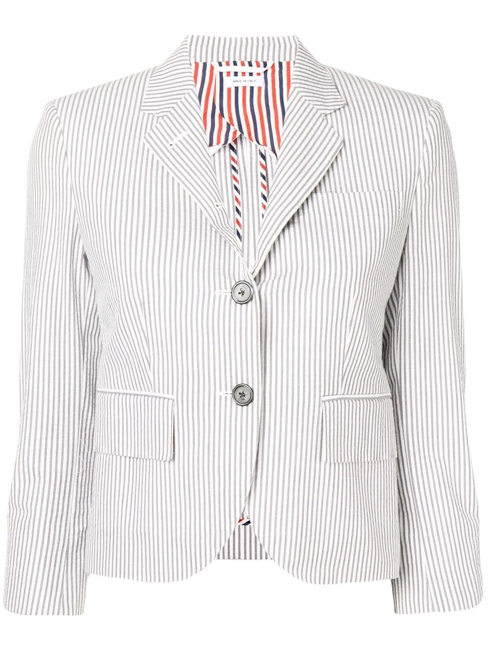 Exuding the brand’s collegiate influences, Thom Browne’s blazer is cut to a classic single-breasted silhouette. Crafted from cotton in a vertical stripe pattern, this piece’s details lie in its lining: the house’s iconic RWB stripe covers its interior.