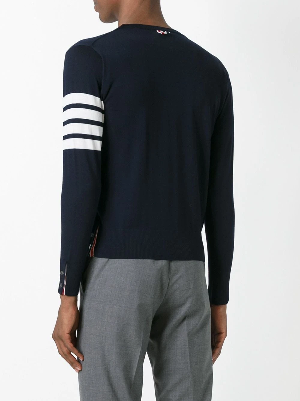Effortless preppy style? It must be Thom Browne. Make this 4-Bar jumper your new uniform. Featuring a ribbed crew neck, long sleeves, a straight hem, button cuffs, decorative buttons, a 4-Bar tab and a 4-Bar stripe. This item is true to fit.