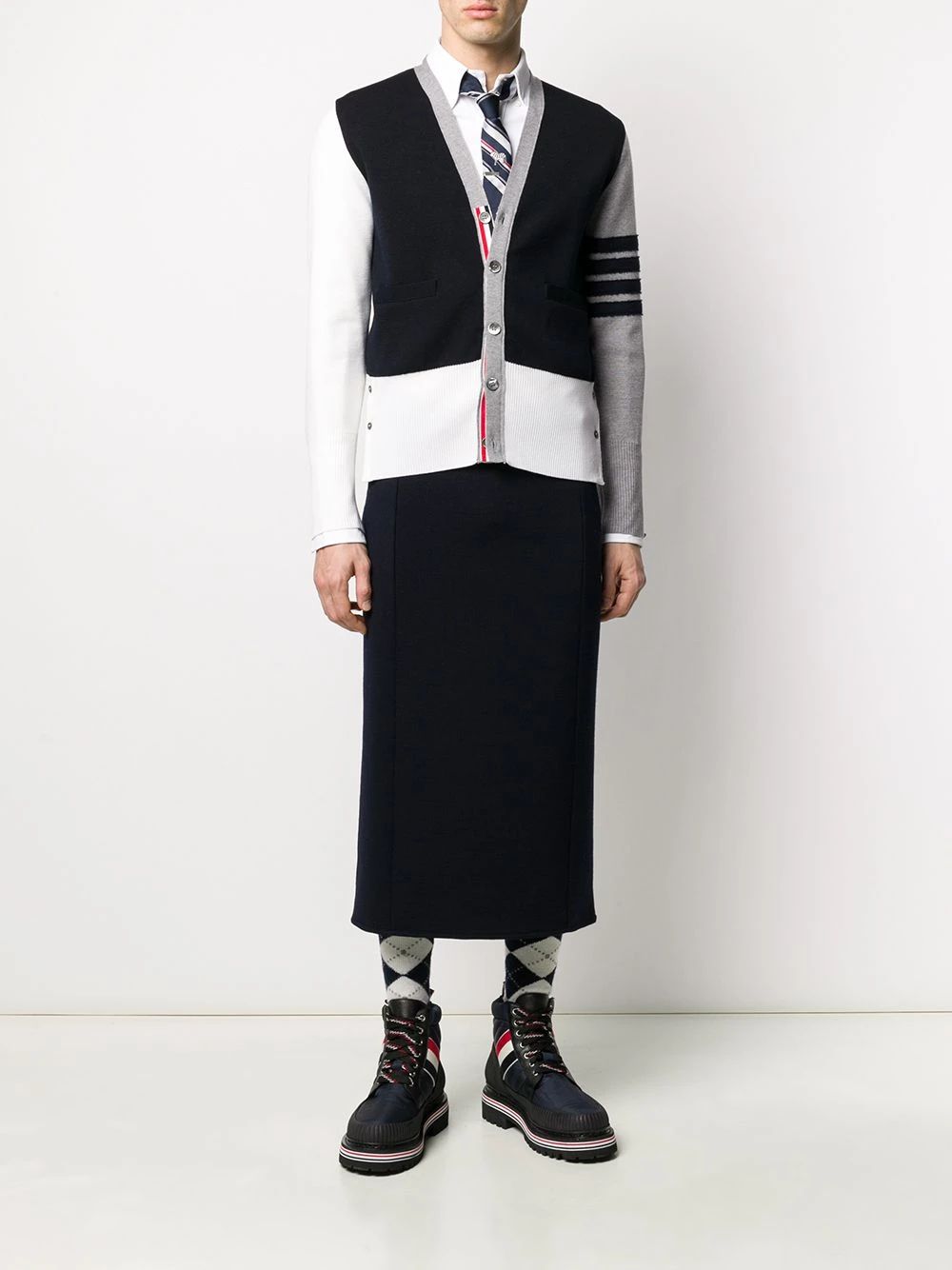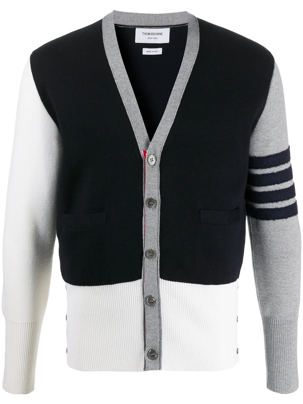 Versatile and comfortable, what else would you want? This blue, white and grey 4-bar merino cardigan from Thom Browne makes dressing in the morning an easy feat. Even before your morning coffee. Featuring a v-neck, a front button fastening, a side button fastening, long sleeves and a ribbed hem and cuffs.