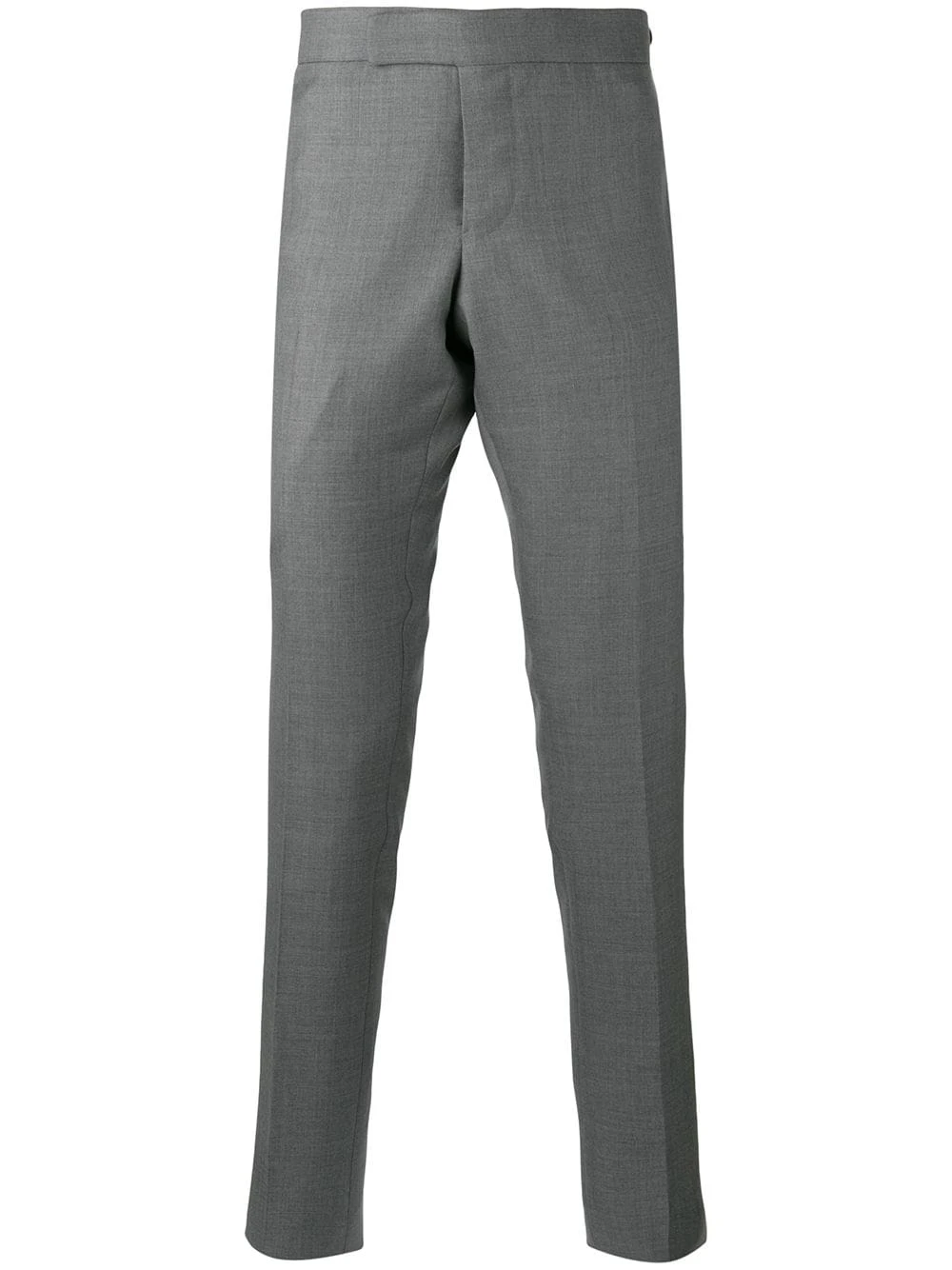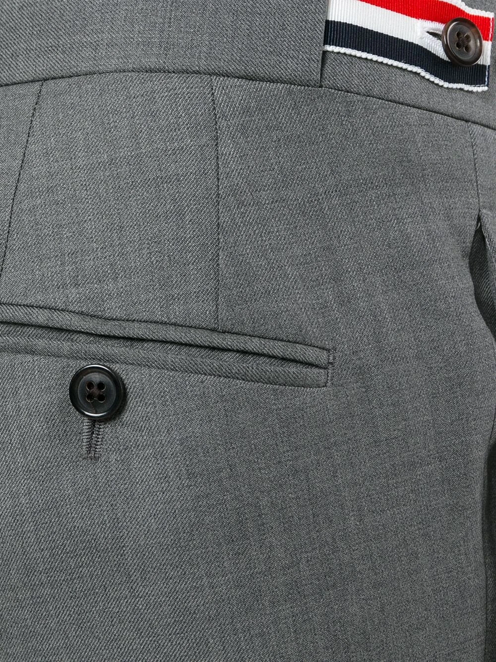 Inspired by the classic American silhouettes of his childhood, New York fashion designer Thom Browne has re-imagined modern suiting for a contemporary audience. Often creating pieces with an idiosyncratic twist, these grey trousers are a perfect example of Browneβs unfaltering talent. Impeccably crafted in Italy from soft wool, these classic trousers are fashioned with a concealed fly fastening, a set of four pockets and a signature tri-colour striped grosgrain trim to each side.