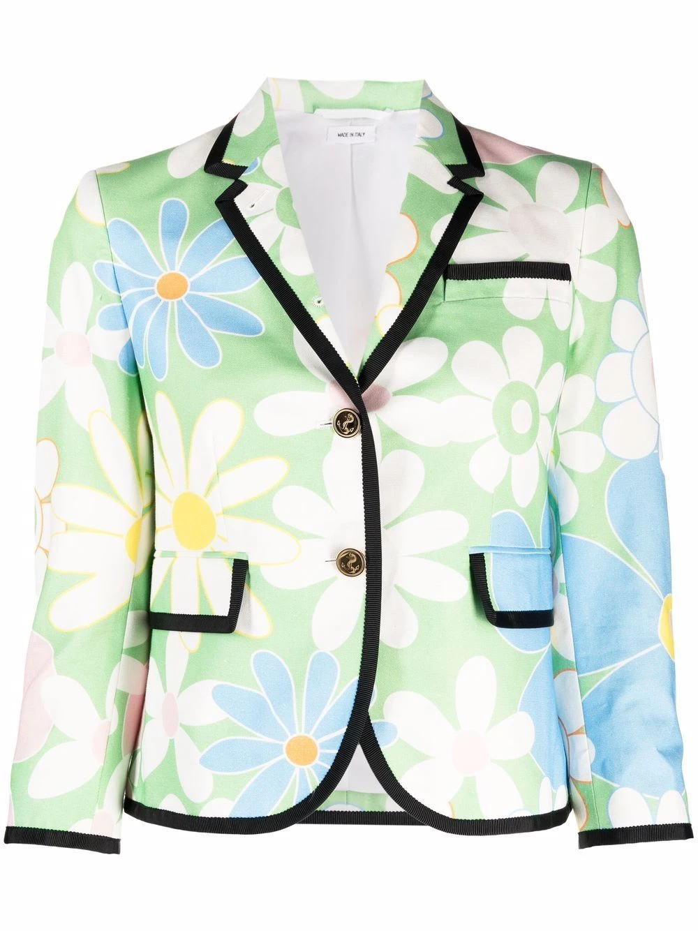 Thom Browne became widely recognized for creating classic and timeless women’s clothes. A fine example of its style is this single-breasted blazer, crafted from silk and cotton and decorated with a colourful floral print, contrasting blue trim and the recognisable grosgrain loop tab at the rear.