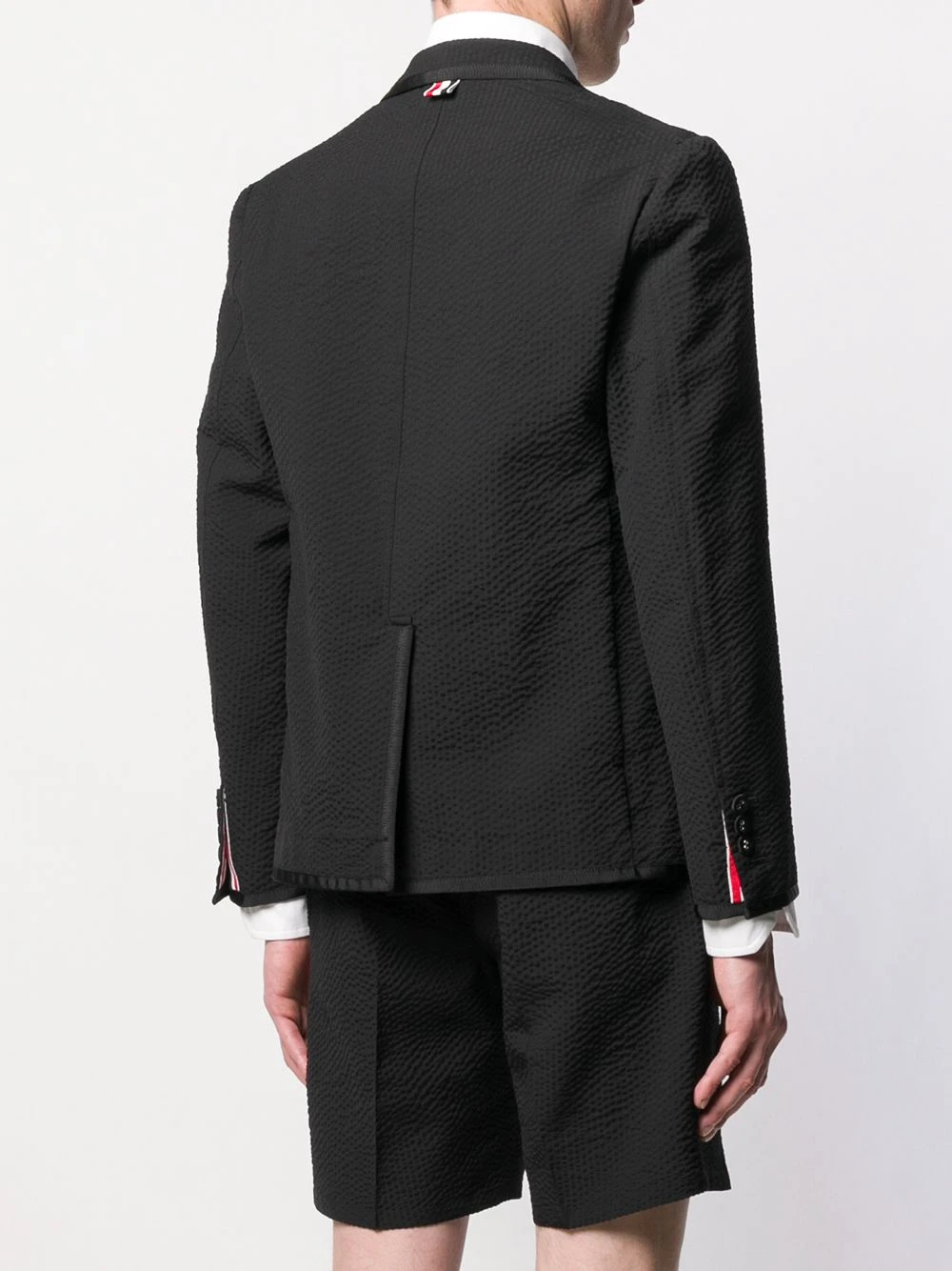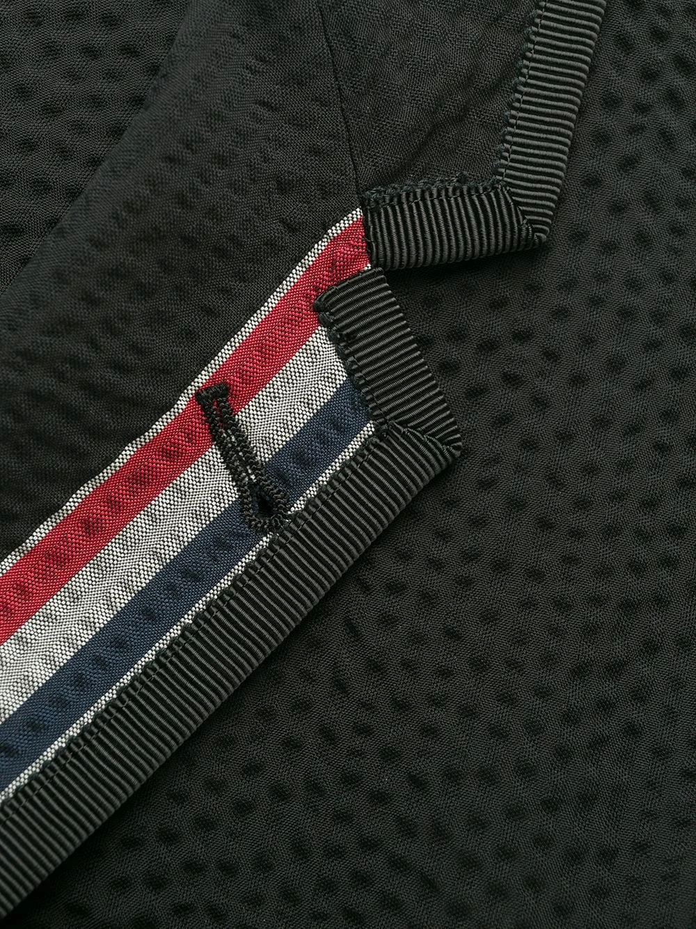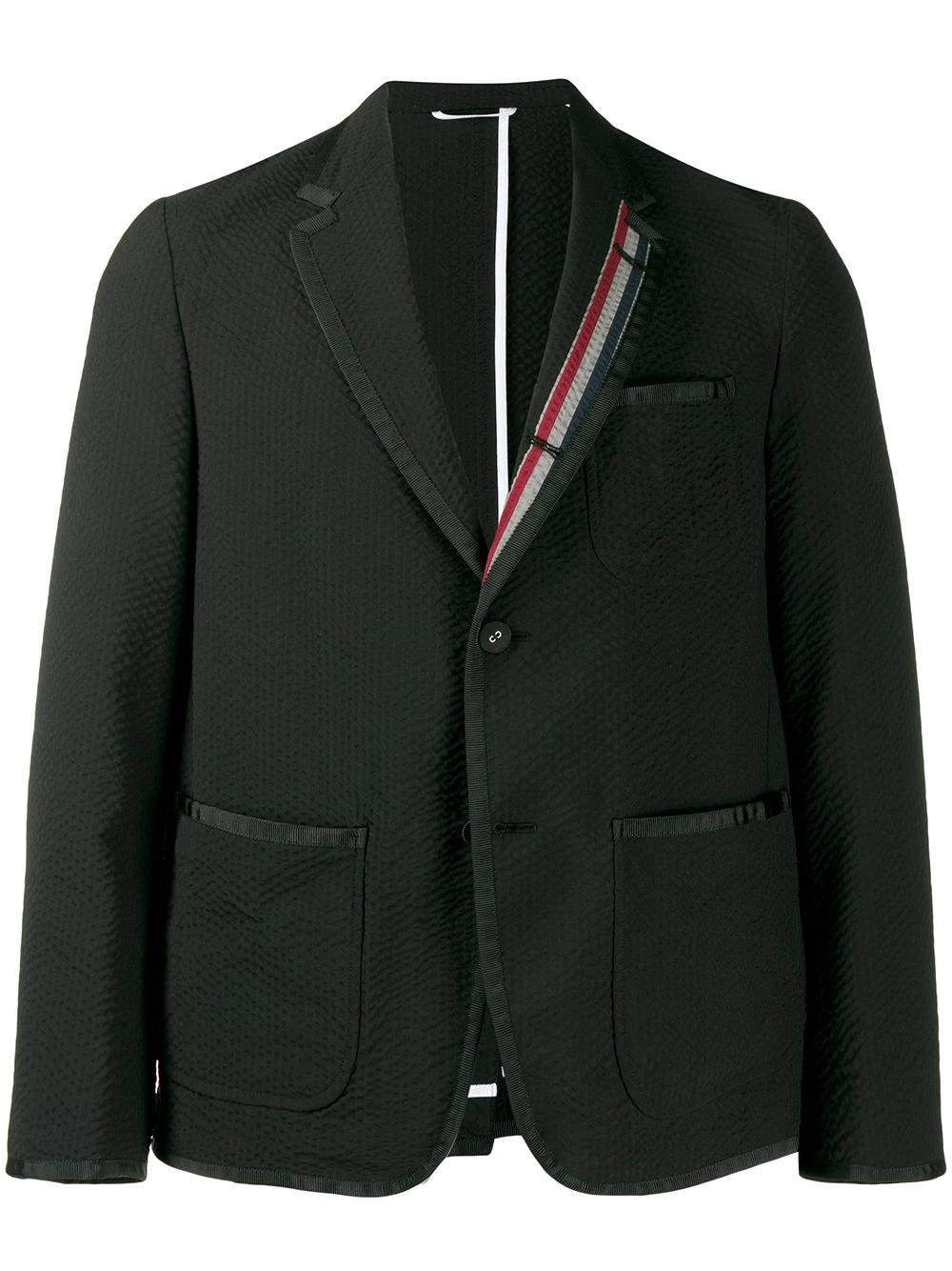 A lineup of investment pieces designed to withstand the test of time, Thom Browne’s most recent collection continues to blur the lines between refined tailoring and contemporary sportswear. As seen in this black wool seersucker sack sport coat that feature a notched collar, a front button fastening, a textured style, a chest pocket, two front pockets, long sleeves, a back slit at hem, button cuffs, a tricolour grosgrain tab on the rear and signature tricolour striped trimming details at the cuffs.
