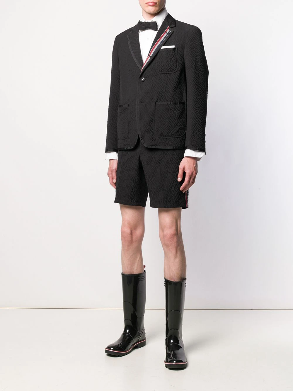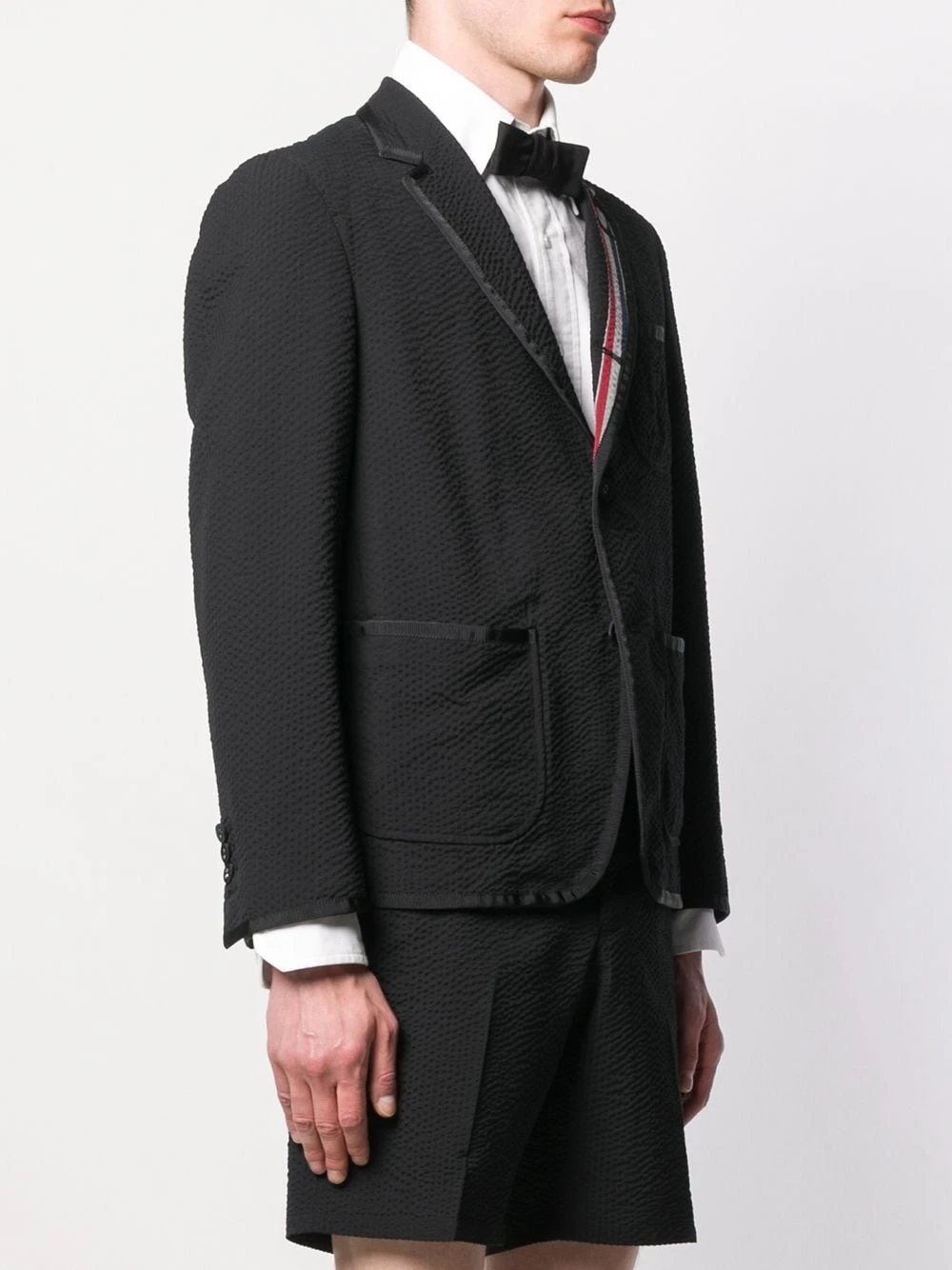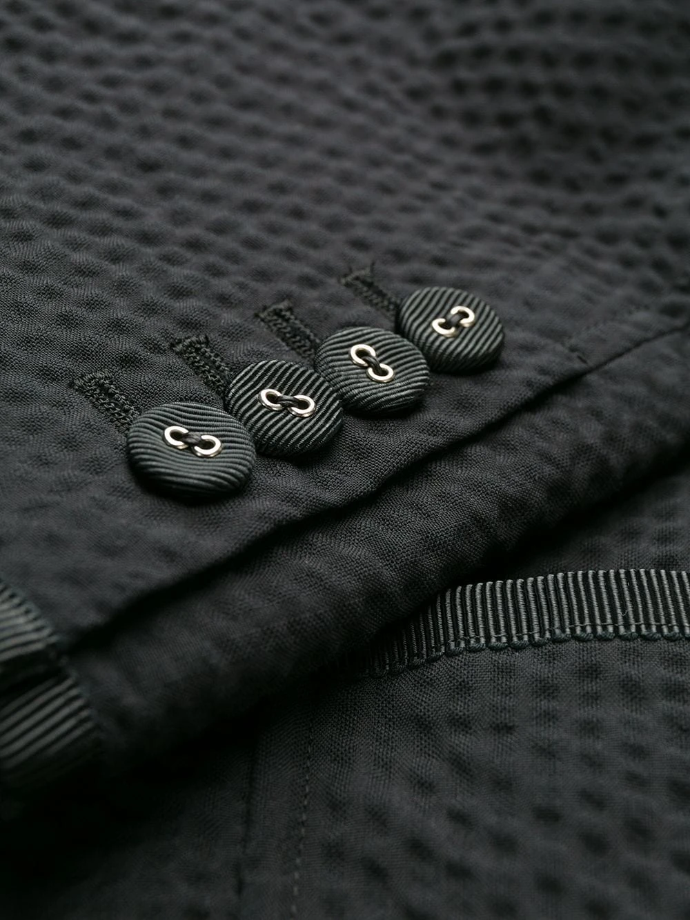 A lineup of investment pieces designed to withstand the test of time, Thom Browne’s most recent collection continues to blur the lines between refined tailoring and contemporary sportswear. As seen in this black wool seersucker sack sport coat that feature a notched collar, a front button fastening, a textured style, a chest pocket, two front pockets, long sleeves, a back slit at hem, button cuffs, a tricolour grosgrain tab on the rear and signature tricolour striped trimming details at the cuffs.