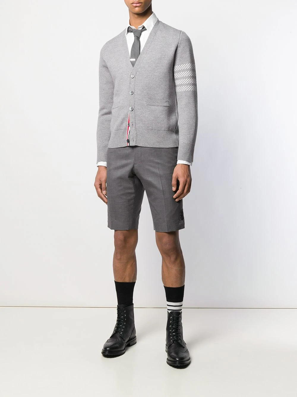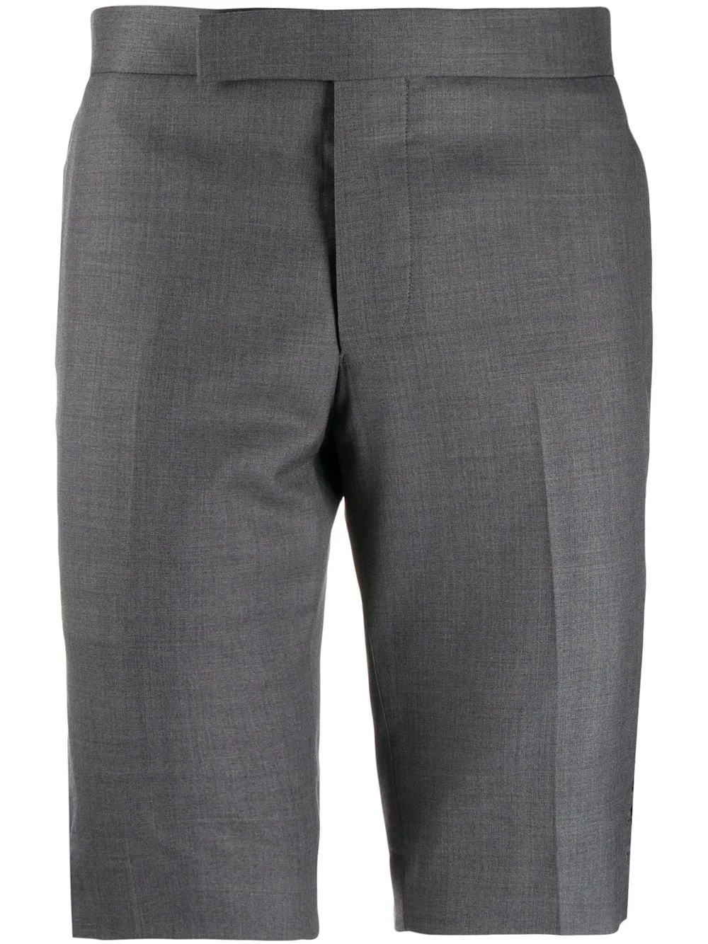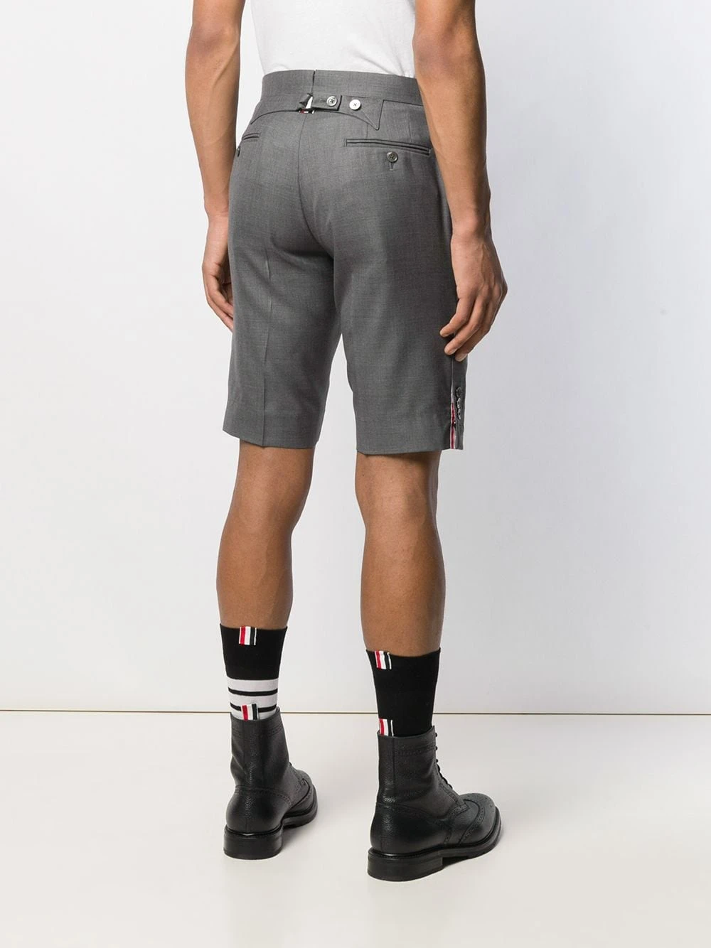 A lineup of investment pieces designed to withstand the test of time, Thom Browneβs most recent collection continues to blur the lines between refined tailoring and contemporary sportswear. As seen in these medium grey wool super 120s twill shorts that feature a concealed front fastening, two front pockets, two back buttoned welt pockets, side button fastenings and signature tricolour striped trimming details.
