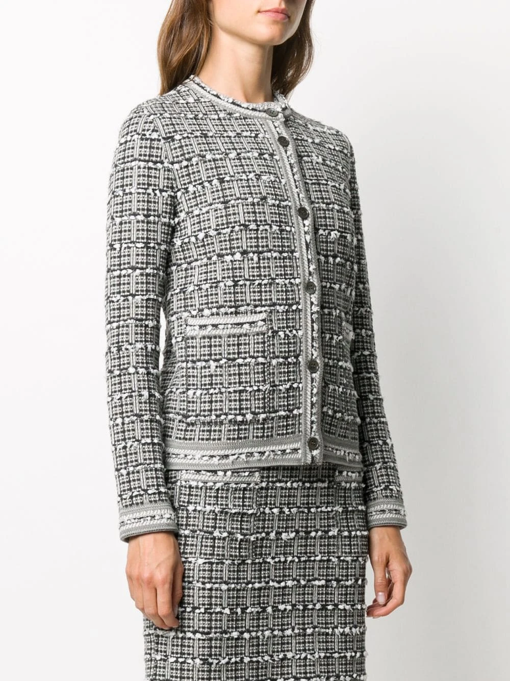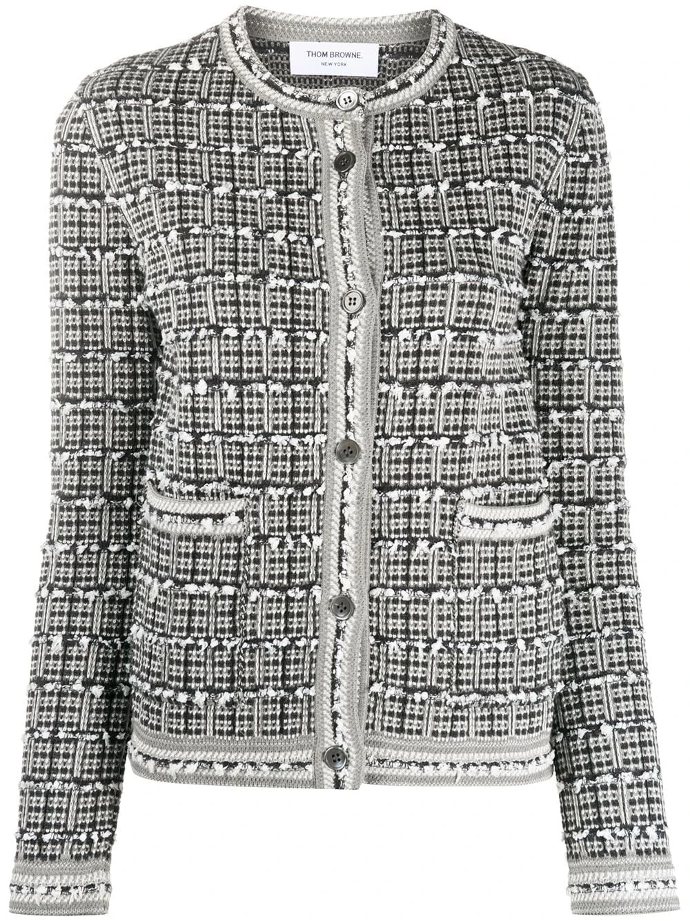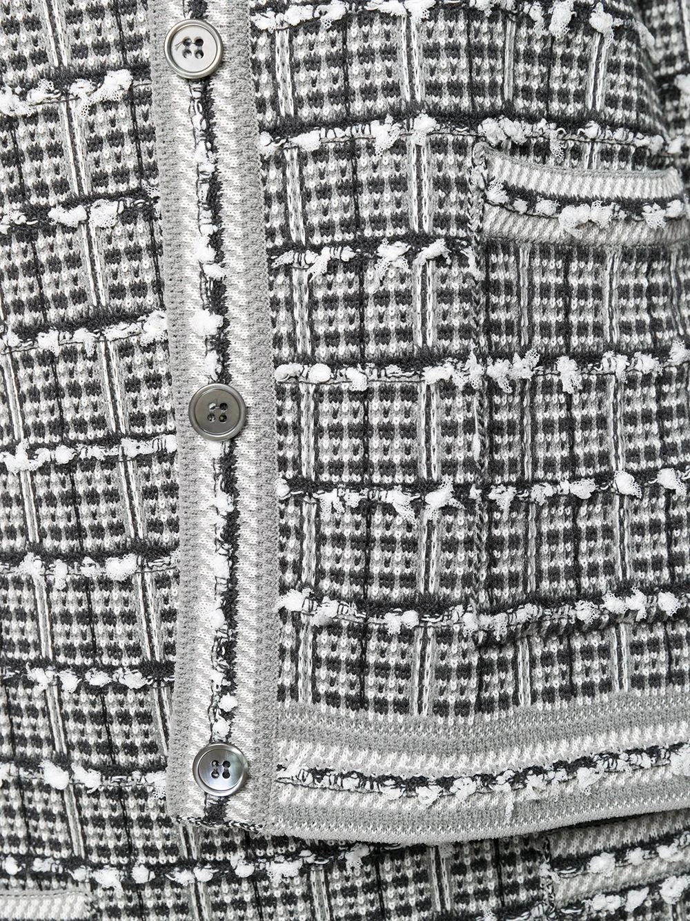 You mix comfort, femininity and add in a sprinkle of refined elegance. What do you get? This windowpane jacquard cardigan jacket from Thom Browne. Constructed from a soft cotton blend, this crew neck cardigan is ready to freshen up your wardrobe with its timeless design and polished-looking aesthetic. Whatβs not to love?Β