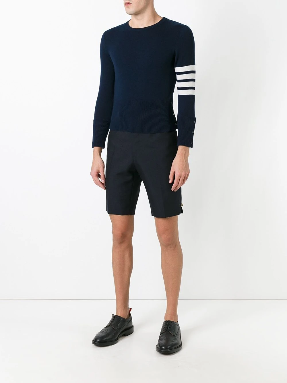 Navy Blue cashmere 4-Bar Short Cashmere Pullover from Thom Browne featuring a cropped length, long sleeves, button cuffs and white stripes on the left sleeve.. This item is true to fit.