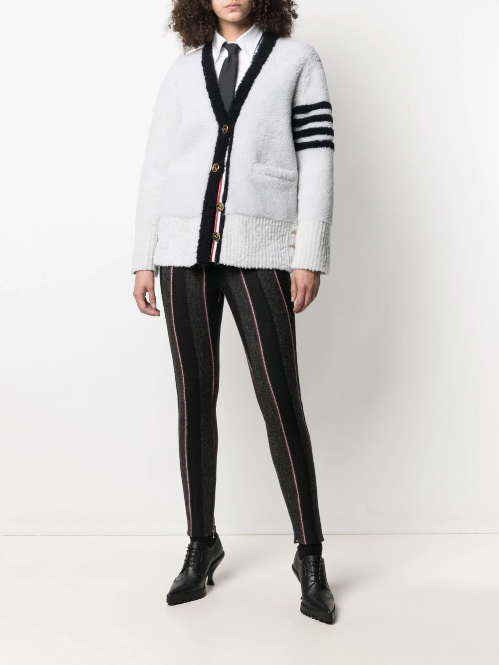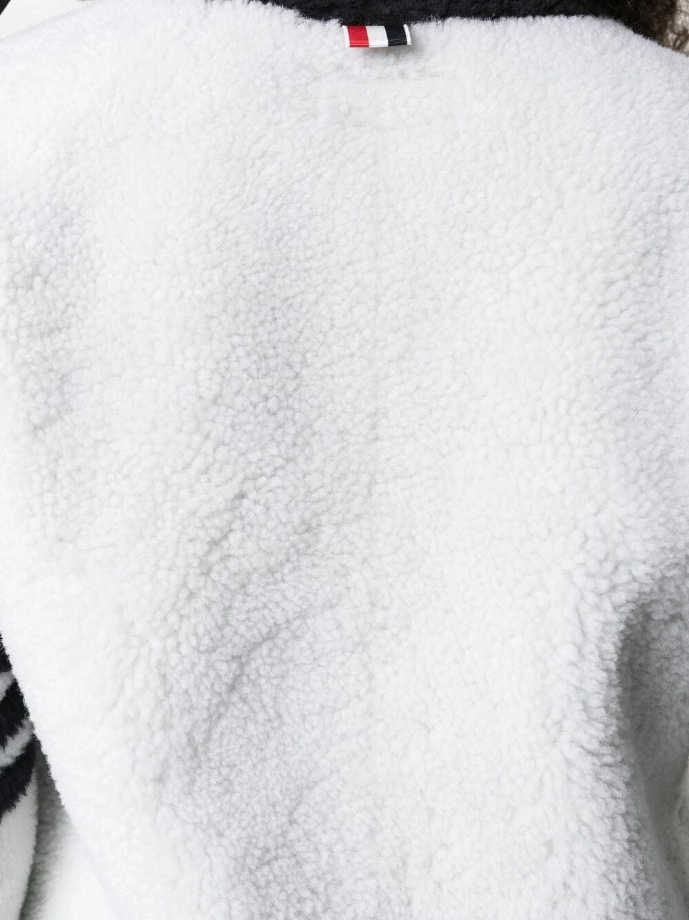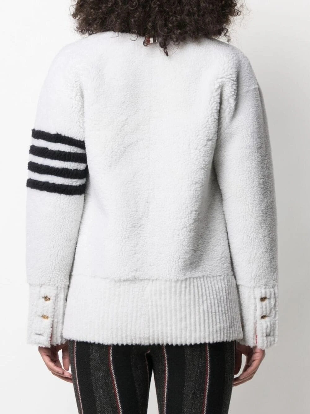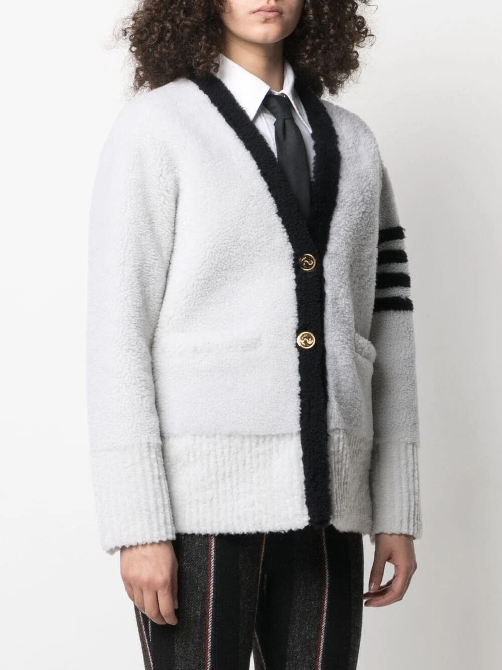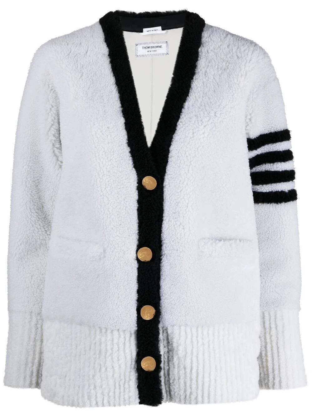 There’s no chance of you catching a chill wearing this 4-Bar stripe cardigan from Thom Browne. Thanks to its shearling construction, you’re guaranteed to stay warm and cosy all season long. Now you’re all set for the frosty days ahead.Β