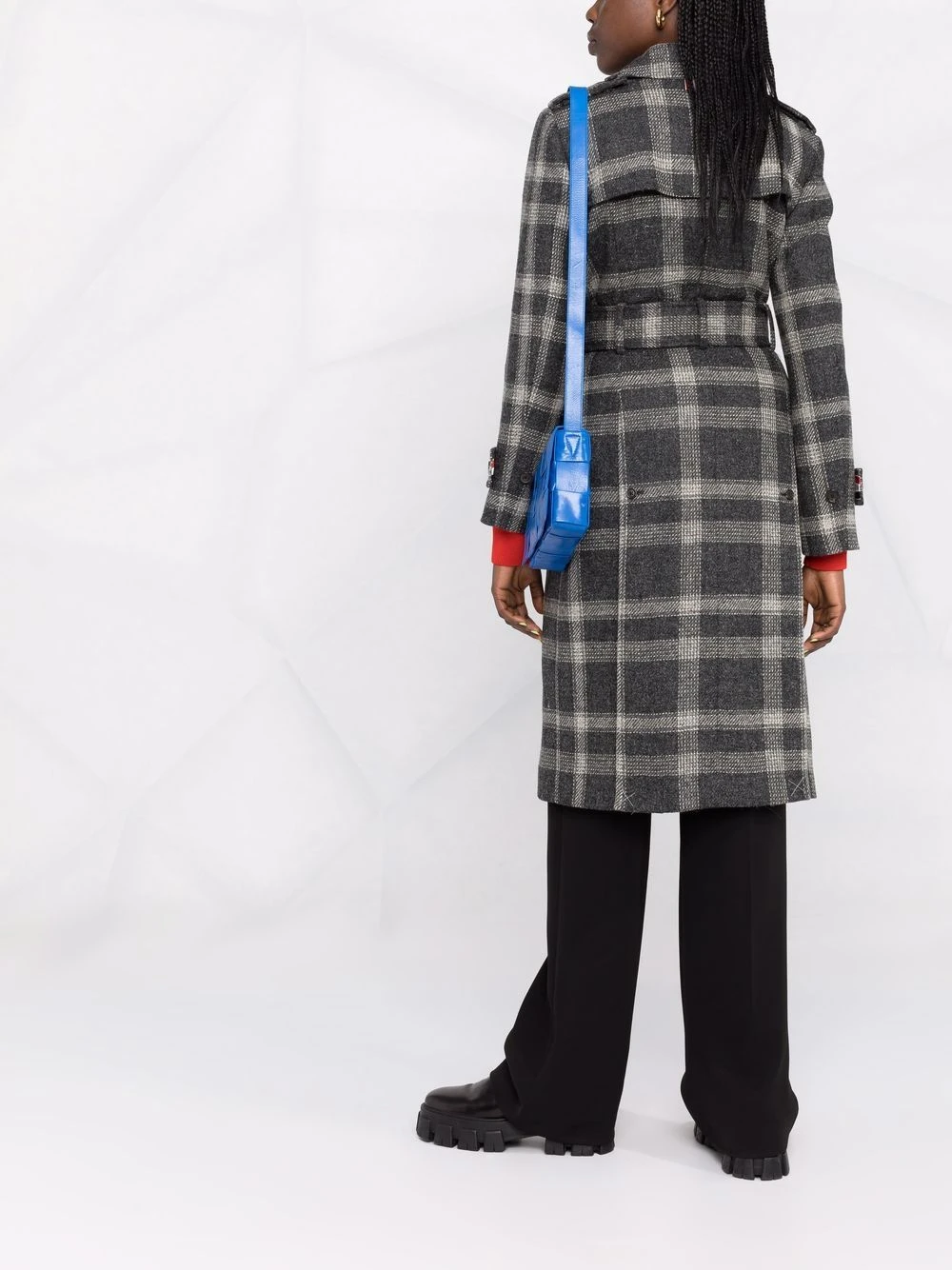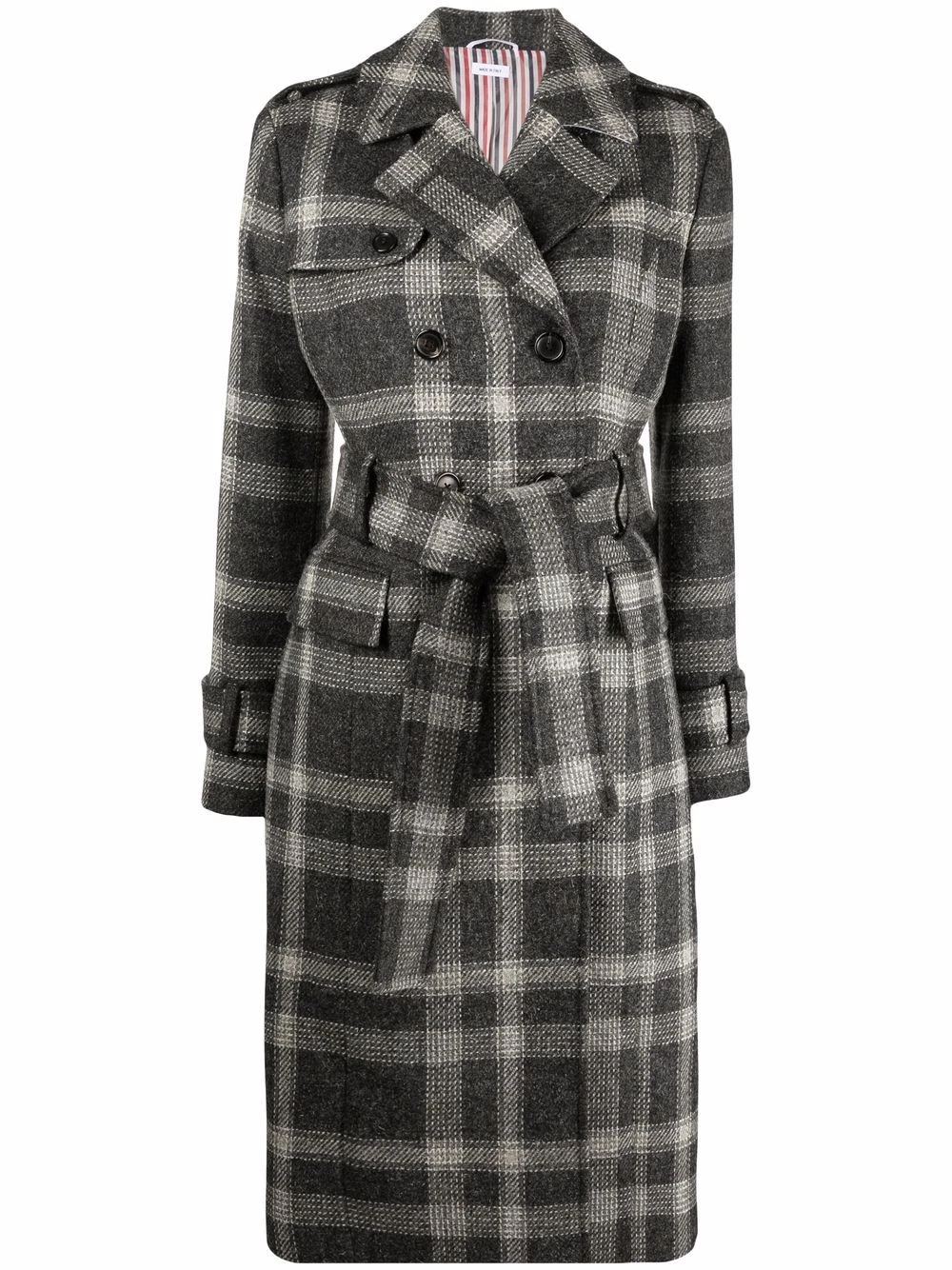Thom Browne takes traditional designs and turns them into something contemporary. Crafted from pure wool, this double-breasted coat features a plaid check pattern and is detailed with an elegant belted wist and storm flap for a classy yet modern look.Β