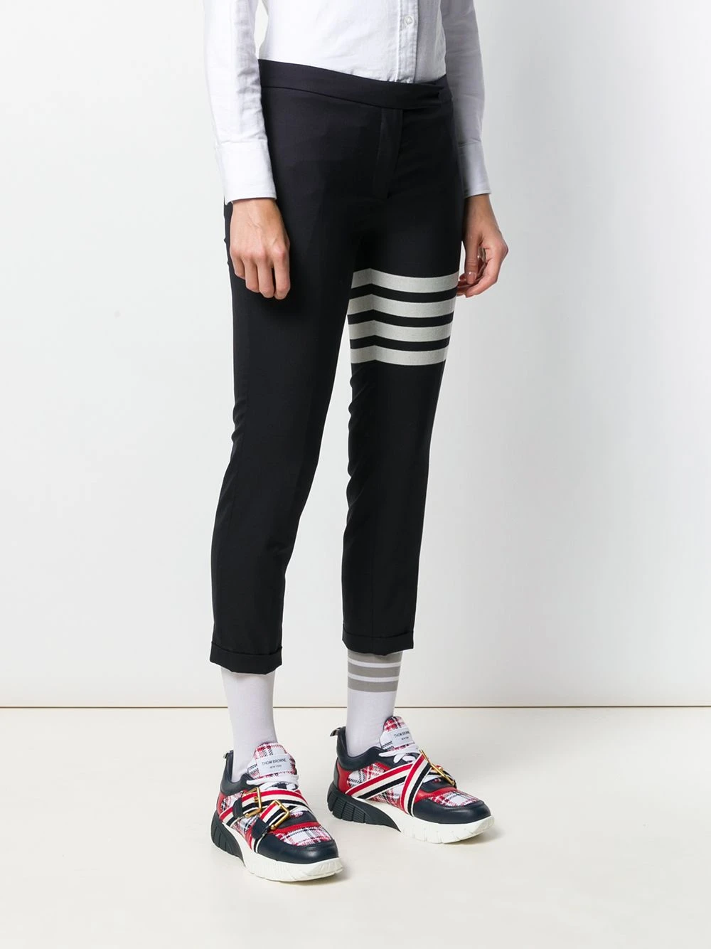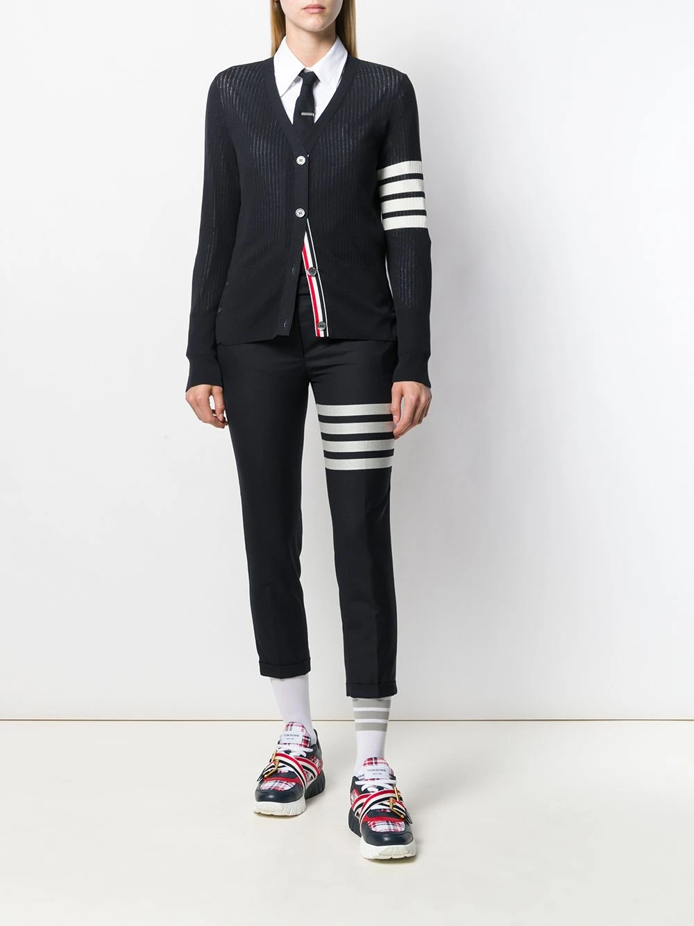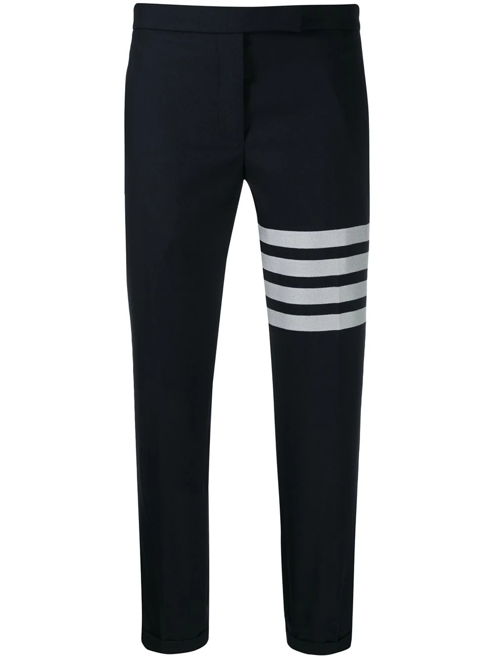 Look out for Thom Browne’s iconic 4-Bar stripe on these skinny cropped trousers. Crafted from navy and white tones, they combine classic details with a modern silhouette. Get the best of both worlds. Featuring two back buttoned welt pockets, a skinny fit, a cropped length, a signature grosgrain loop tab and a 4-Bar stripe.