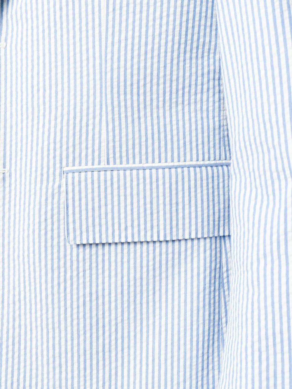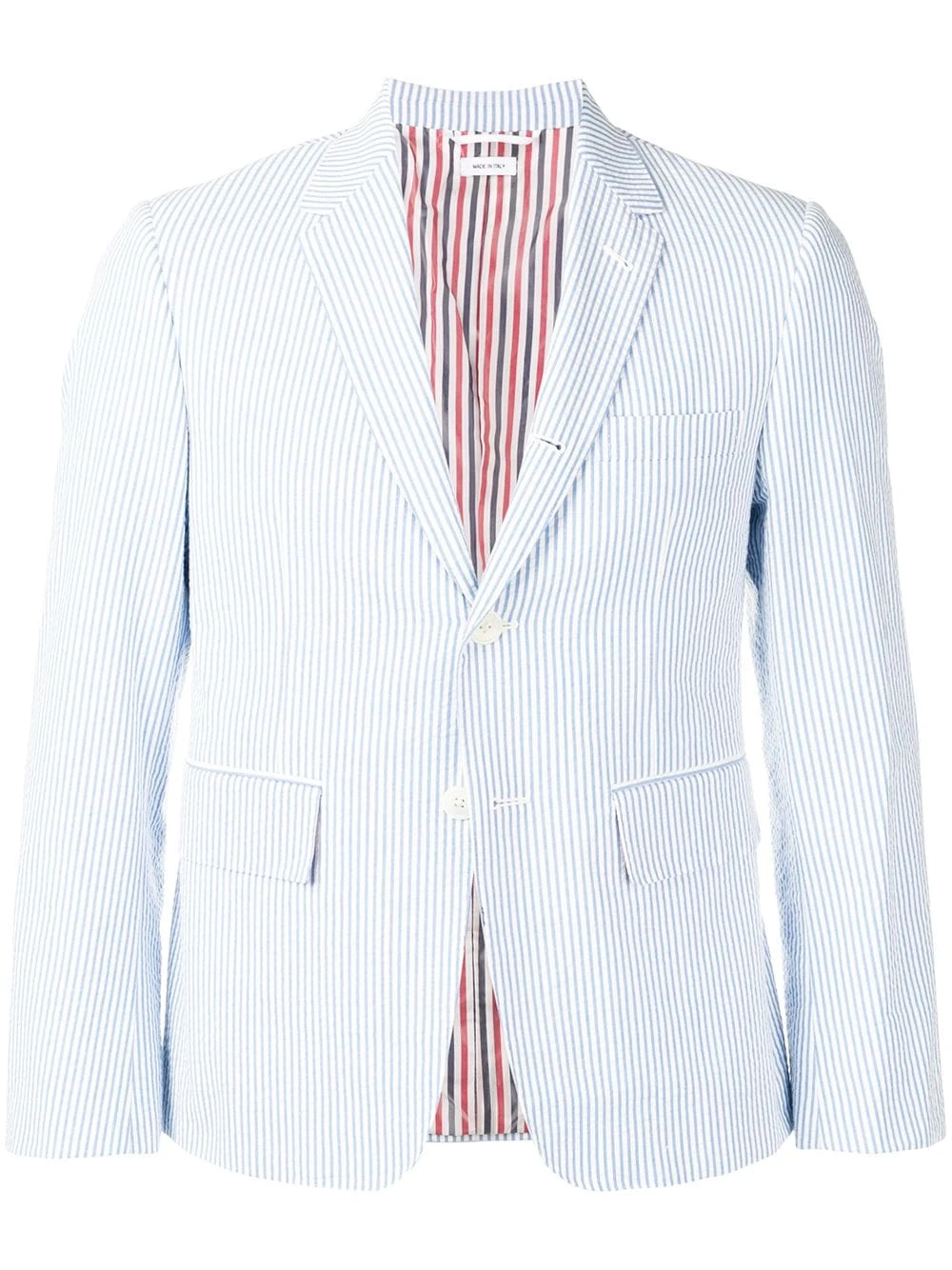 A lineup of investment pieces designed to withstand the test of time, Thom Browne’s Spring/Summer 2019 collection continues to blur the lines between refined tailoring and contemporary sportswear. Crafted from blue and white cotton, this seersucker sport coat features notched lapels, a front button fastening, long sleeves, button cuffs, a chest pocket, front flap pockets, a double vent to the rear, pinstripes, a fitted silhouette, a tricolour grosgrain tab on the rear and a signature striped lining.