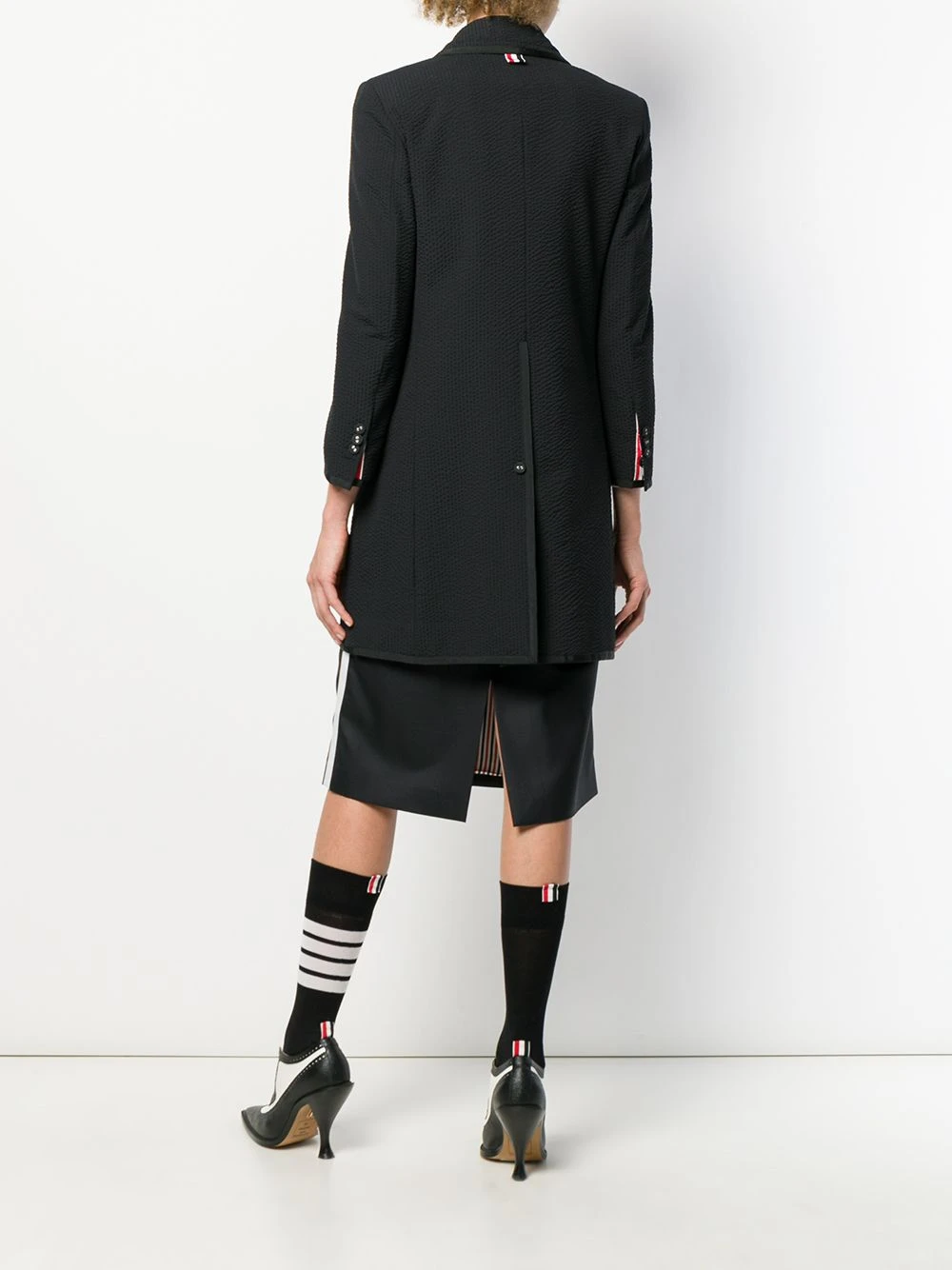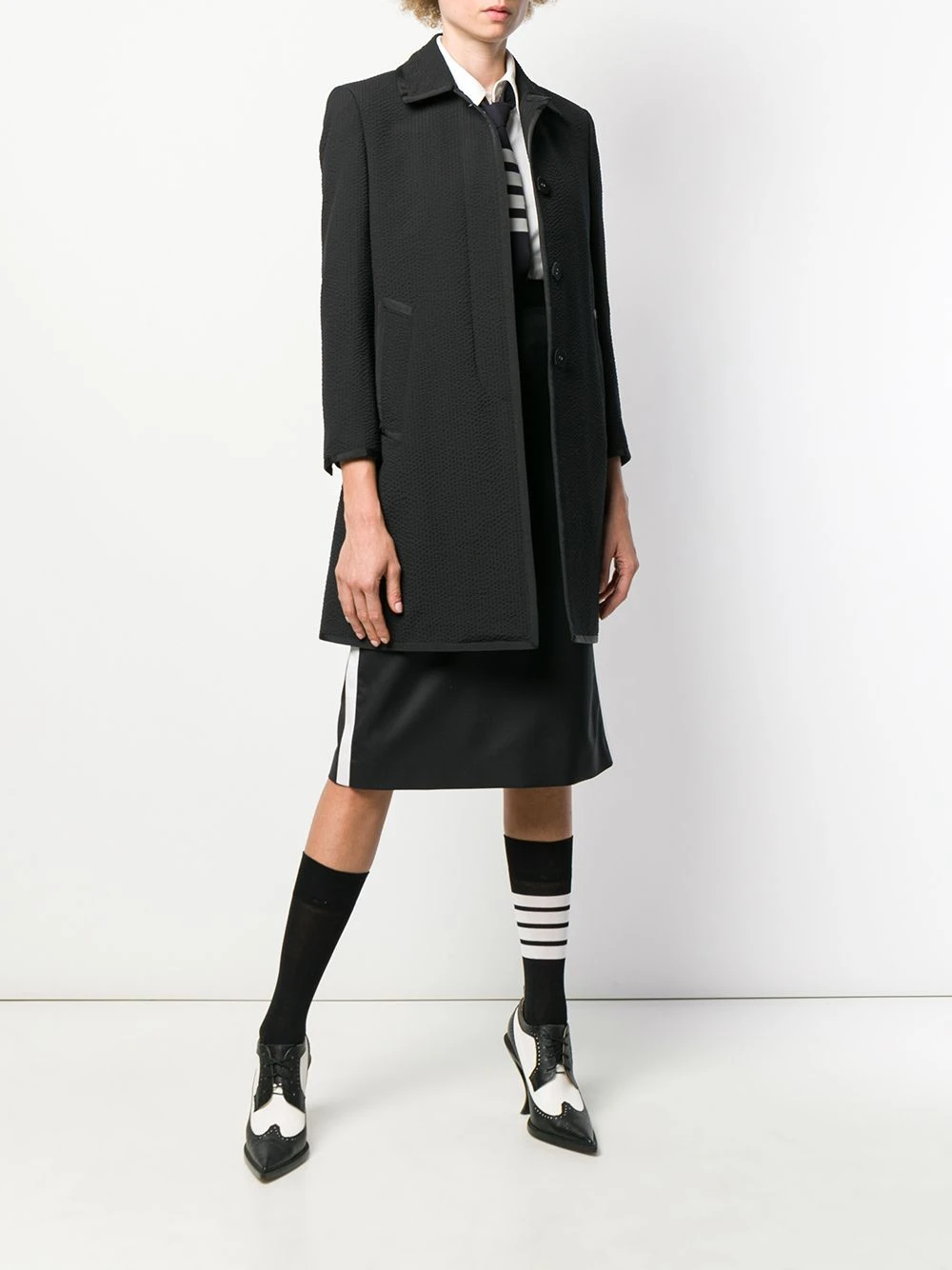 Imagine a life where looking good every time you leave the house is effortless. Then, pull on this seersucker Thom Browne wool overcoat and watch that dream come true. It’s like magic! Featuring a classic collar, a concealed front fastening, cropped sleeves, two front pockets, a rear central vent, a printed lining and a signature grosgrain loop tab.