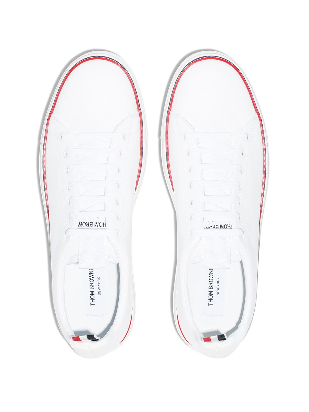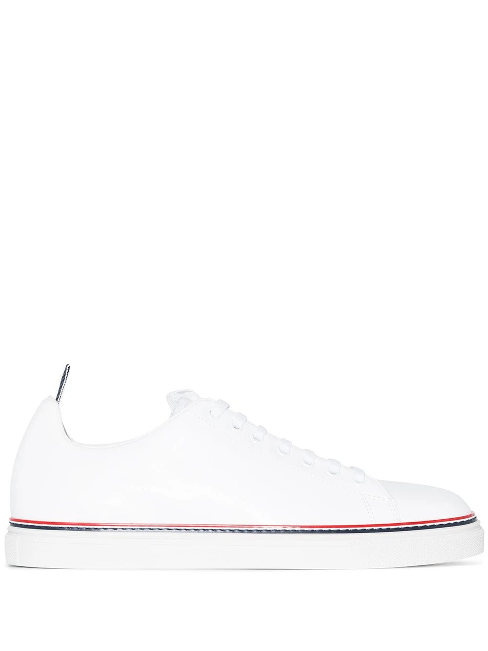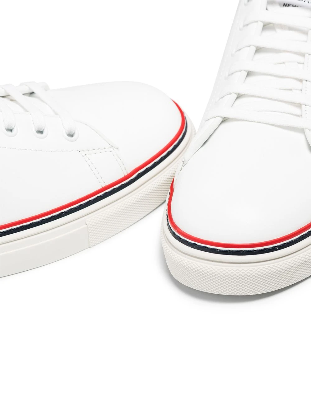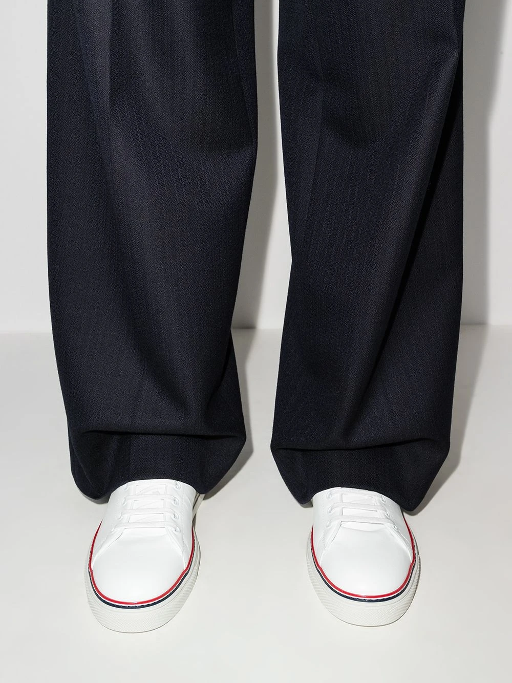 Thom Browne’s iteration of the classic white sneaker features a signature RWB tab at the heel and navy and red accents familiar with the brand’s aesthetic. Crafted in Italy from soft leather, they are finished with a round toe and sit atop a flat rubber sole.