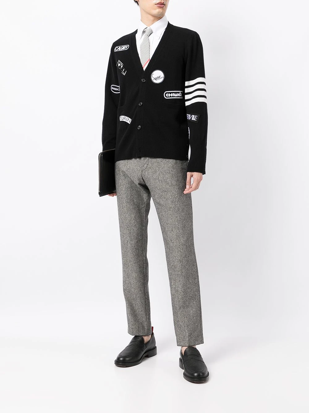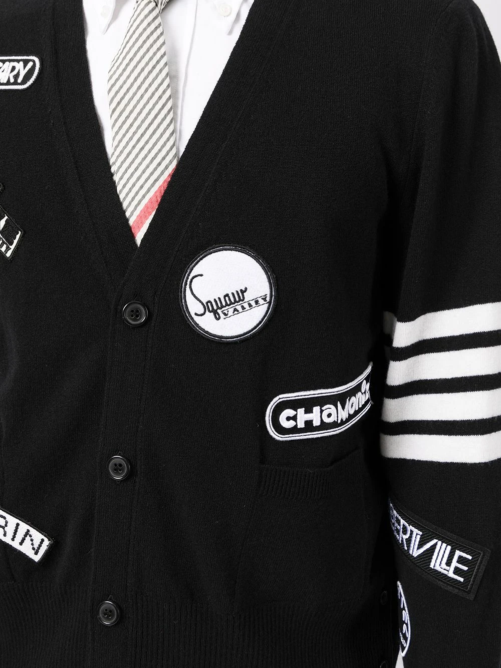 Mirroring the clean lines and signature house codes of the American brand, this merino-wool cardigan is decorated with embroidered patches, while Thom Browne’s 4-Bar stripe brings fashion knowledge to the scene.