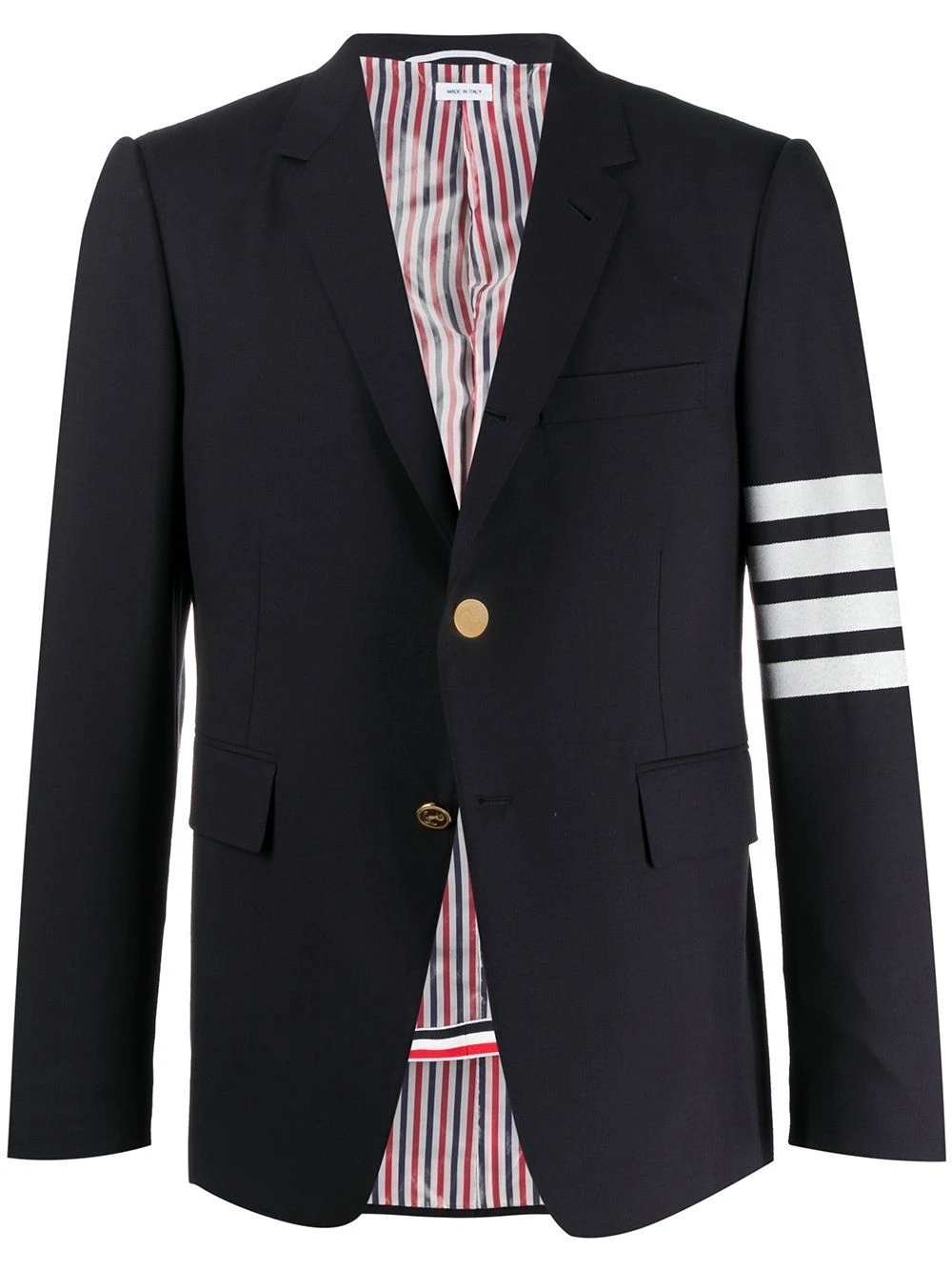 Looking to smarten up your everyday? Thom Browne’s 4-Bar wool sport coat could be just what you need. Fabricated in Italy from navy blue wool, it’s cut to the label’s signature shrunken fit. Featuring notched lapels, a front button fastening, a front button fastening, gold-tone hardware, a chest pocket, front flap pockets, long sleeves, button cuffs, a signature tri-colour striped trim, tri-stripe lining and a rear tri-stripe logo tab.