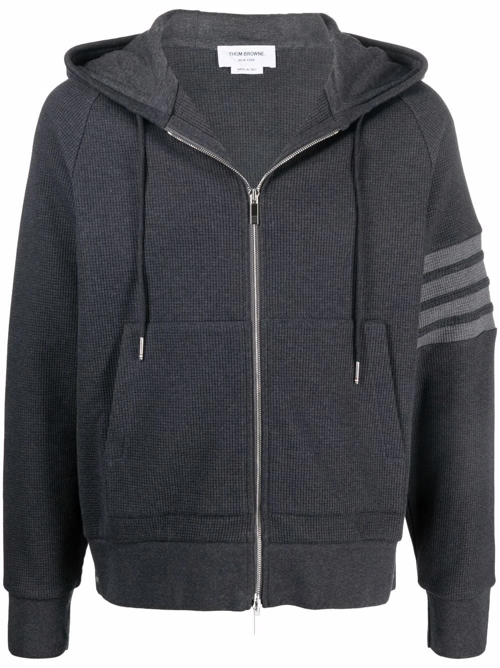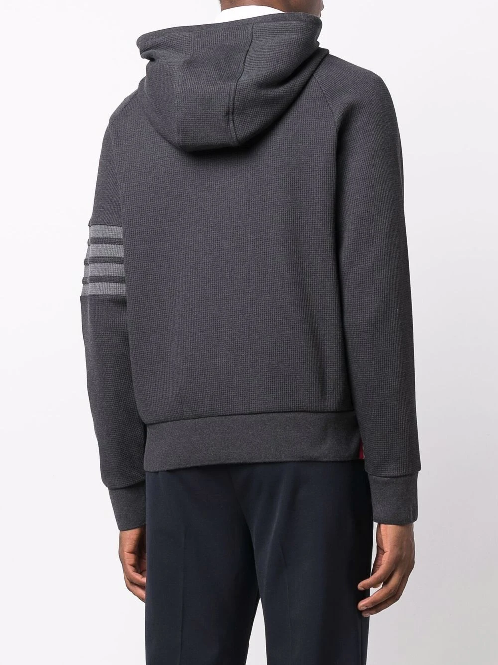 Produced in a waffle fabrication, this charcoal grey Thom Browne cotton hoodie features the brand’s signature 4-Bar stripe detailing to the sleeve.Β