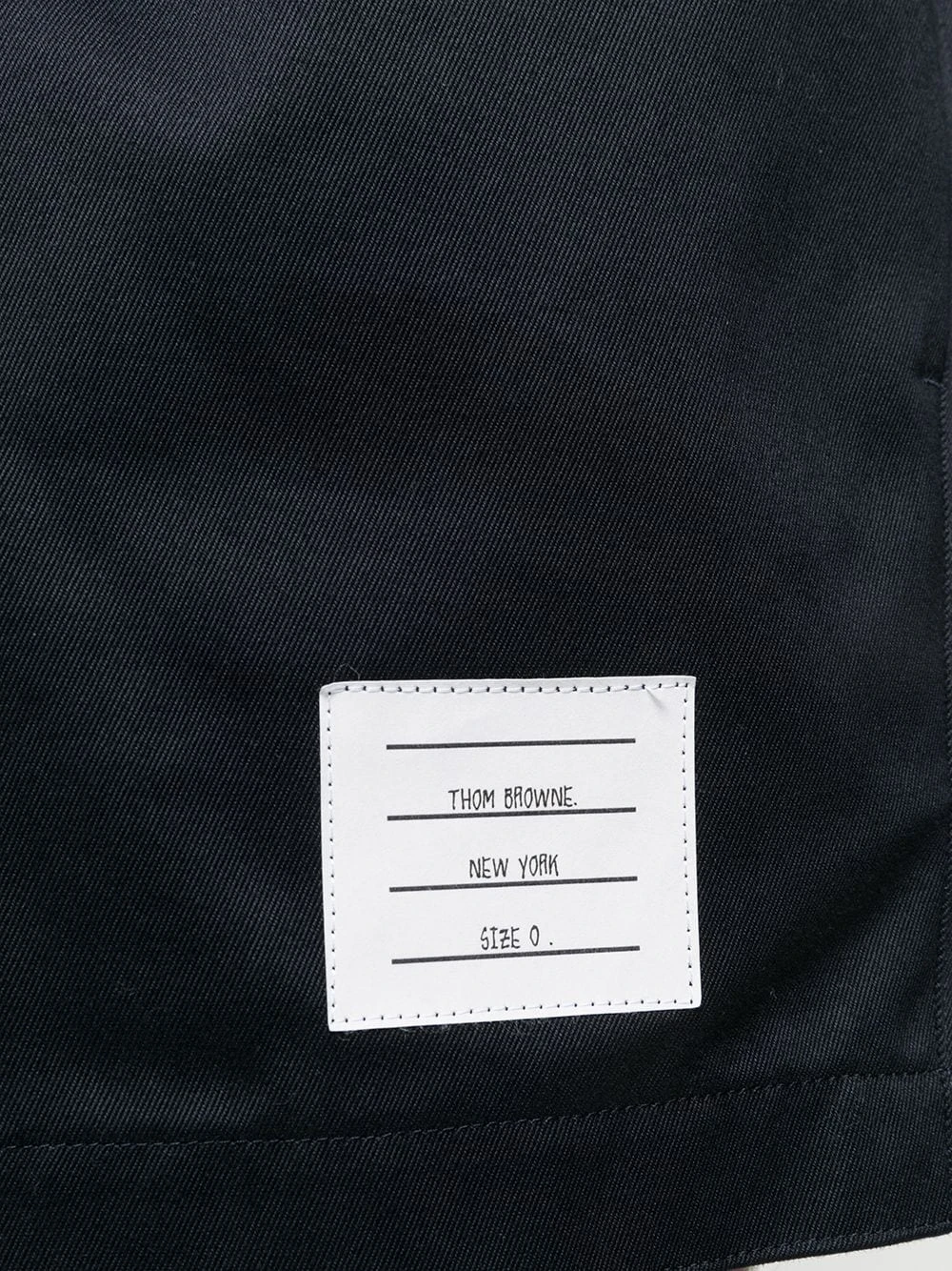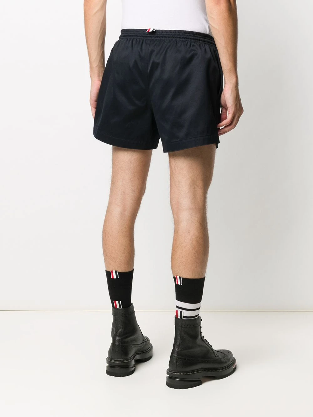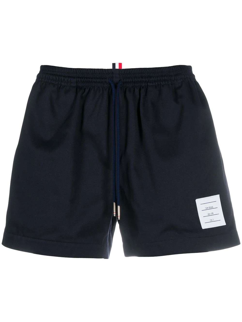 Bridge your sport and leisurewear with a pair of these navy blue cotton twill rugby shorts from THOM BROWNE. Dedicated to long-lasting comfort and style, the shorts feature the label’s signature tri-colour striped logo tab to the rear. You and these shorts? Talk about dream team. Featuring an elasticated waistband with a drawstring fastening, a front logo plaque, tonal stitching and rear tri-colour striped logo tab.