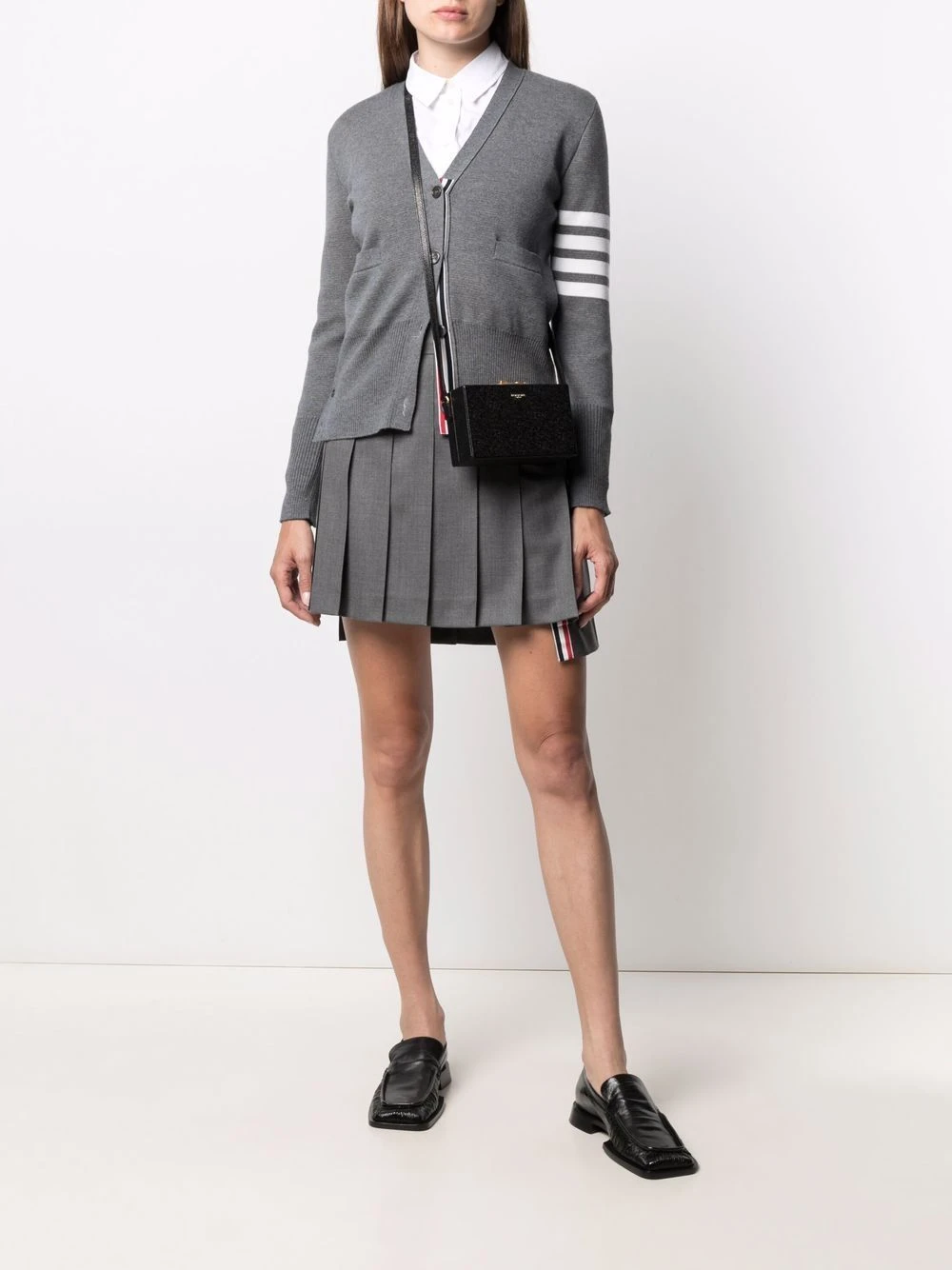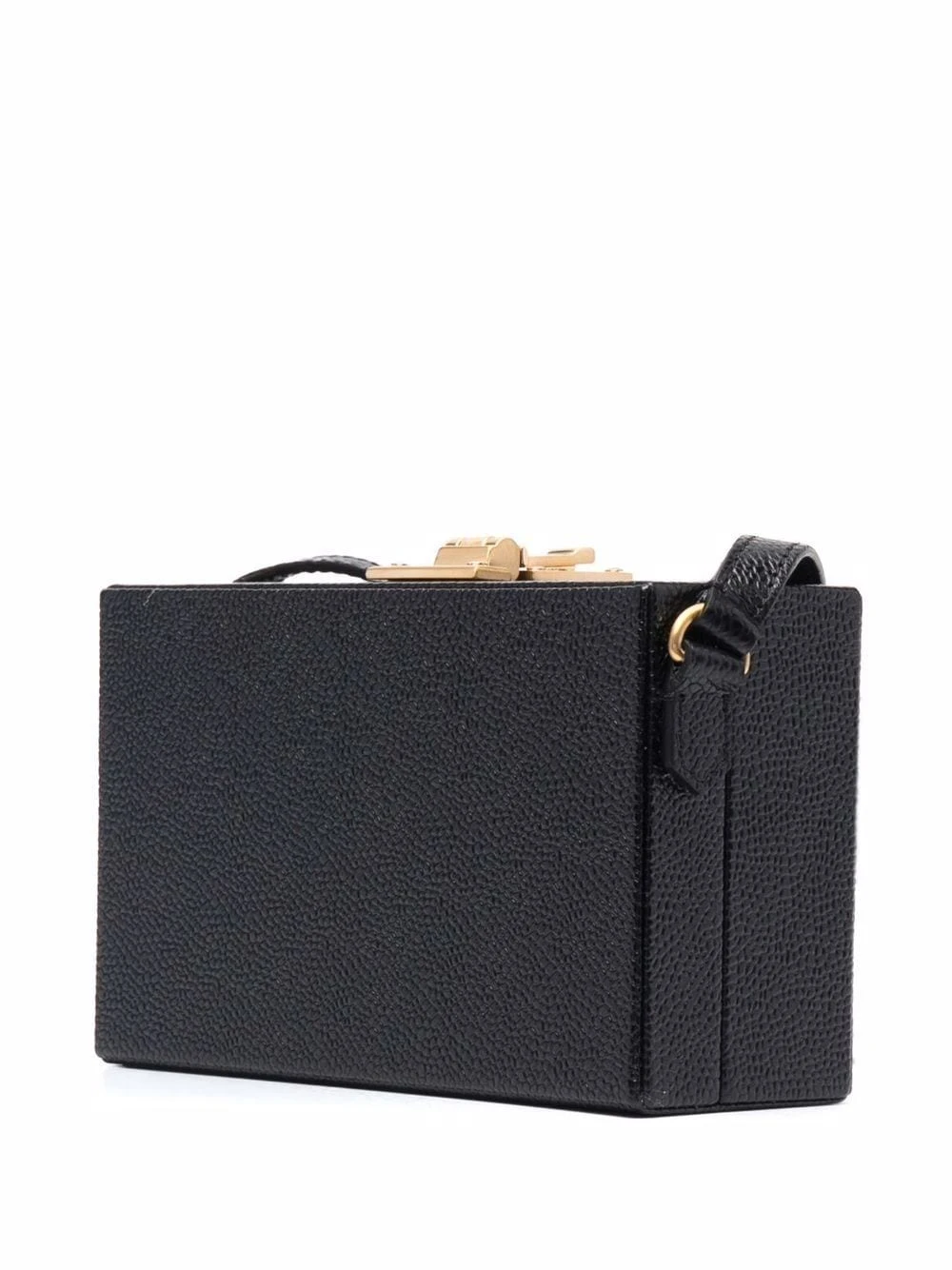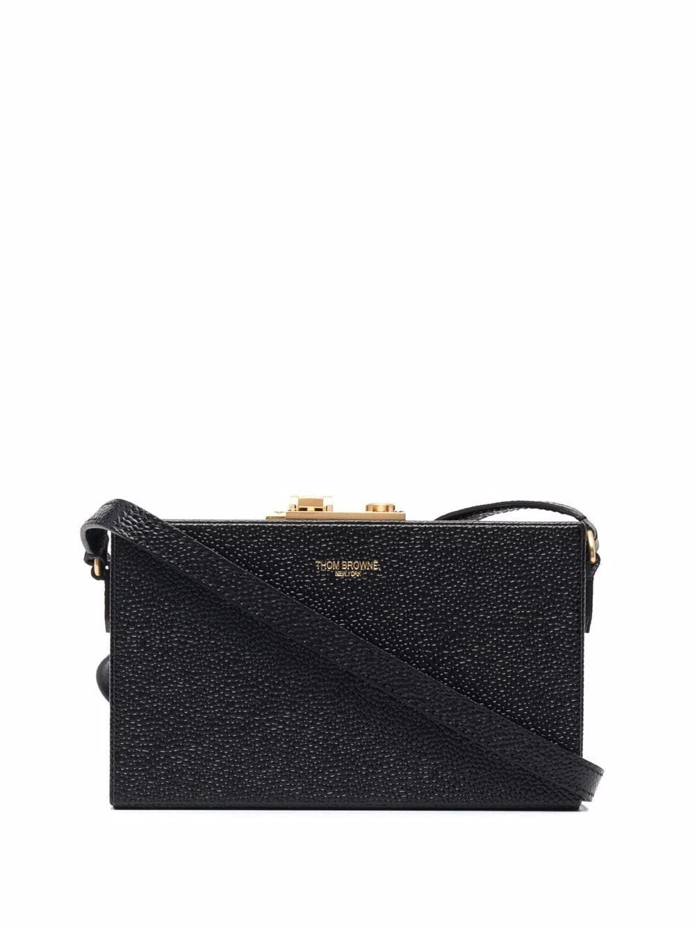 Black leather front logo crossbody bag from THOM BROWNE featuring pebbled texture, adjustable shoulder strap, gold-tone hardware, push-lock fastening, internal patch pocket and internal logo patch.