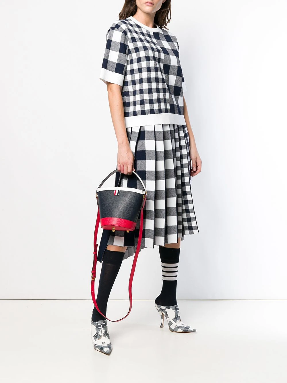 Since its launch in 2003, Thom Browne’s namesake label has gained notoriety for its clean designs and use of luxury materials. This blue, red and white leather RWB Pebble Grain Sand Bucket Bag from Thom Browne features a top handle, an adjustable shoulder strap, gold-tone hardware, purse feet, an open top design, an internal logo plaque, a clip fastening, an internal zipped pocket, a tri-stripe grosgrain logo tab and a striped lining.