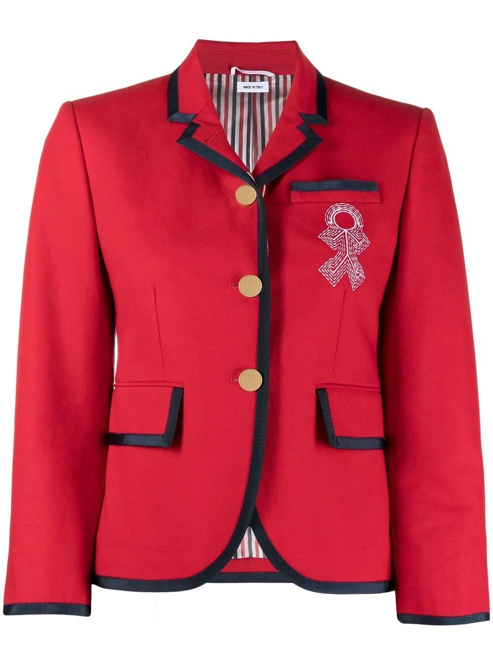 Thom Browne class is in session. Serve preppy refined charm with this grosgrain trim blazer jacket that’s designed with a short length and cropped sleeves that will certainly gain you some stylish marks. You’ll pass the year with flying colours (which of course is red, white and blue).