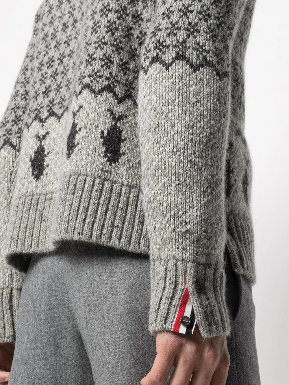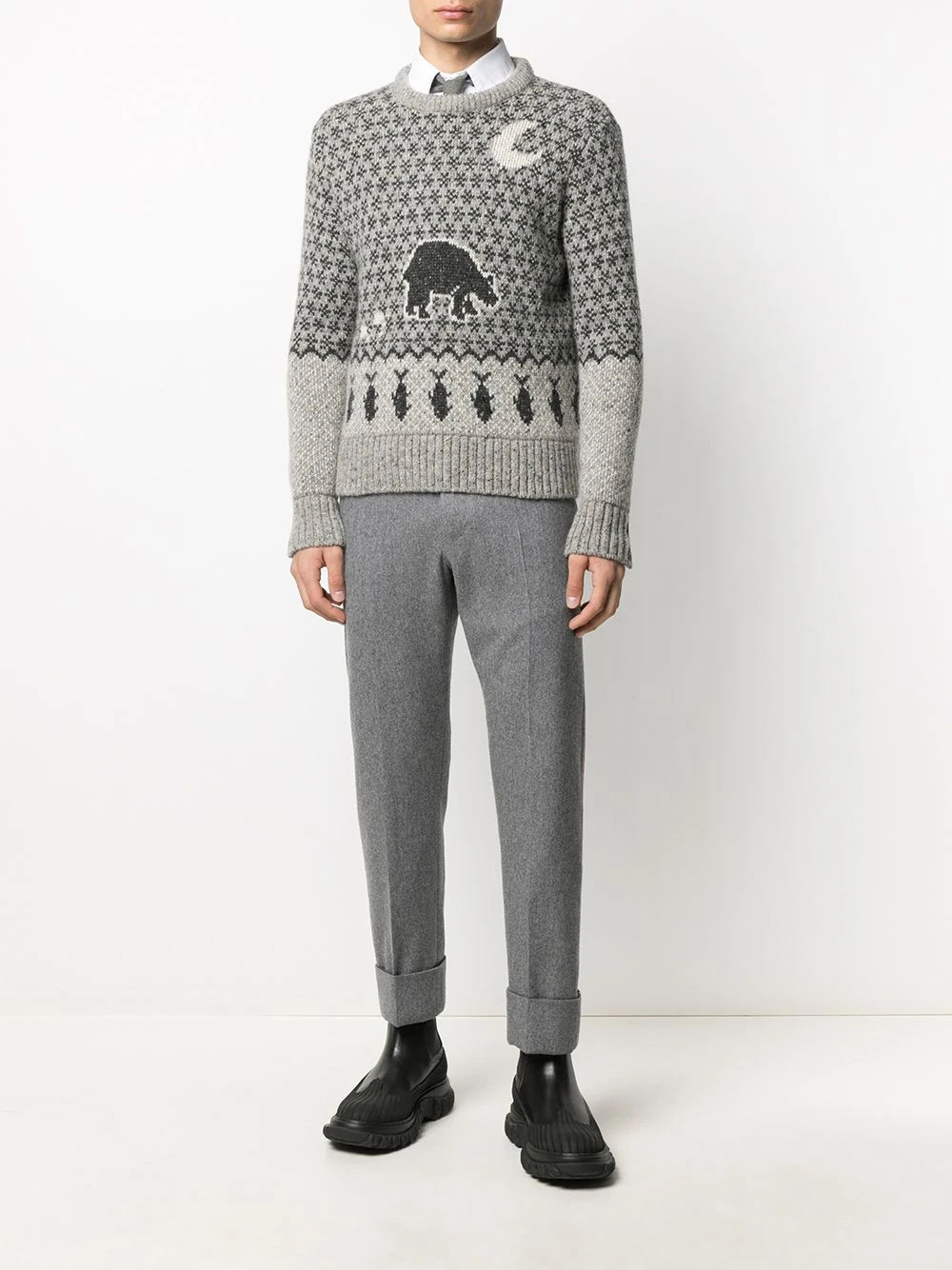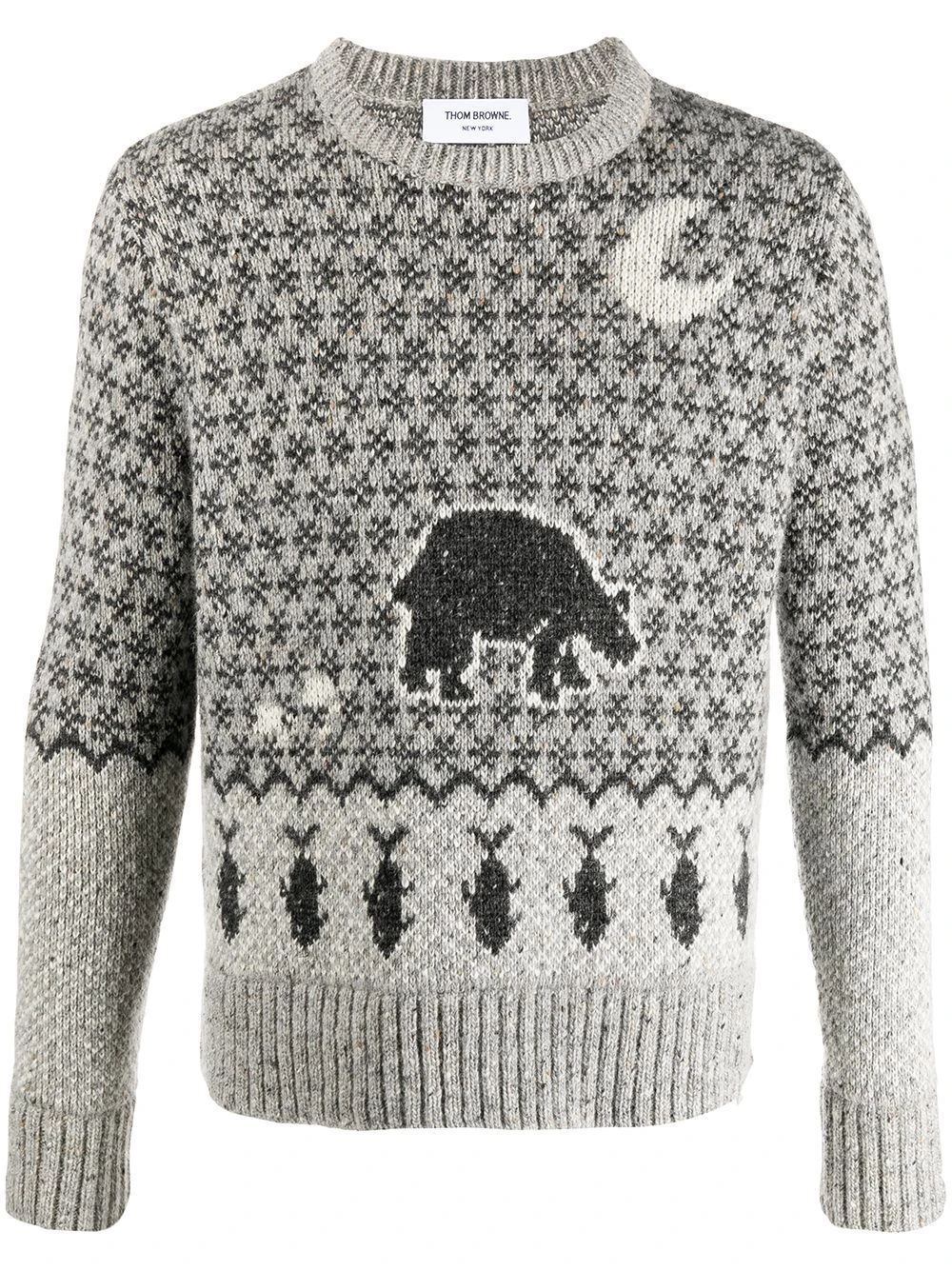 Ready to wrap up? Then let us introduce you to this jumper from Thom Browne; in a medium grey hue and an intarsia knit design, this piece is sure to keep you layered up and looking good throughout the weather event that is everyday life. What’s ‘knit’ to love?