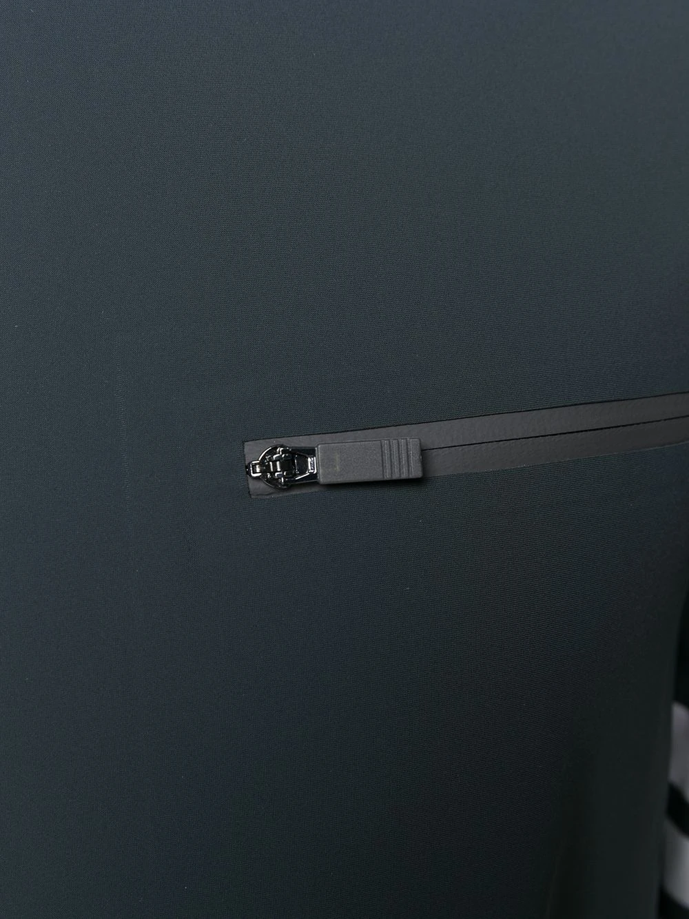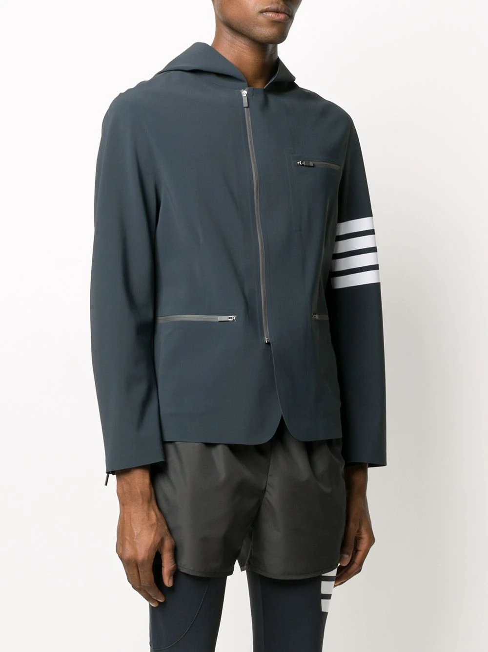 Hitting the gym in style was never so easy with this lightweight tech hooded 4-Bar jacket from Thom Browne. Now you don’t have any excuses to stay home (well you have, but ugly clothes are not one)! Featuring a hood, a front zip fastening, long sleeves, a zipped chest pocket, front zipped pockets, a lightweight construction and a 4-bar stripe detail to the sleeve.